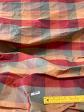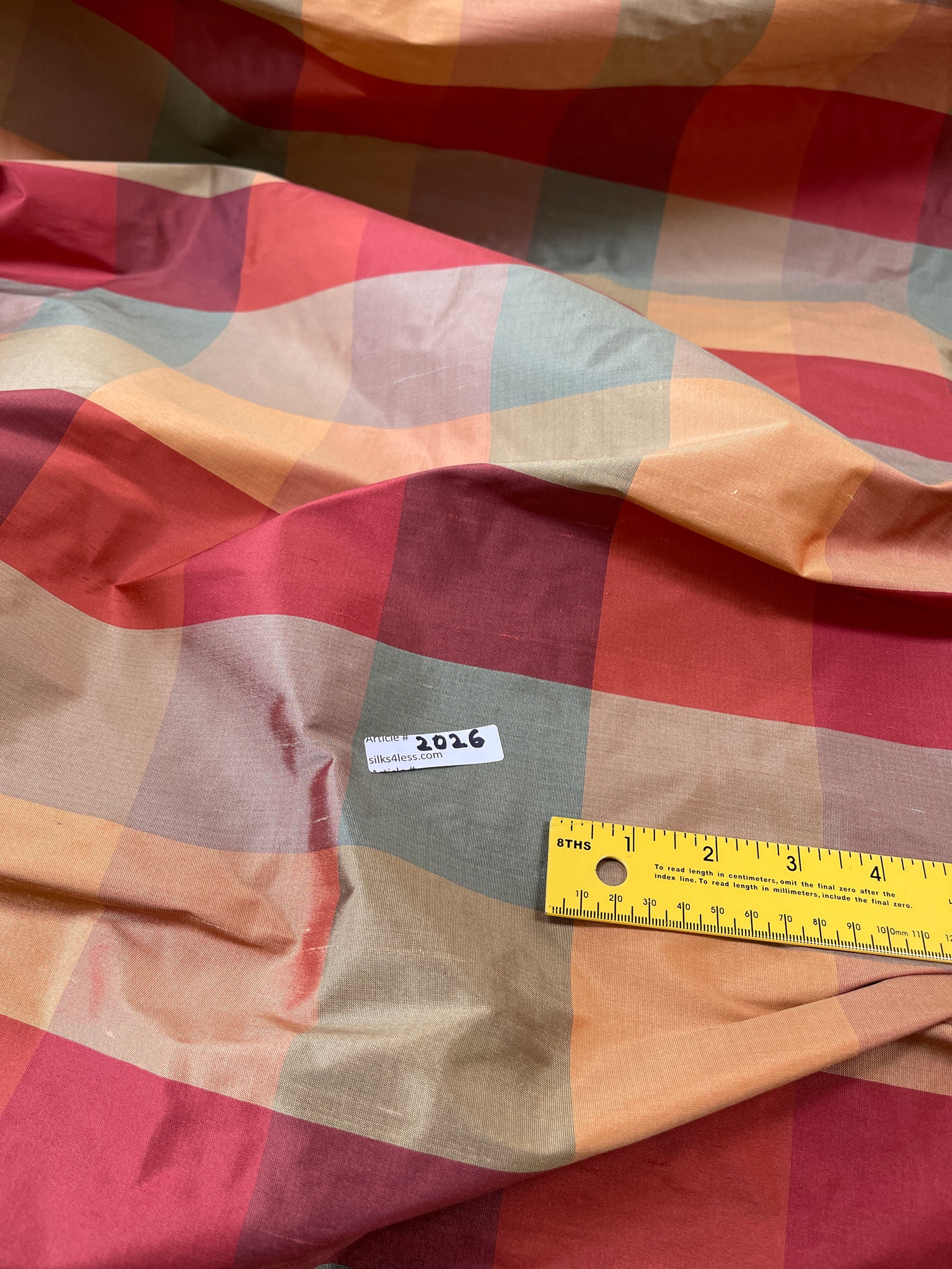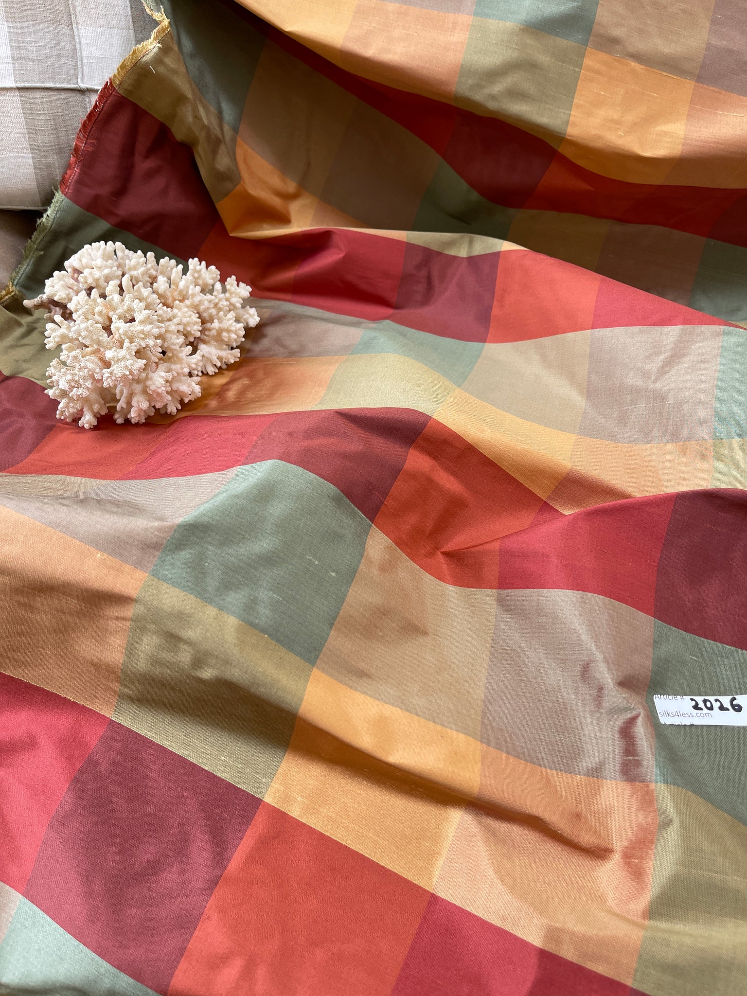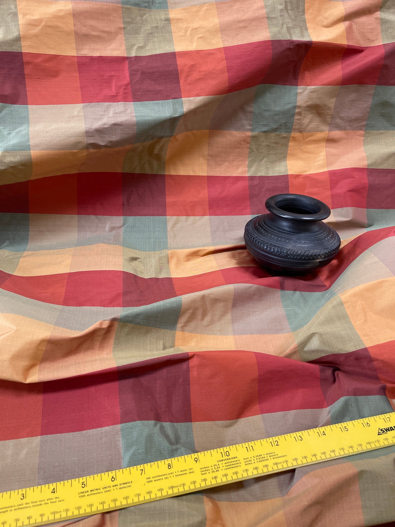 Great feel and body to this high end silk plaid, medium weight. gorgeous silk plaid, iridescent Gold/Green, Brick Red, Tropical Nut, Peach and Aqua, approximate check size 3" x 3'", approximate repeat 9".