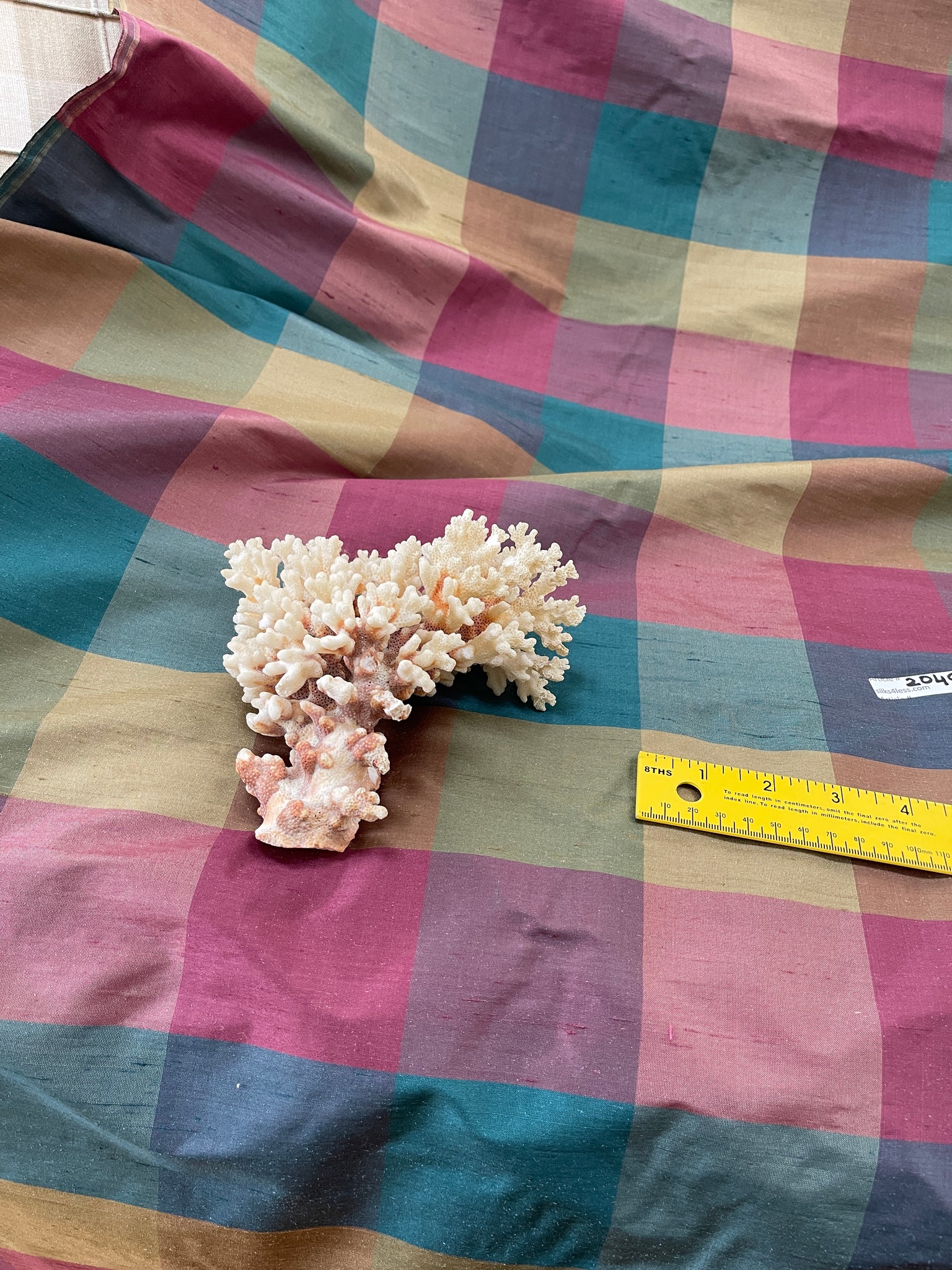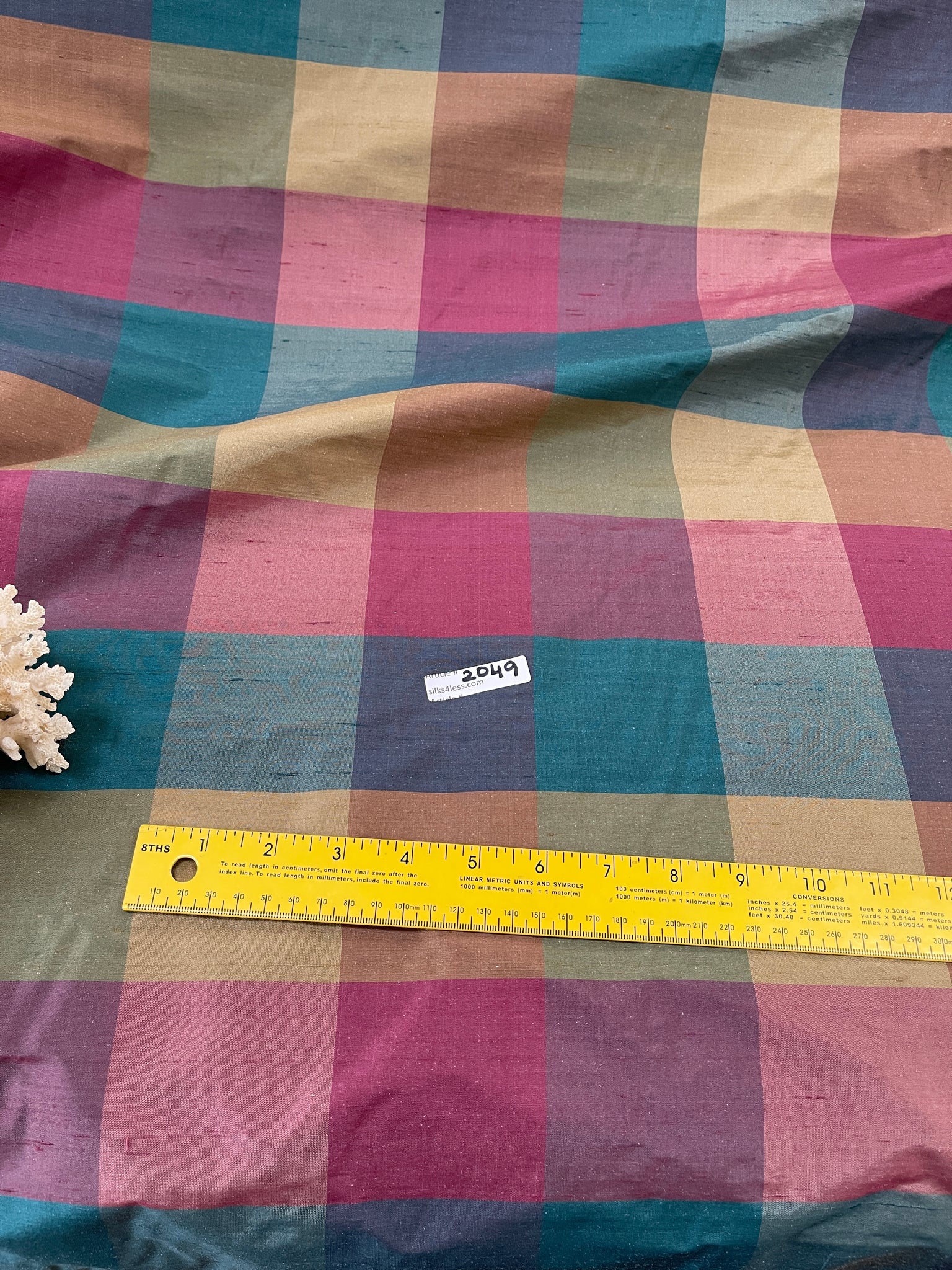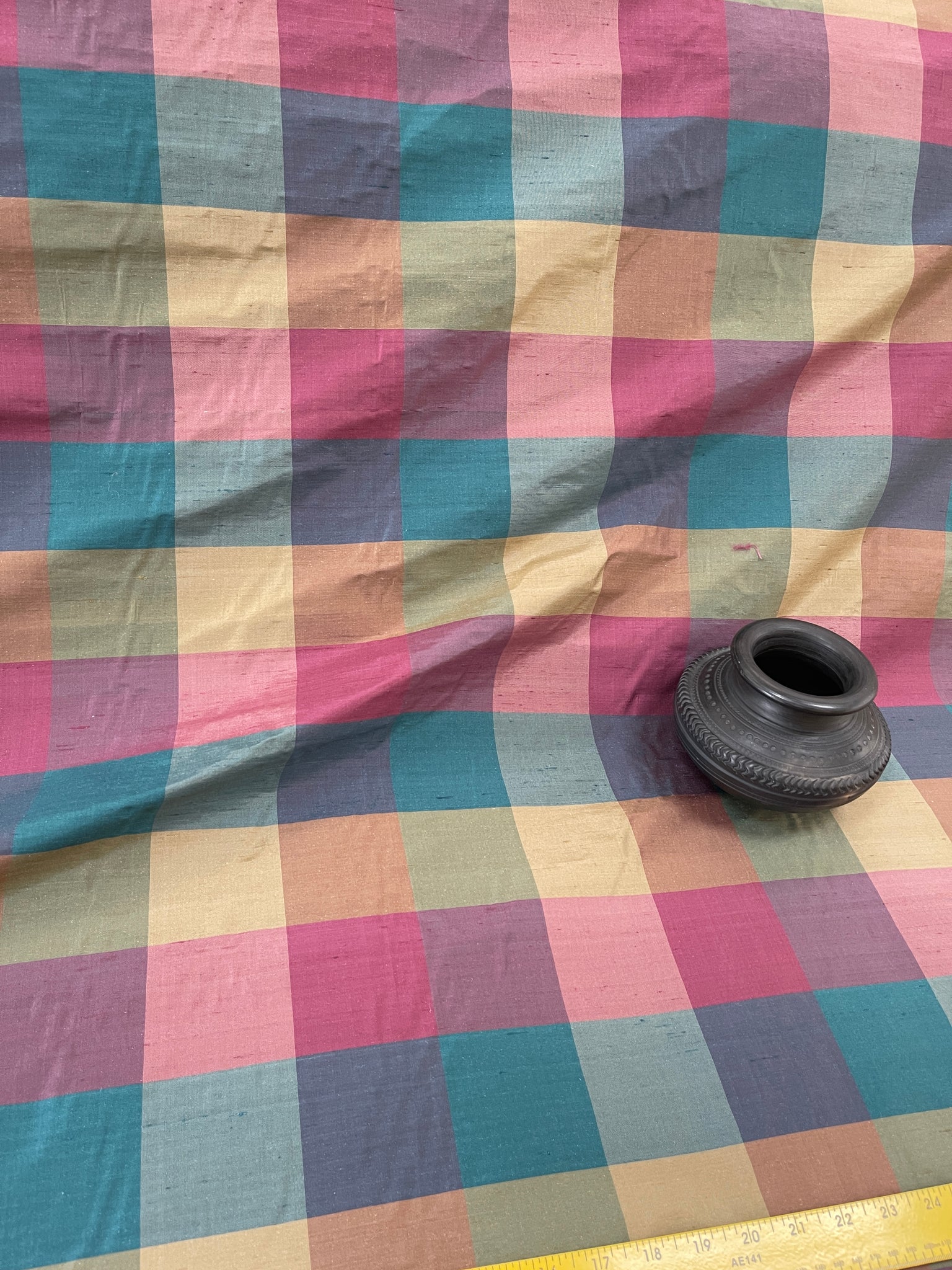 Great feel and body to this high end silk plaid, medium weight, colors Olive Gold, Turquoise and Wine. Approximate check size 3”X3” and repeat 9”.