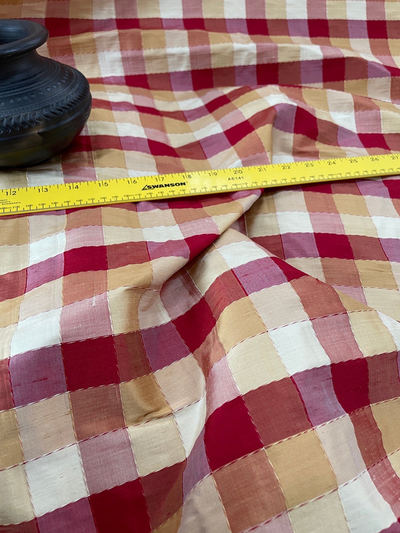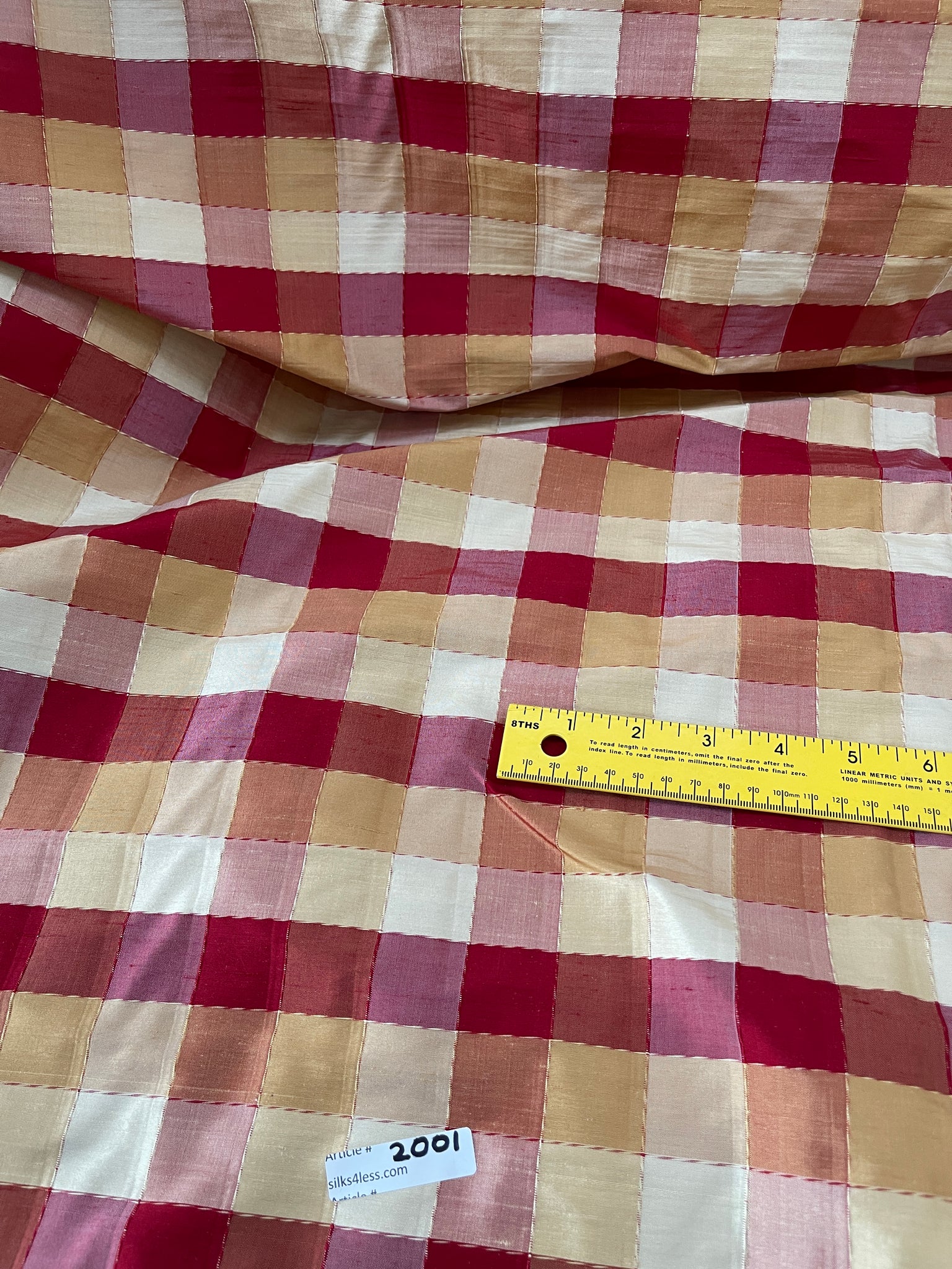 Designer quality Silk Shantung plaid in Reds, Ivory and Golds. check size 1/1" x 1.1" and approximate repeat 3.3", unique Silk plaid with raised cord.