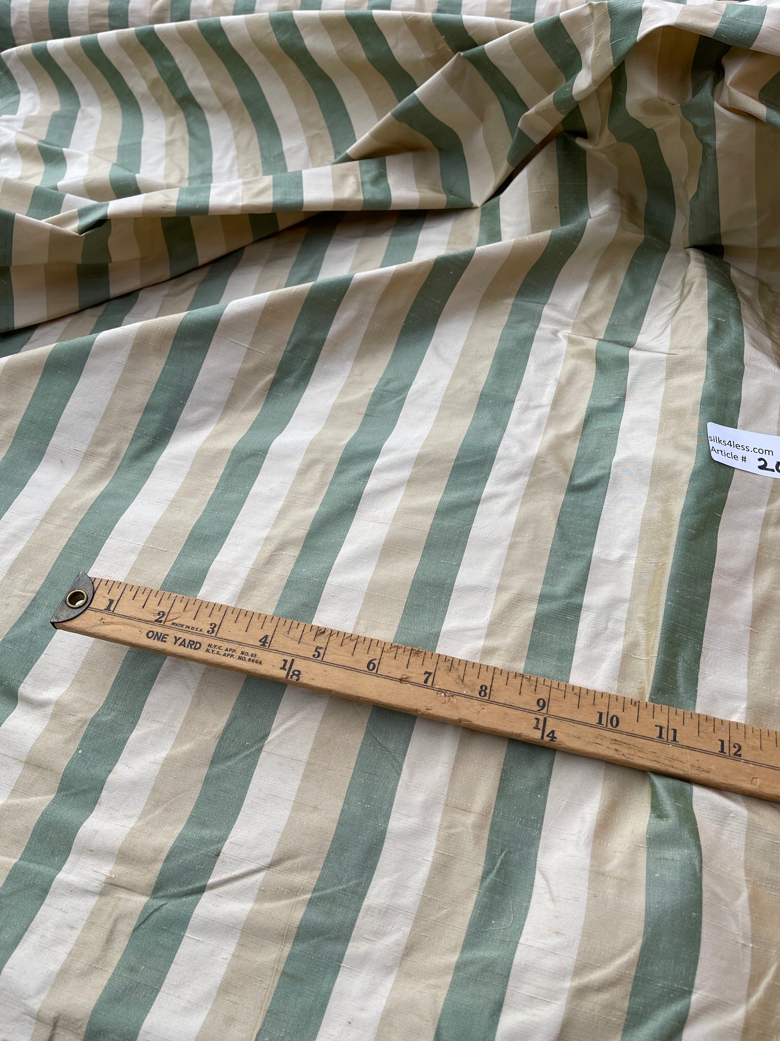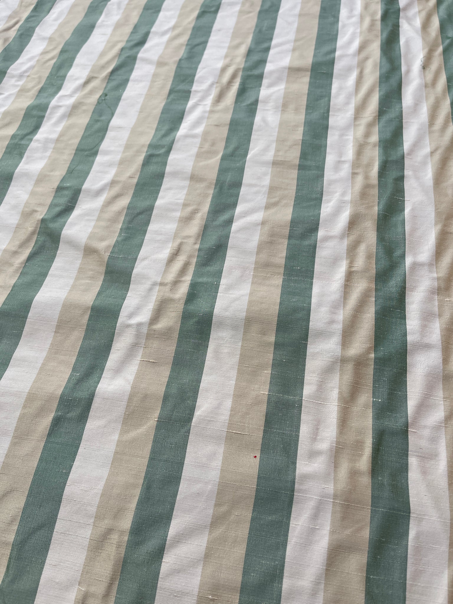 Designer quality and great body to this high end silk stripes, Ivory/Off White/Green combination, approximate stripe size 1” and repeat 3’. Stripes run up the roll, heavier quality Shantung stripes.
