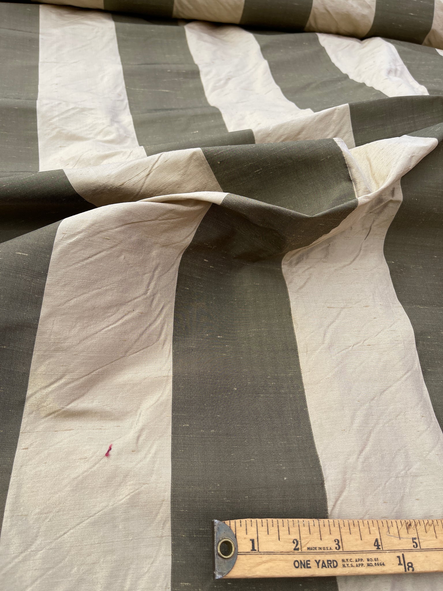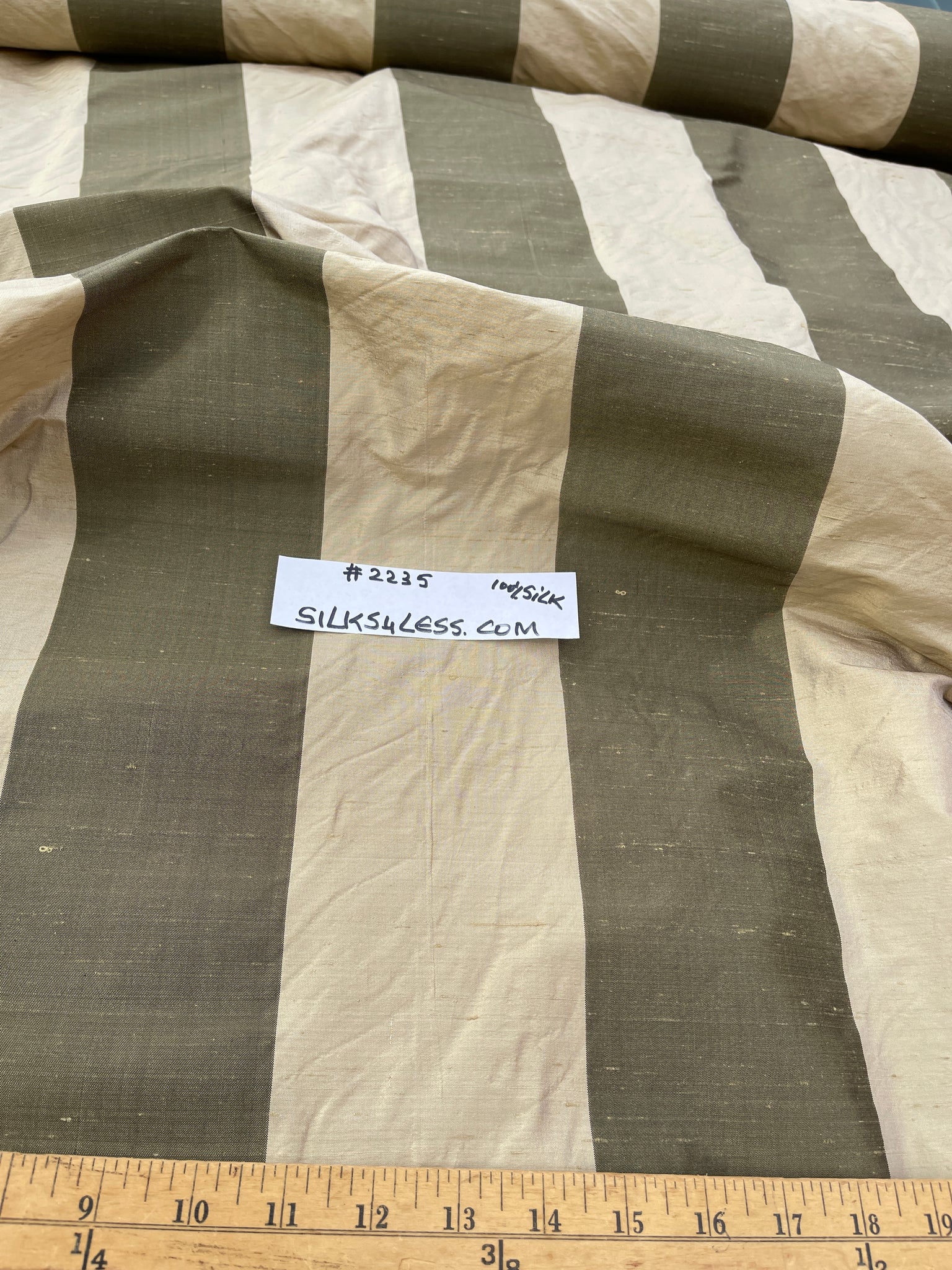 Fabulous high quality silk shantung taffeta stripes in Champagne/Bronze combination. Approximate stripe size 4” and repeat 8”, stripes run up the roll. Silk taffeta yarns in the warp and silk shantung yarns in the weft. Great quality product