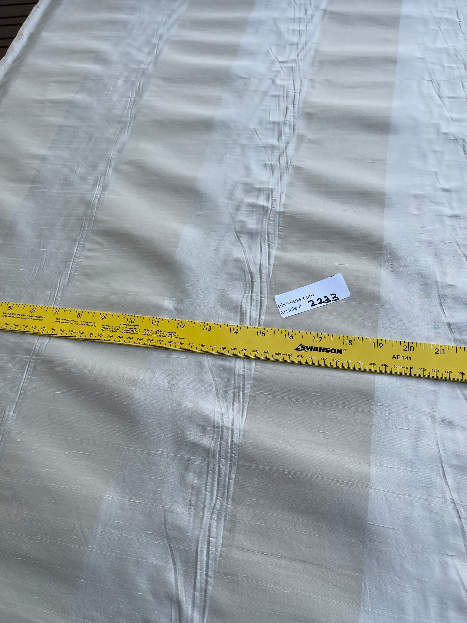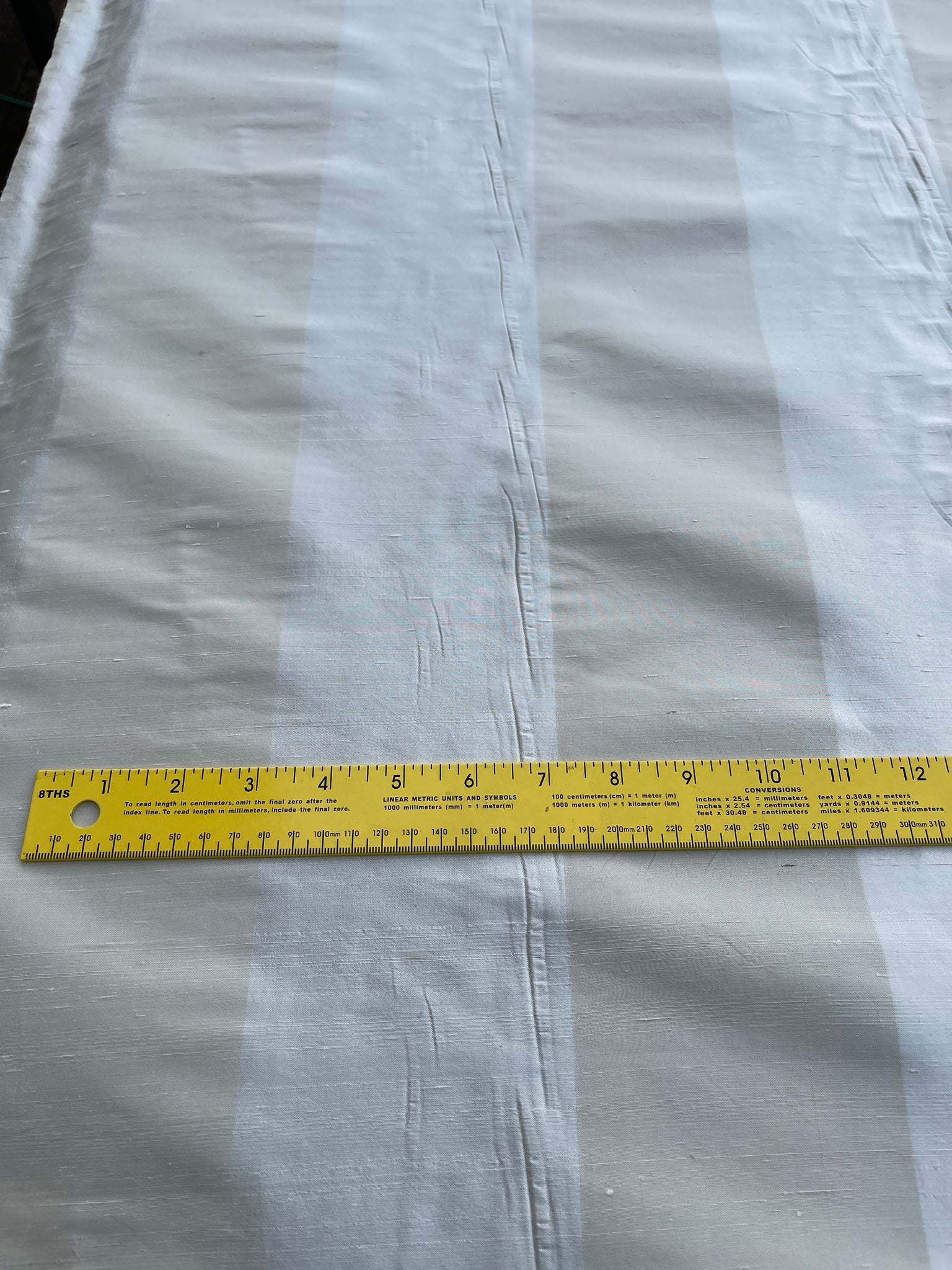Fabulous high quality silk shantung taffeta stripes in Ivory/Oyster combination. Approximate stripe size 4” and repeat 8”, stripes run up the roll. Silk taffeta yarns in the warp and silk shantung yarns in the weft. Great quality product