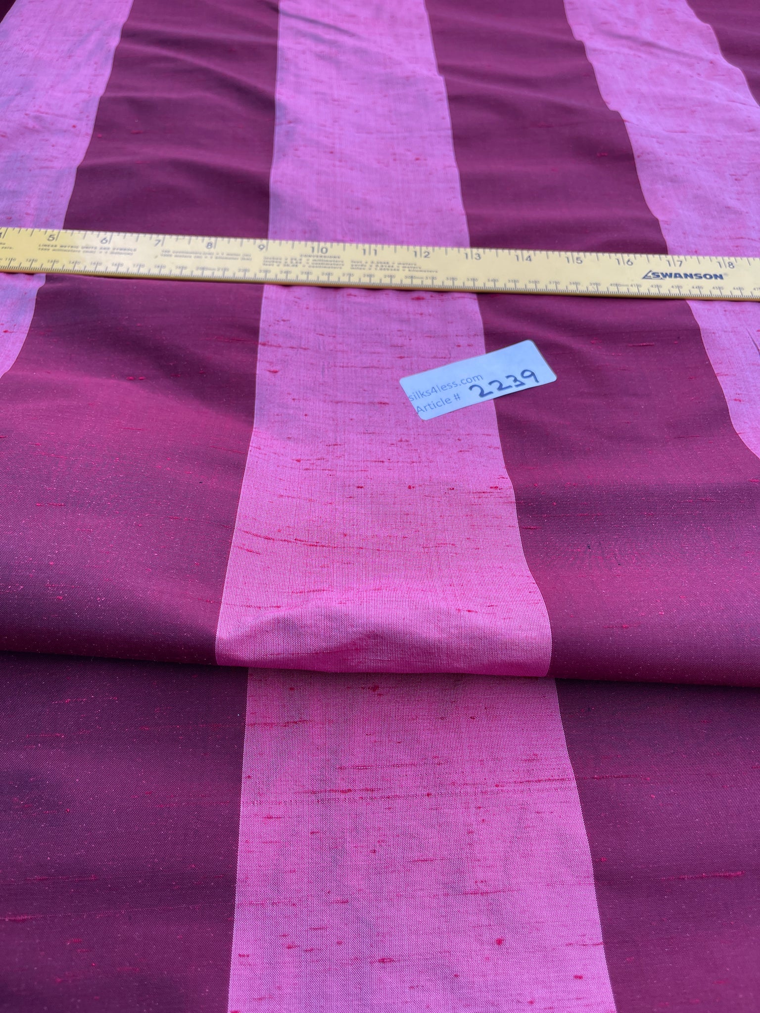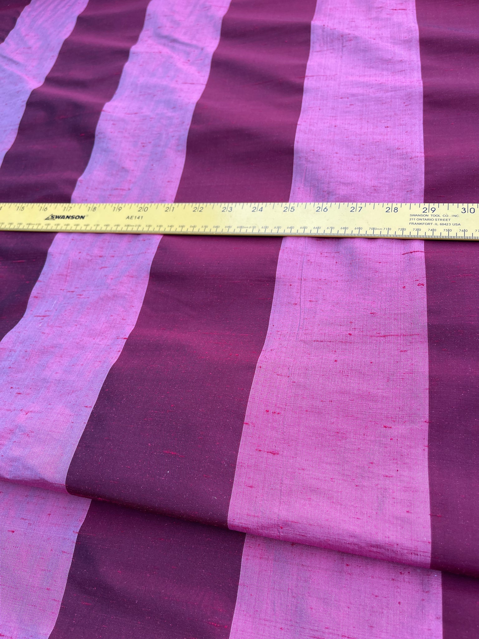 Fabulous high quality silk shantung taffeta stripes in Sherry/Rose combination. Approximate stripe size 4” and repeat 8”, stripes run up the roll. Silk taffeta yarns in the warp and silk shantung yarns in the weft. Great quality product