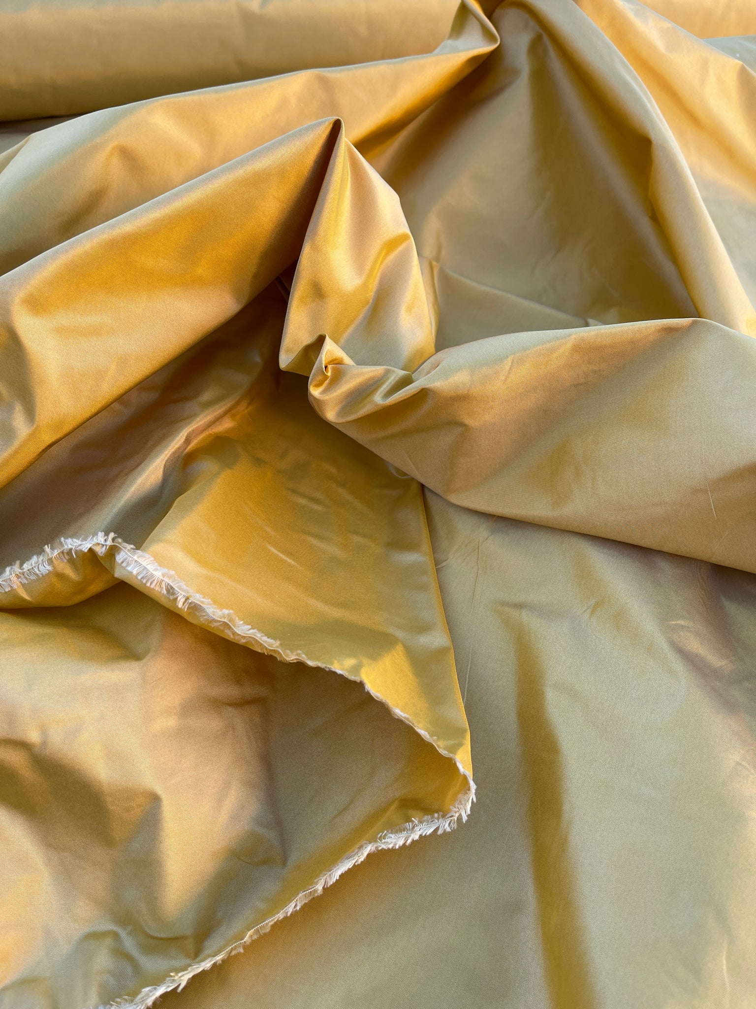 Exquisite quality iridescent silk taffeta is a combination of gorgeous Gold shade yarns in the warp and Olive Golden Yellow color yarns in the weft, crisp & great body.
