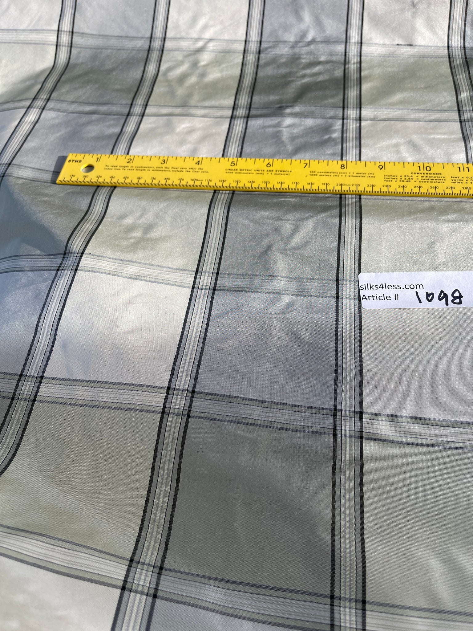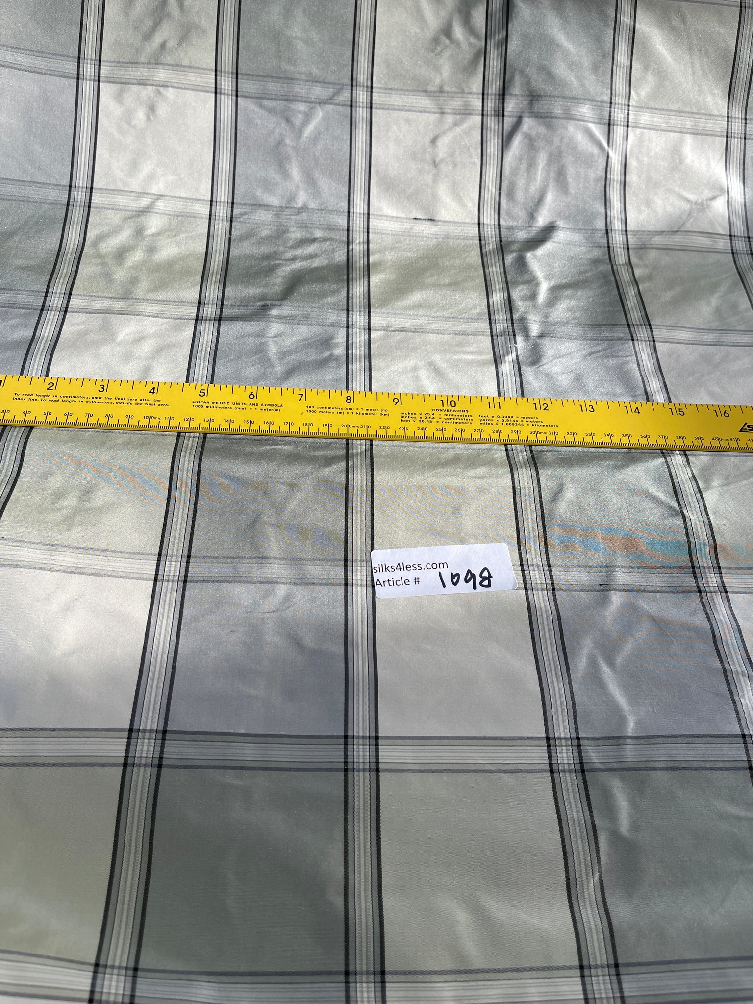 Great body to this silk taffeta plaid, colors Greens, Off White, Pewter and Grey shades, approximate check size 3"x3. 54-55”.