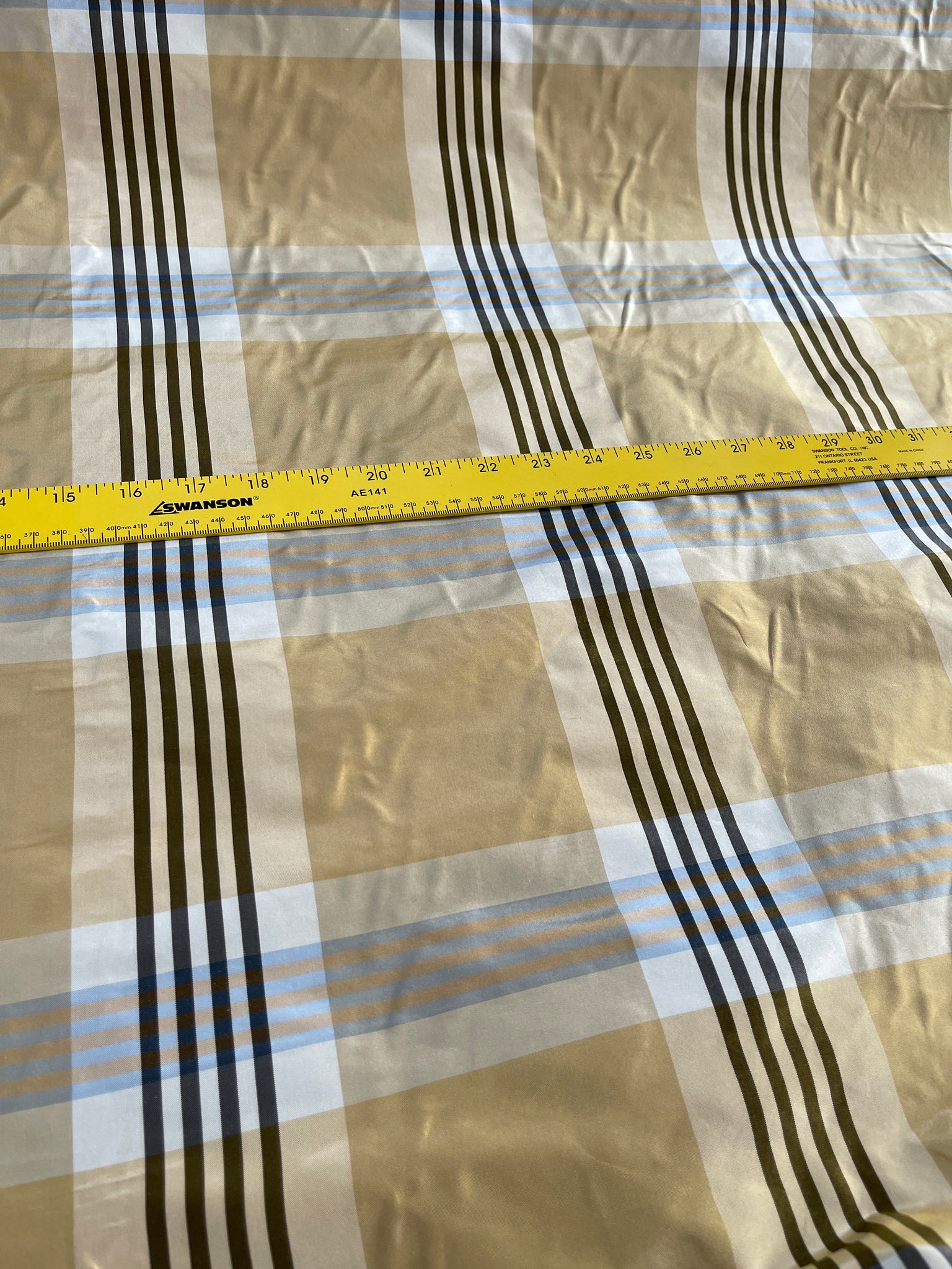 Exquisite quality designer collection iridescent silk taffeta plaid in Gold, Cream and Blues, approximate check size 4.1” x 4.1” and repeat 7”.