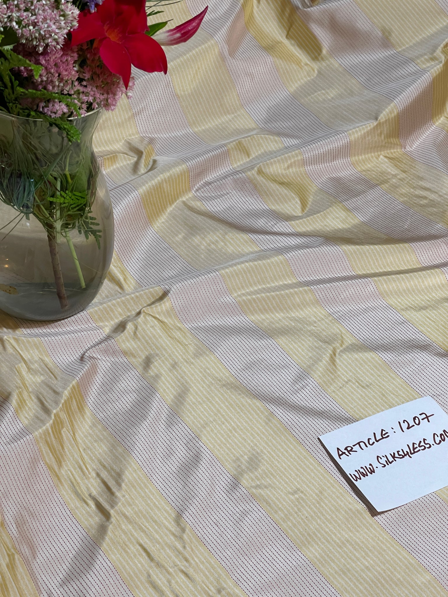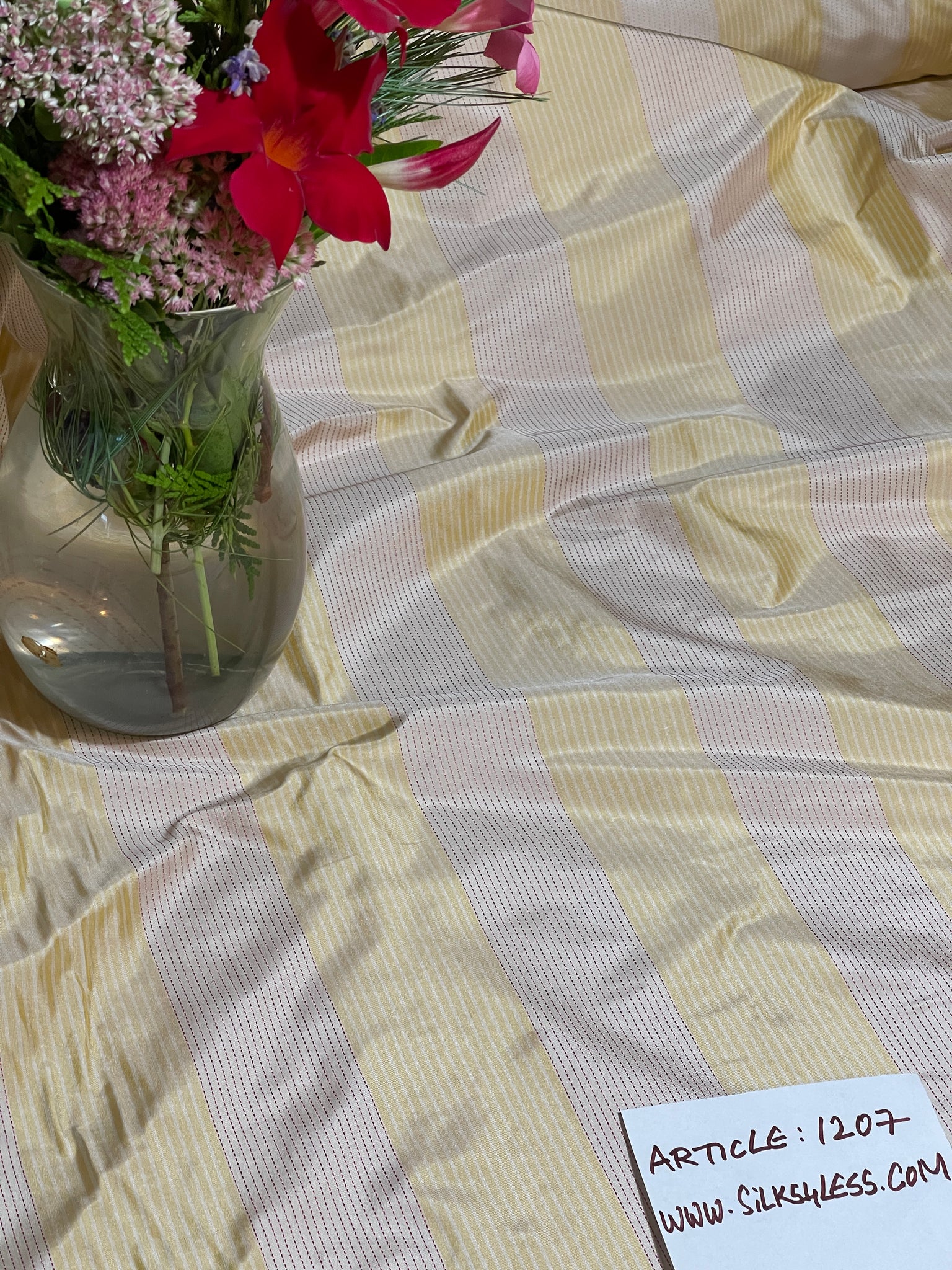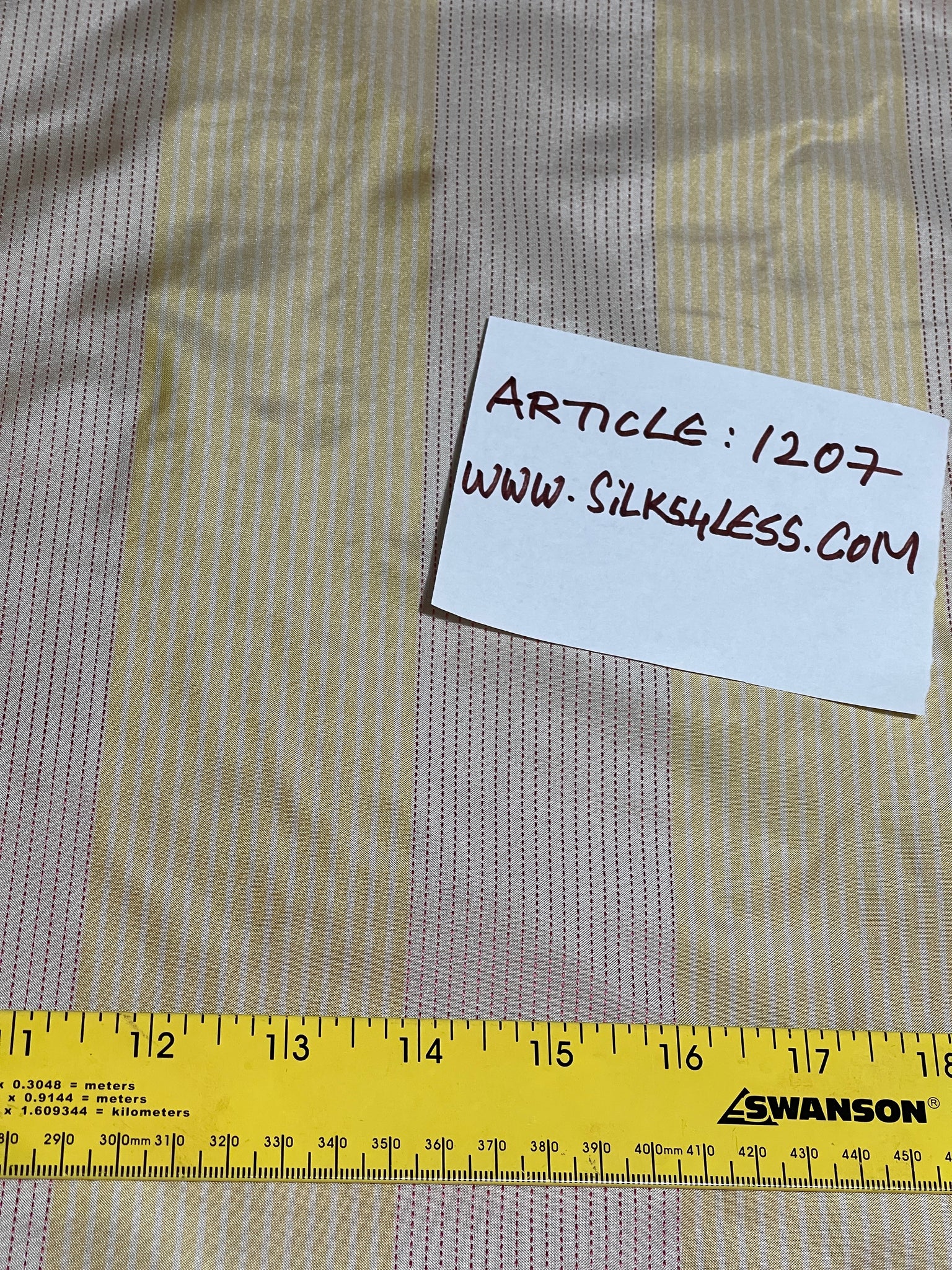 Designer quality Silk Taffeta Stripes, Dobby Weave, Colors - Golden Yellow and Beige, stripes running up the roll. Approximate repeat 4 5/8"