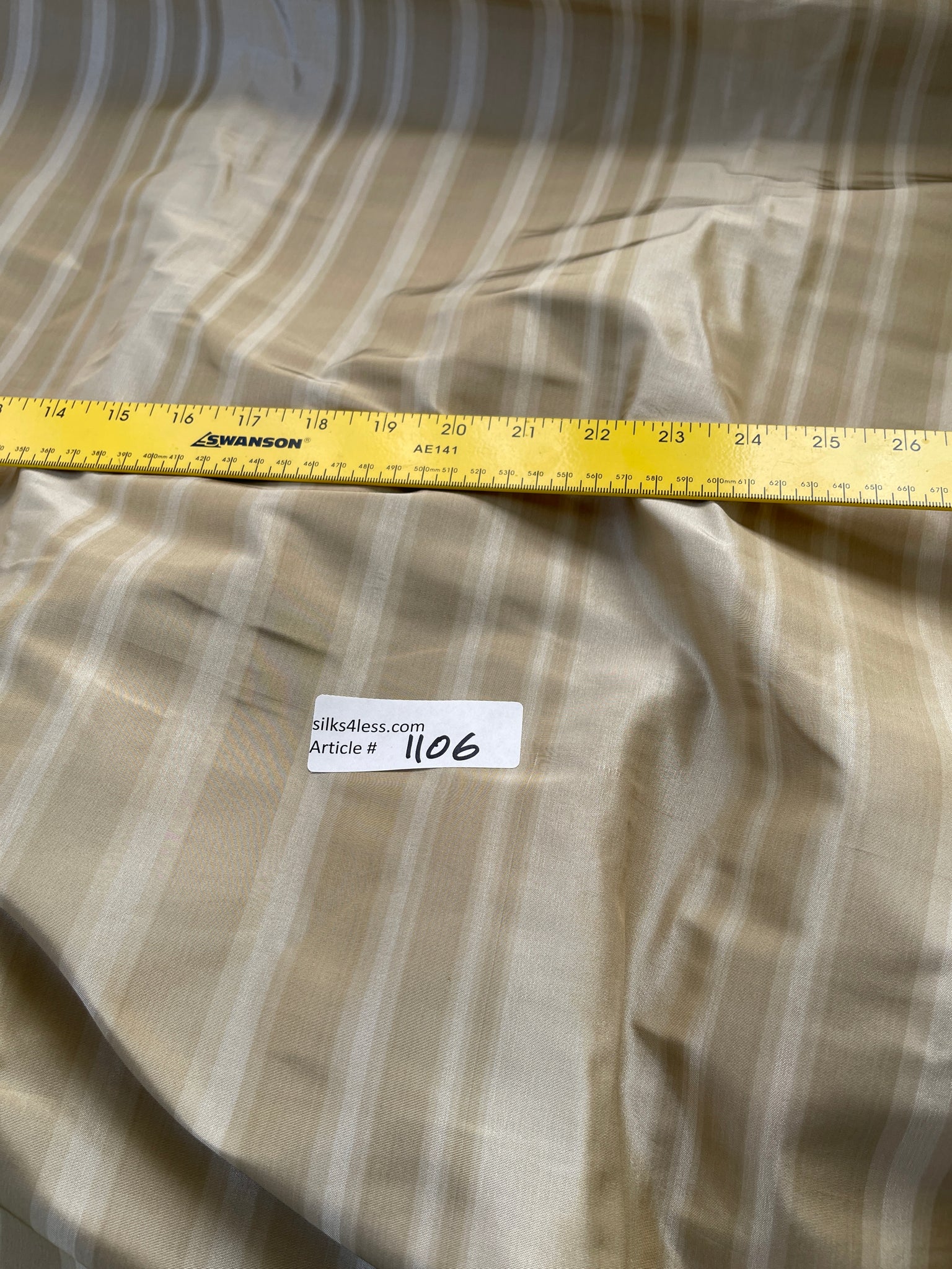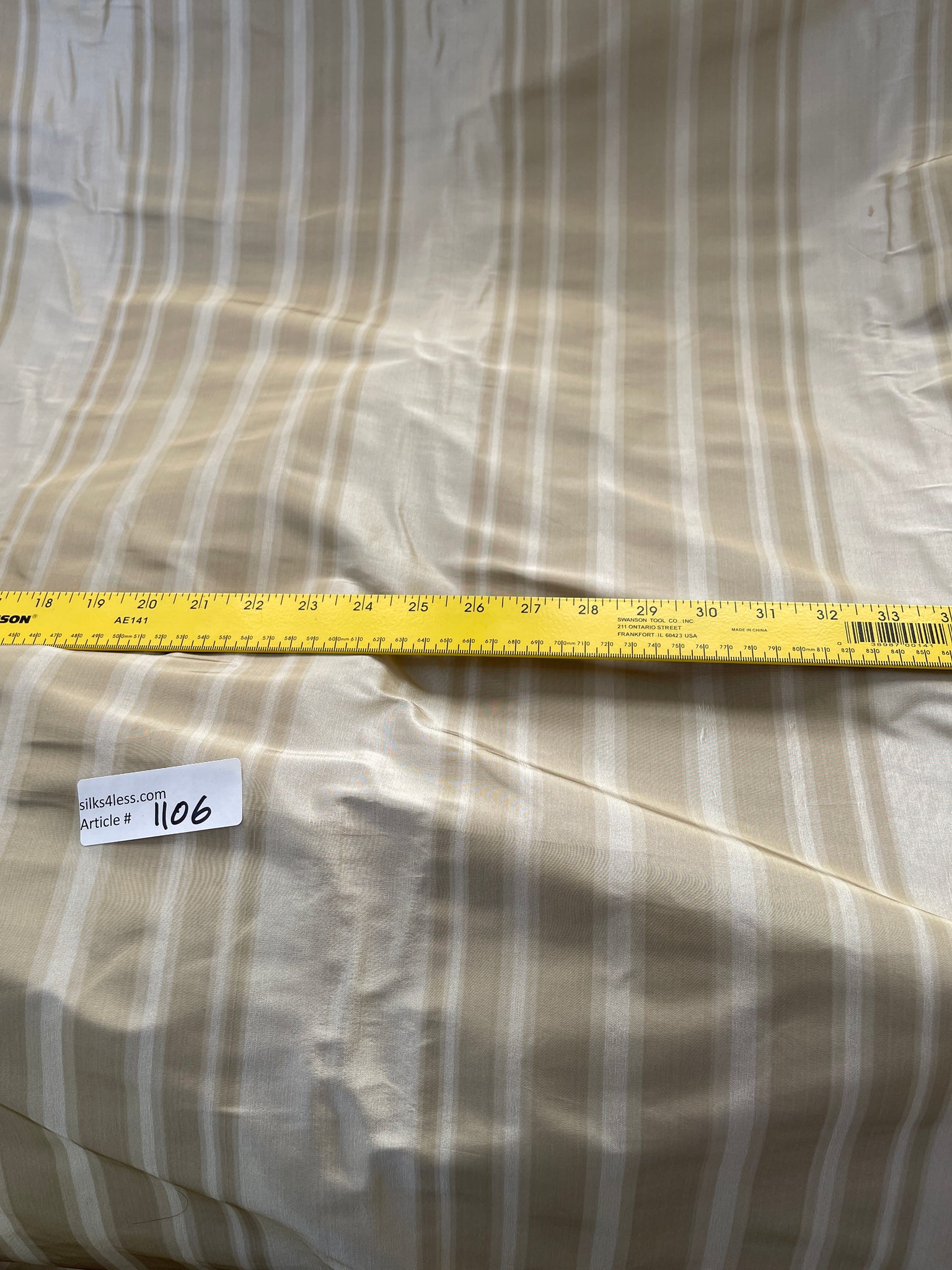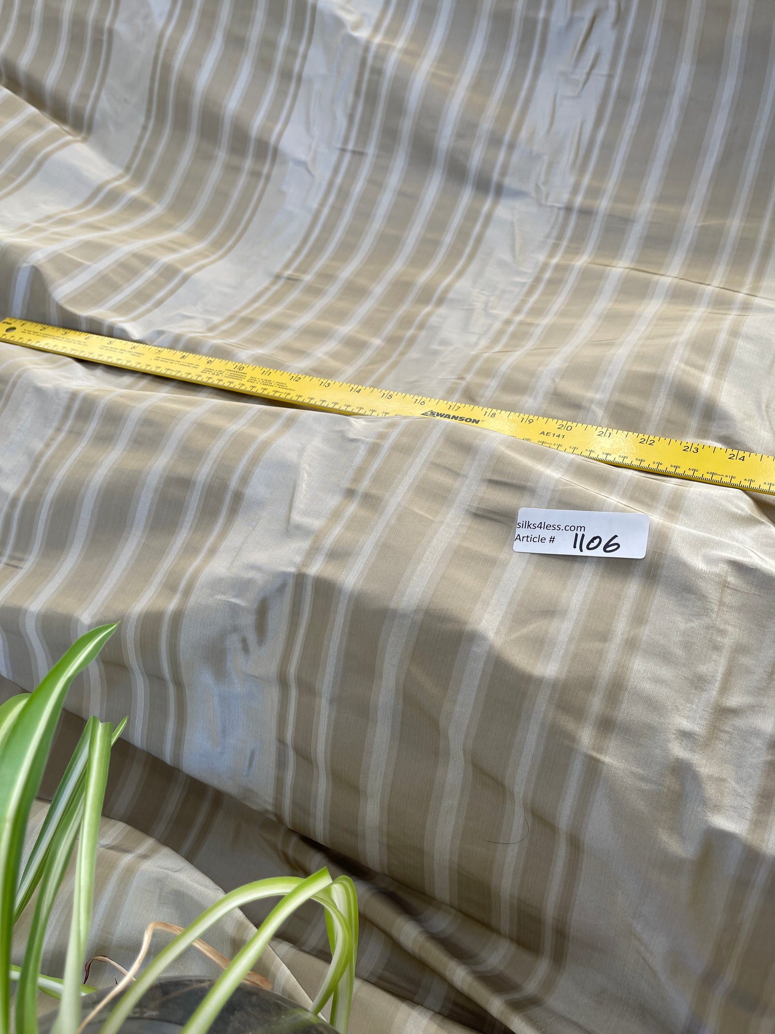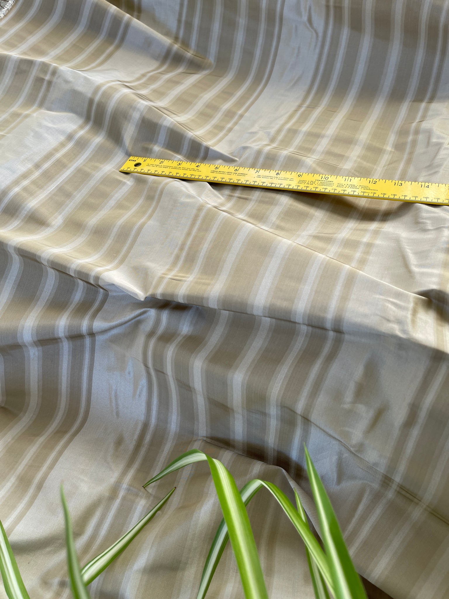 Exquisite quality silk taffeta stripes in Ivory and Greenish Grey, stripes running up the roll. Approximate repeat 9 3/4”.