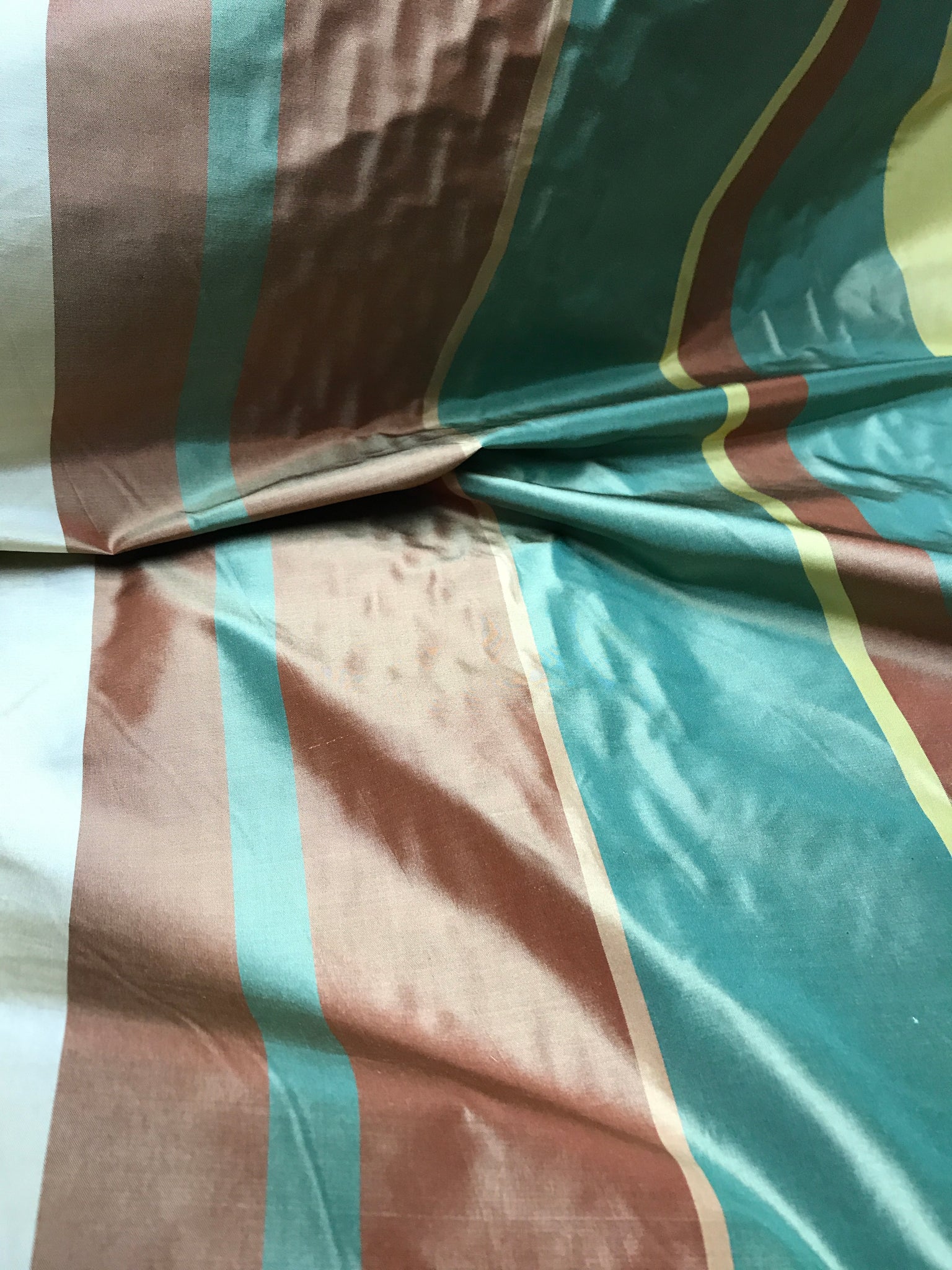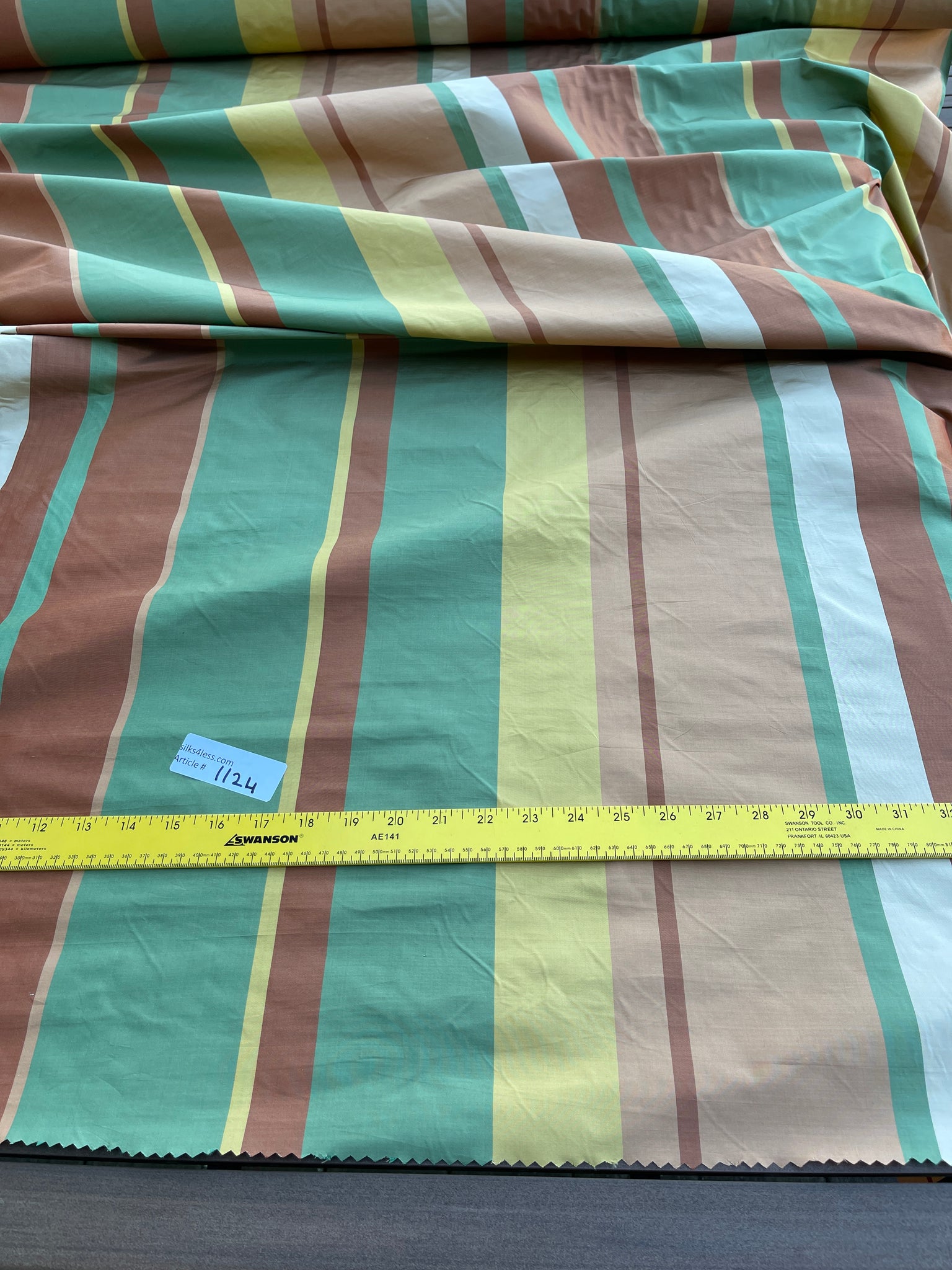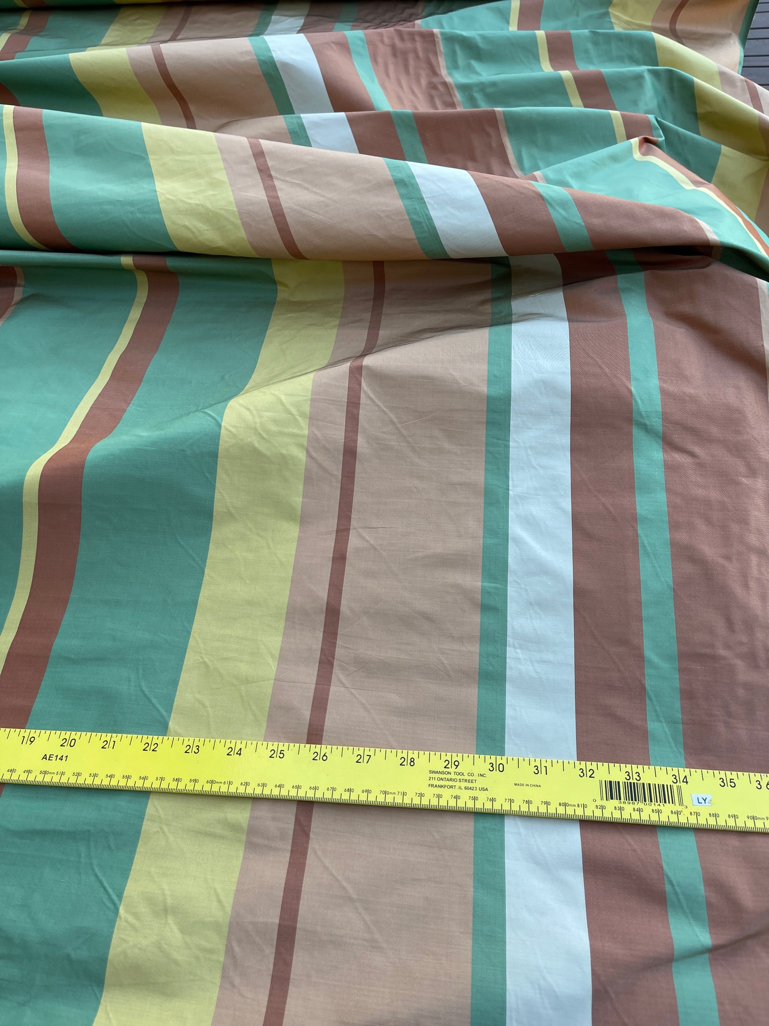 Designer quality silk taffeta stripes in gorgeous Greens, Browns, Golden Yellow and Off White, approximately repeat 24 ¼”. Stripes running up the roll.