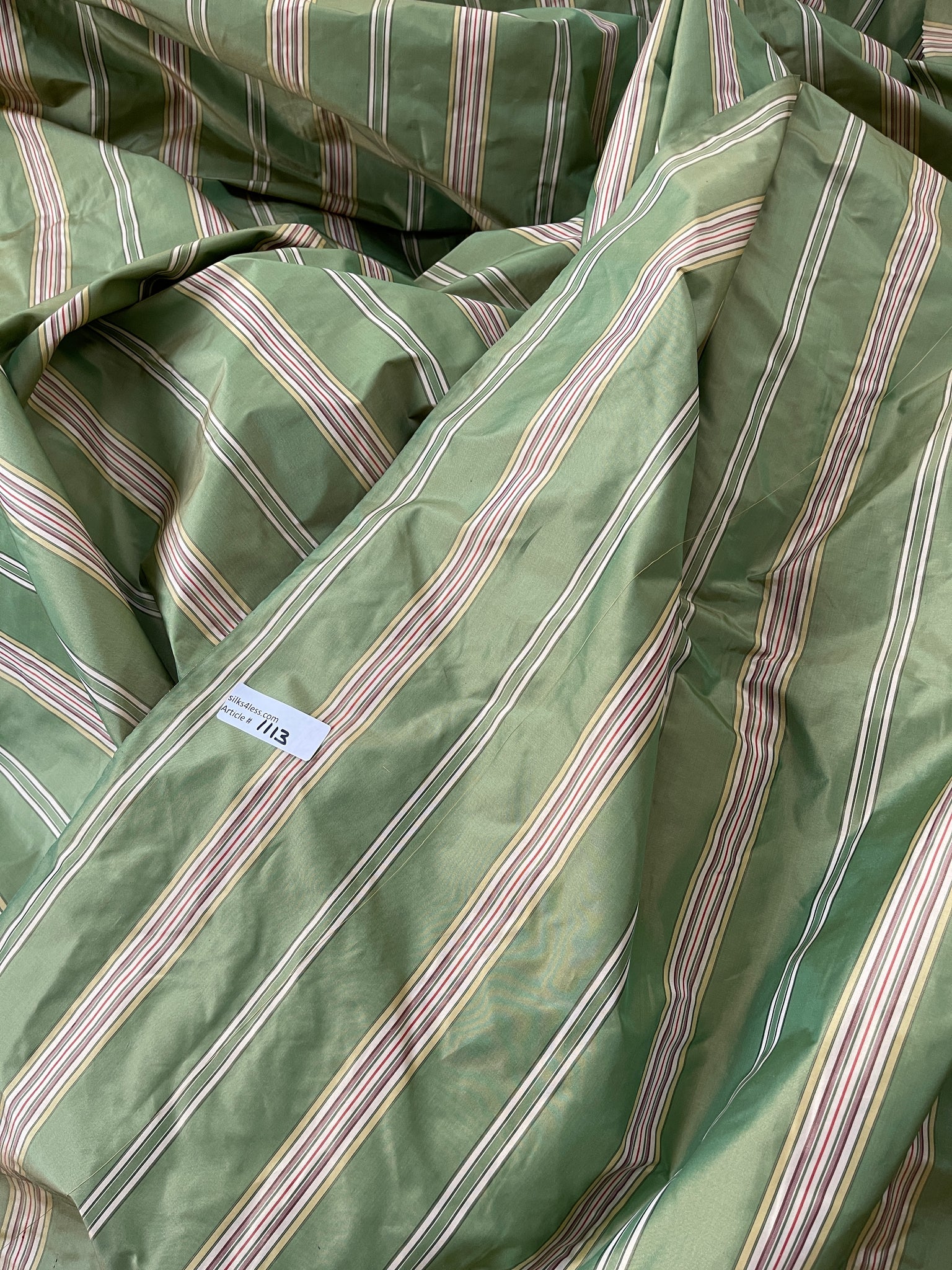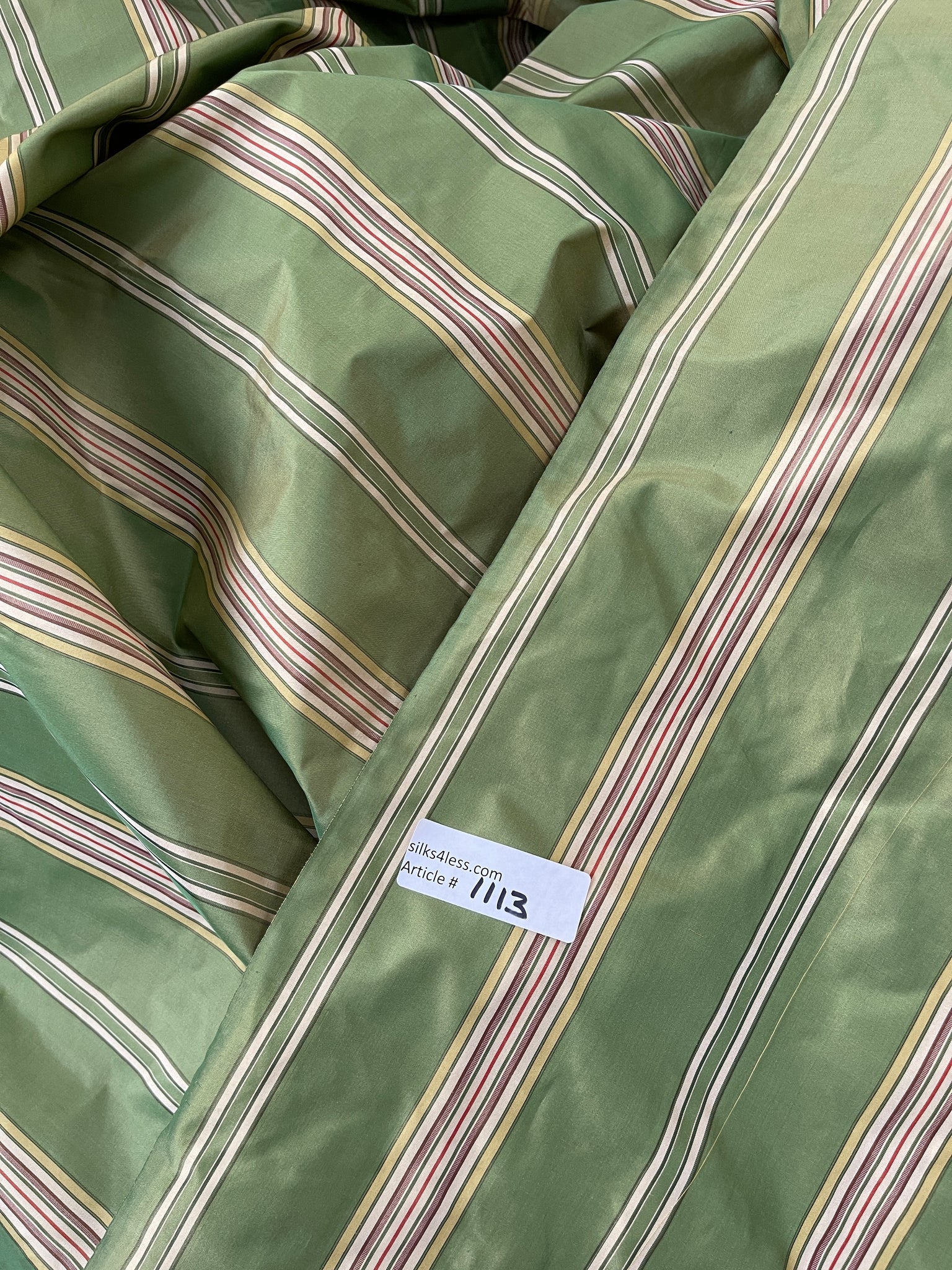 Designer quality silk taffeta stripes in iridescent Green with stripes in Off White, Light Yellow, Red and Brown tones, approximate repeat 5 ½”.