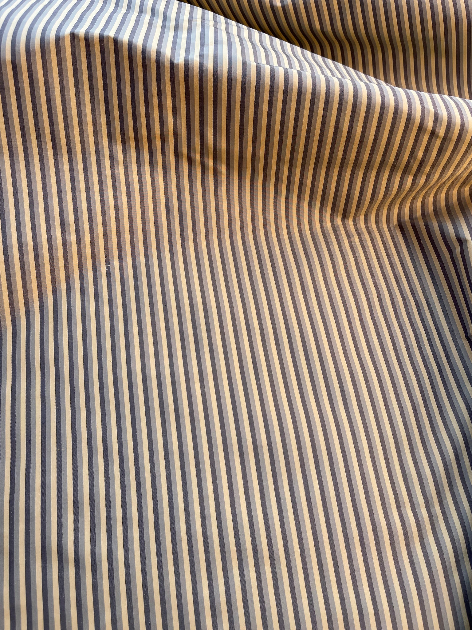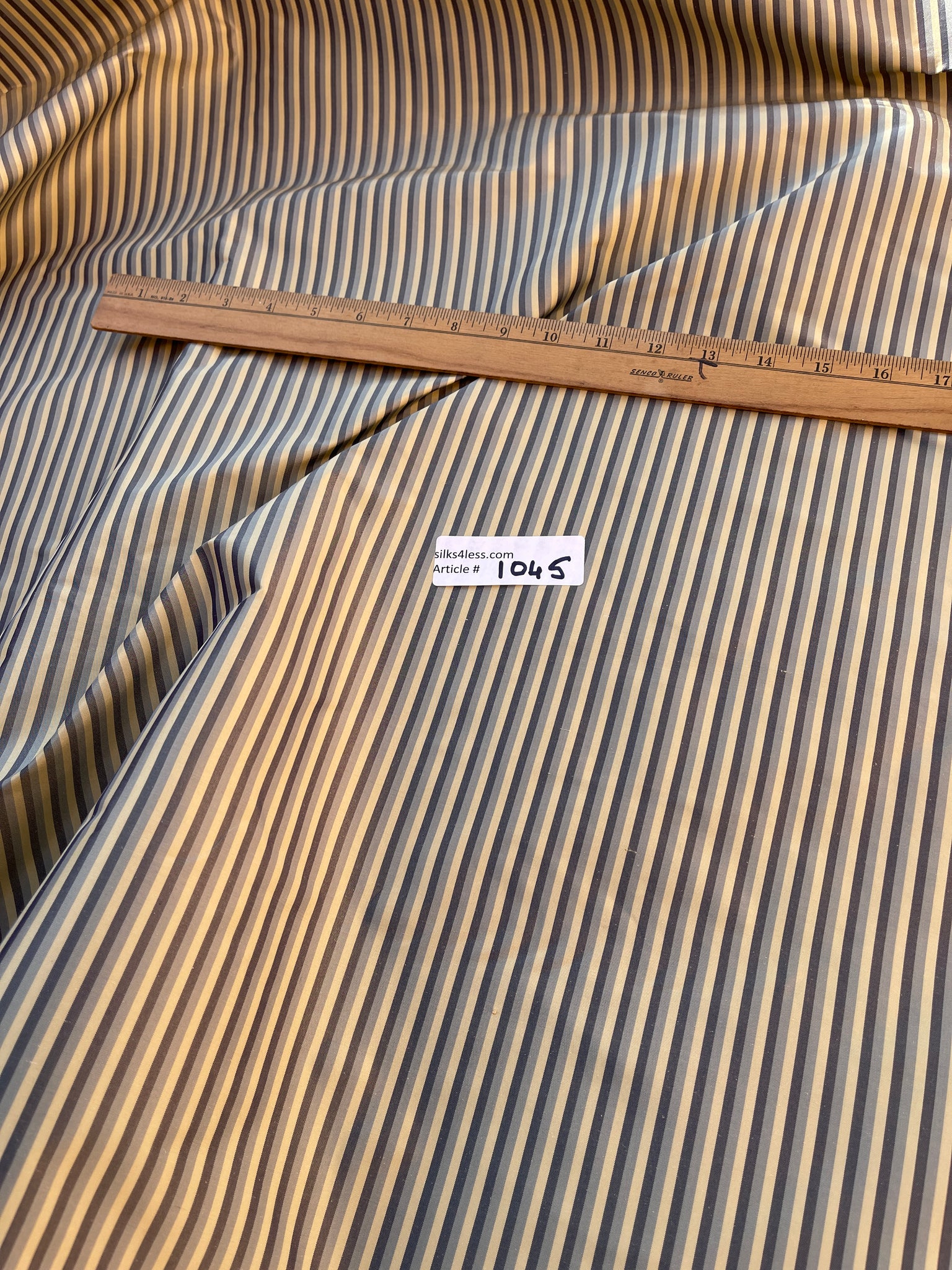 Fabulous quality and great hand to this silk stripe in Gray, Cream and Steel, approximate stripe size 1/8" and repeat 3/8", stripes run up the roll.