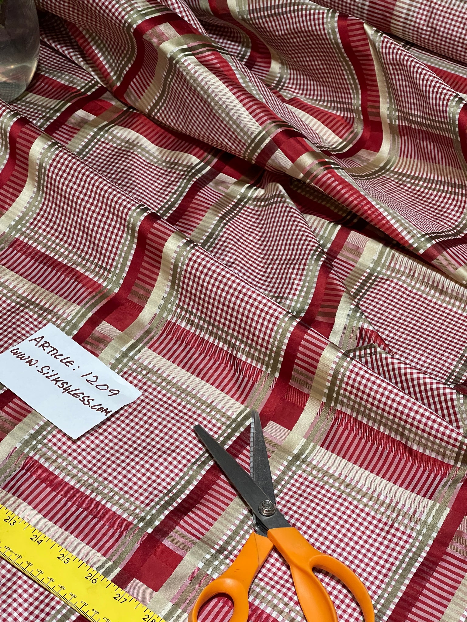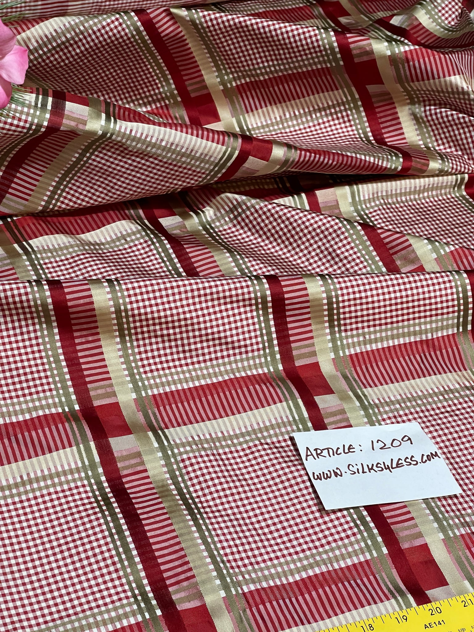 Great quality Silk taffeta Satin weave plaid in Red, White, Olive Greens and Gold. Limited yardage available.