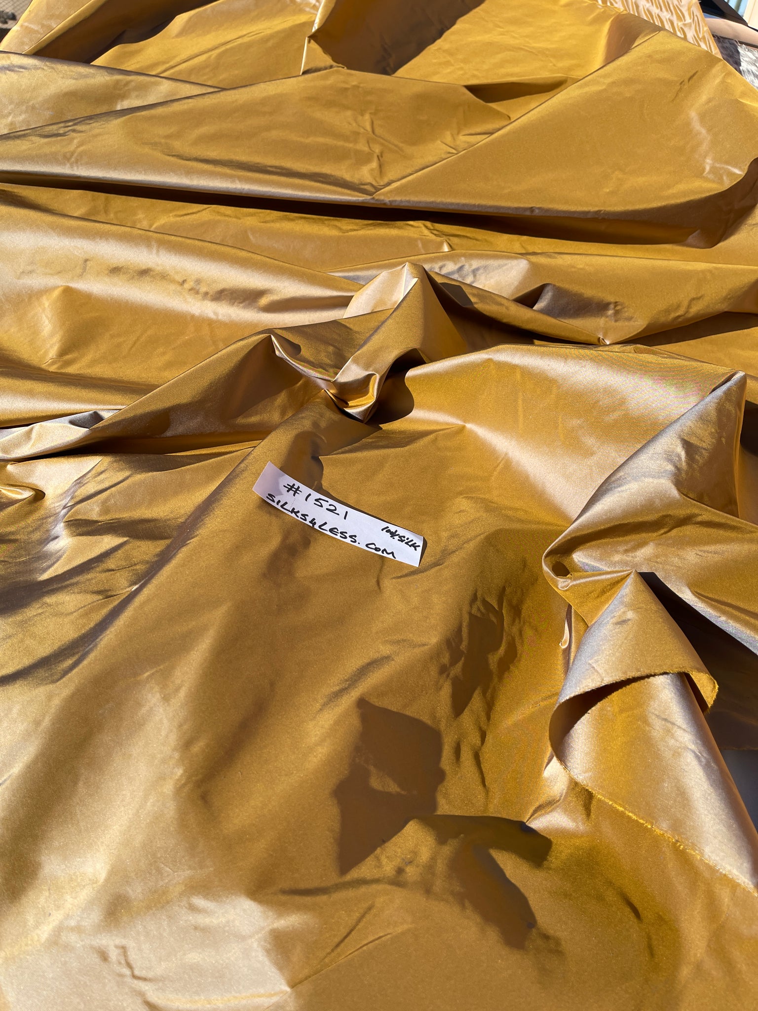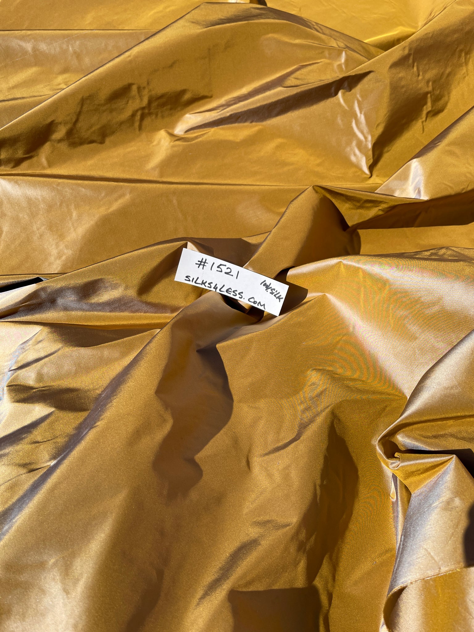Exquisite quality iridescent silk taffeta is a combination of gorgeous Gold color yarns in the warp and Palisade Blue color yarns in the weft, crisp & great body.