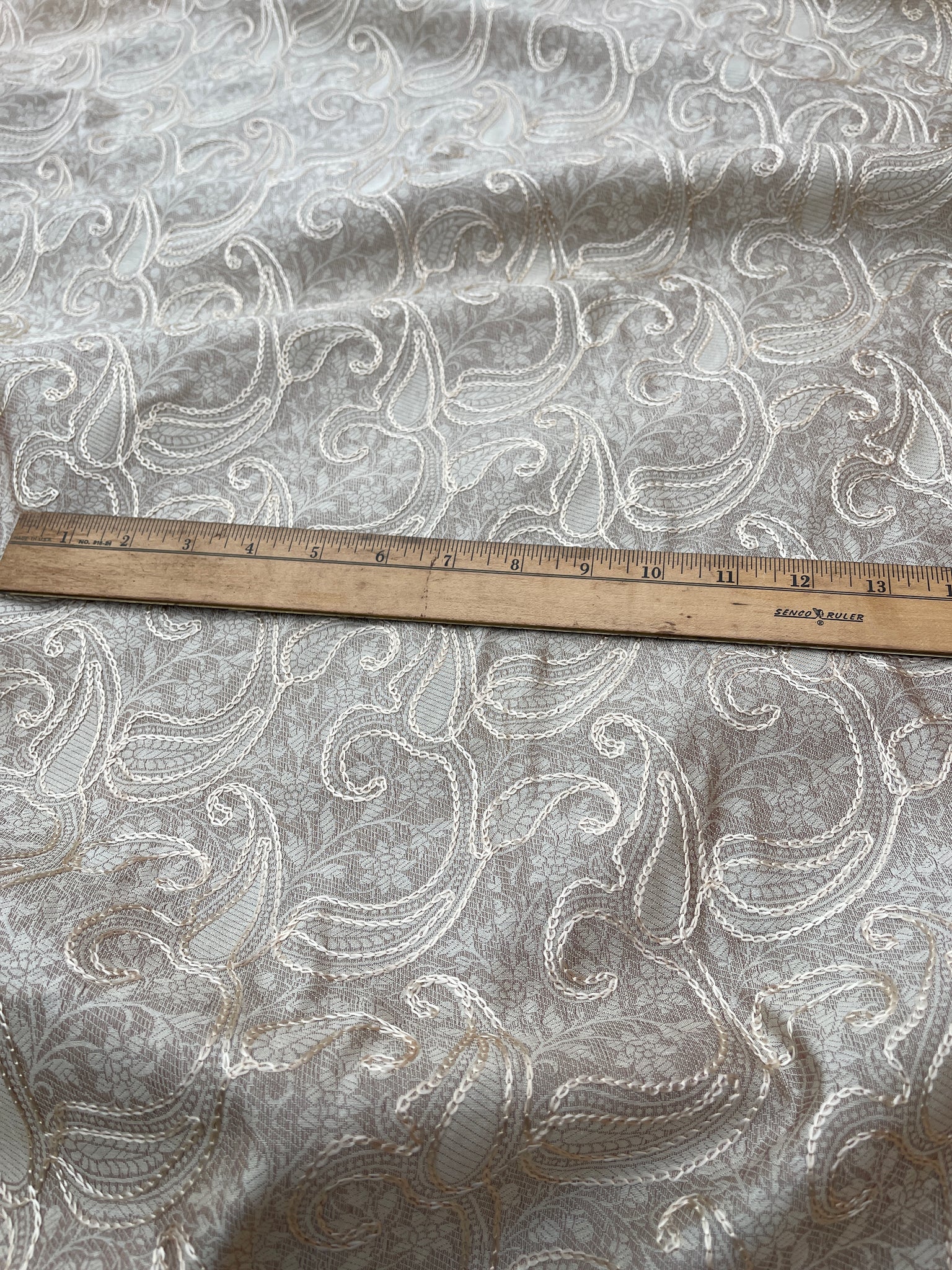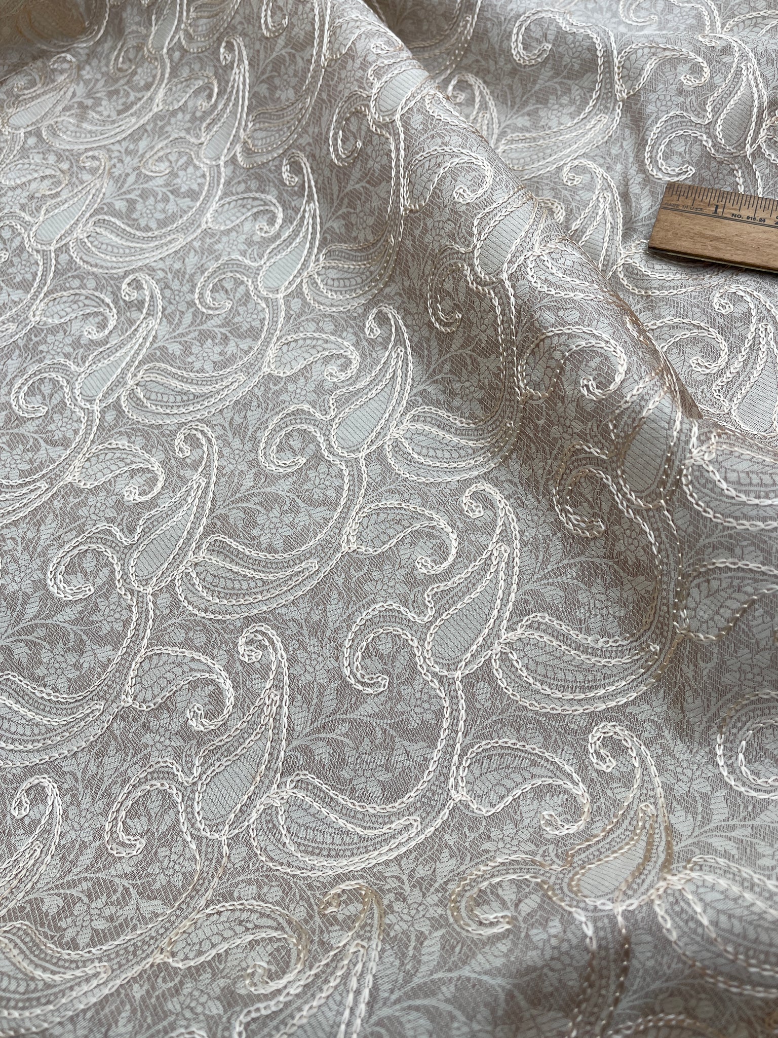 AS PRETTY AS THE PICTURE : Great quality and medium weight, unique floral Jacquard/Wheat base with raised Paisley design embroidered, tone on tone, approximate repeat 5 1/8”. Available in 5 different color ways.