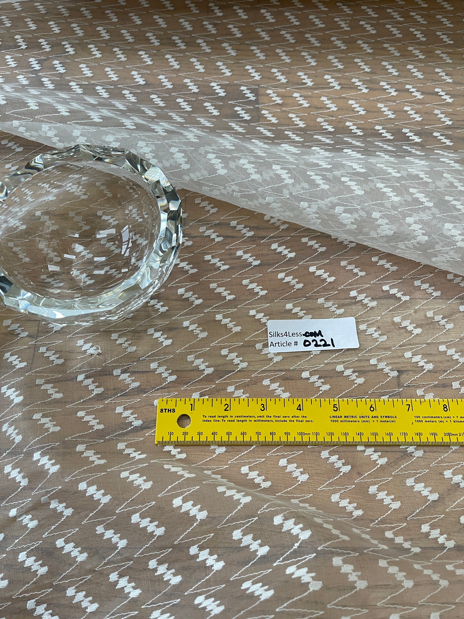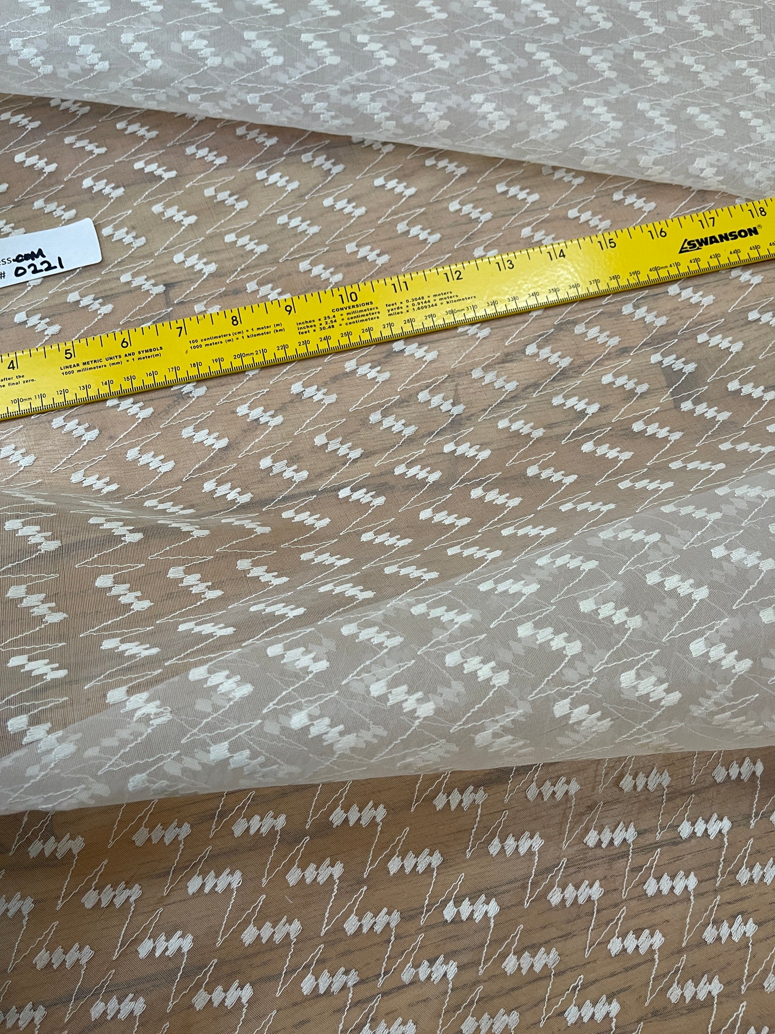 As pretty as the picture - Gorgeous - silk organza White ground, zig zag embroidery design with matching thread, design runs up the roll.