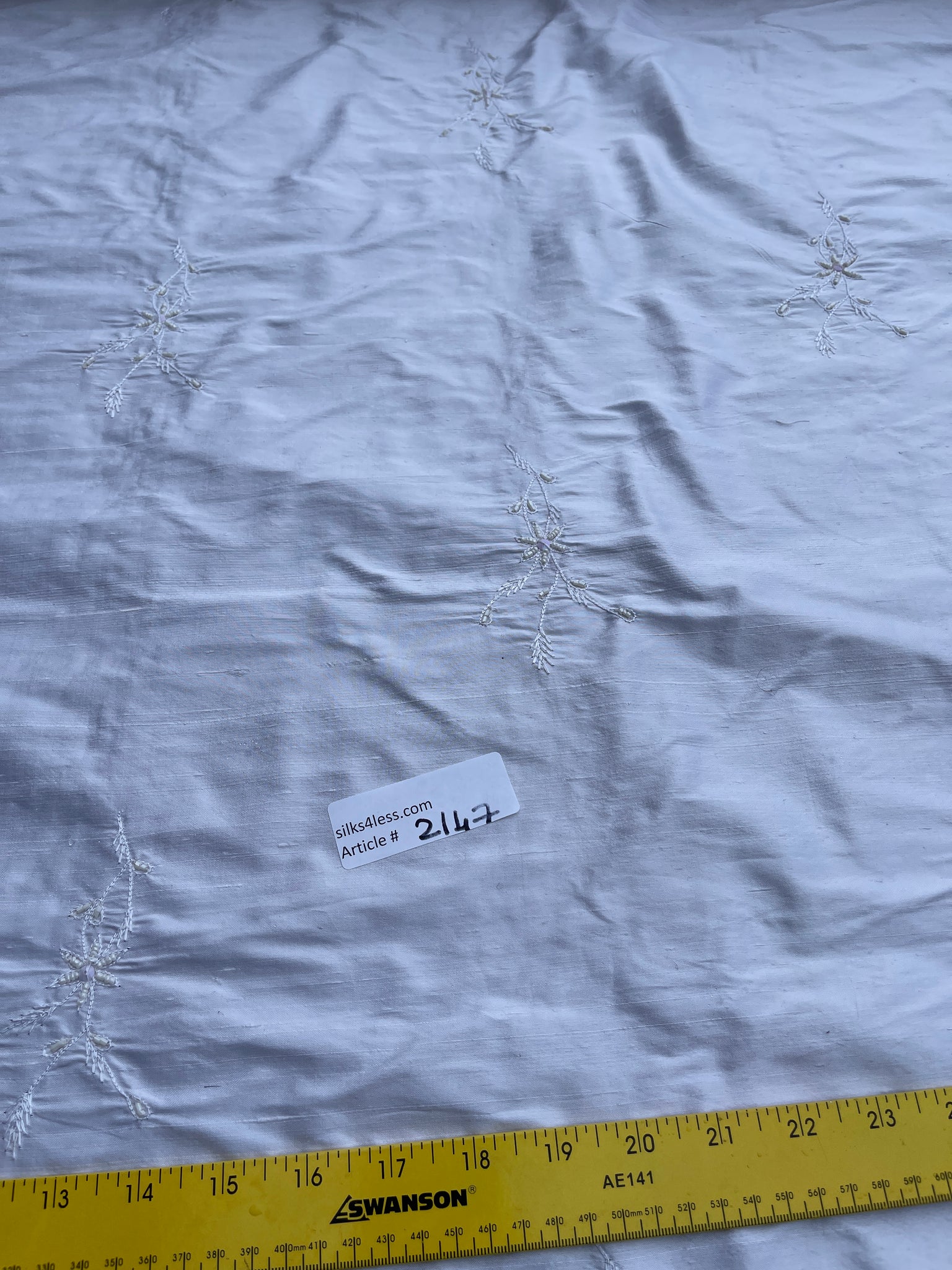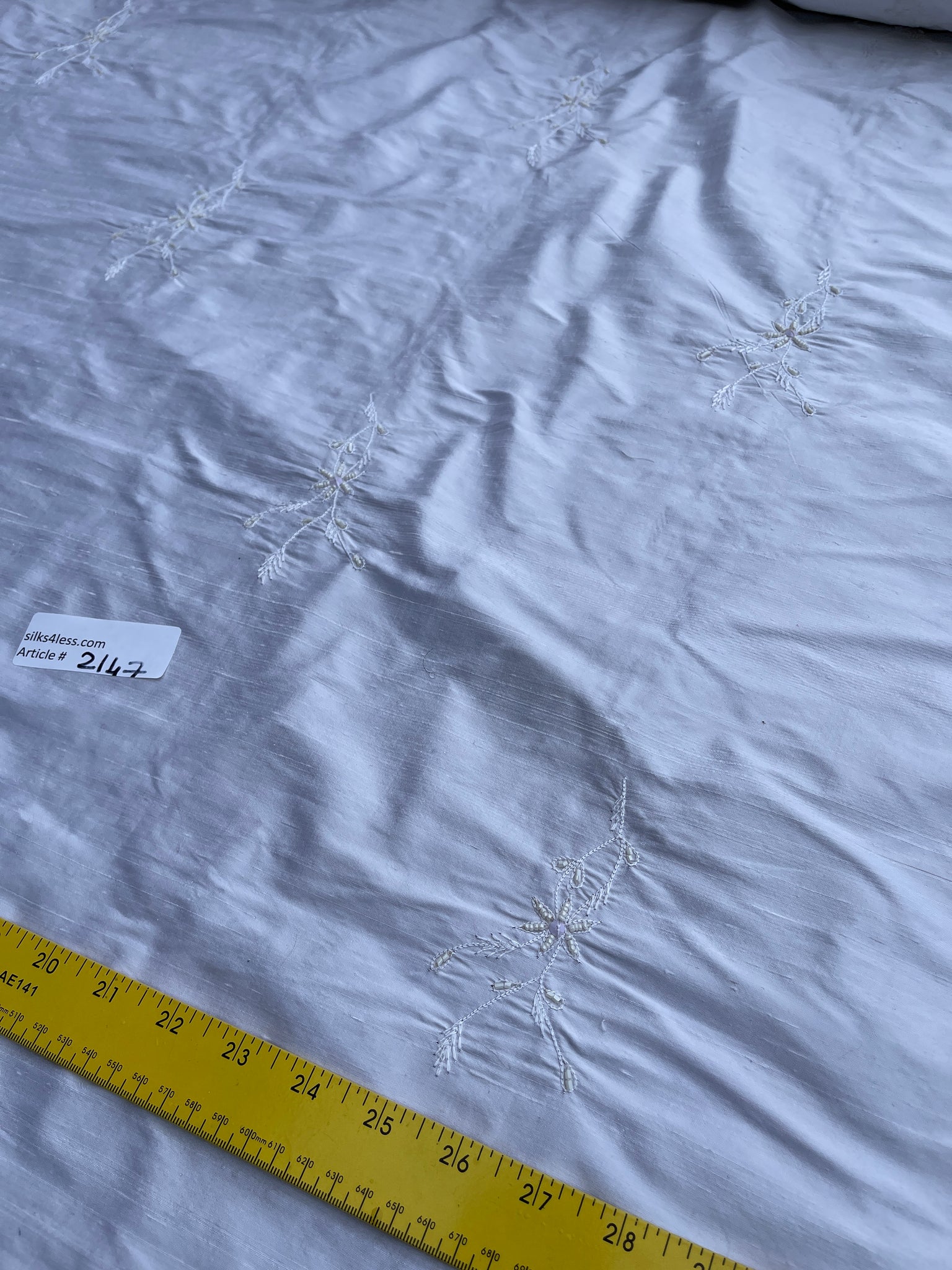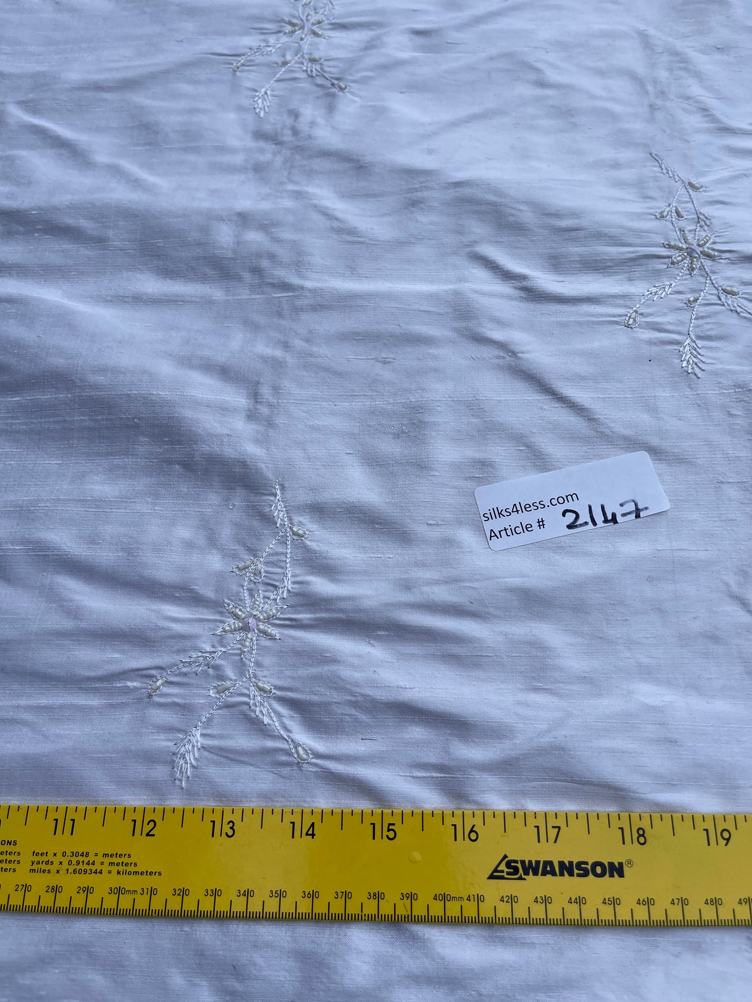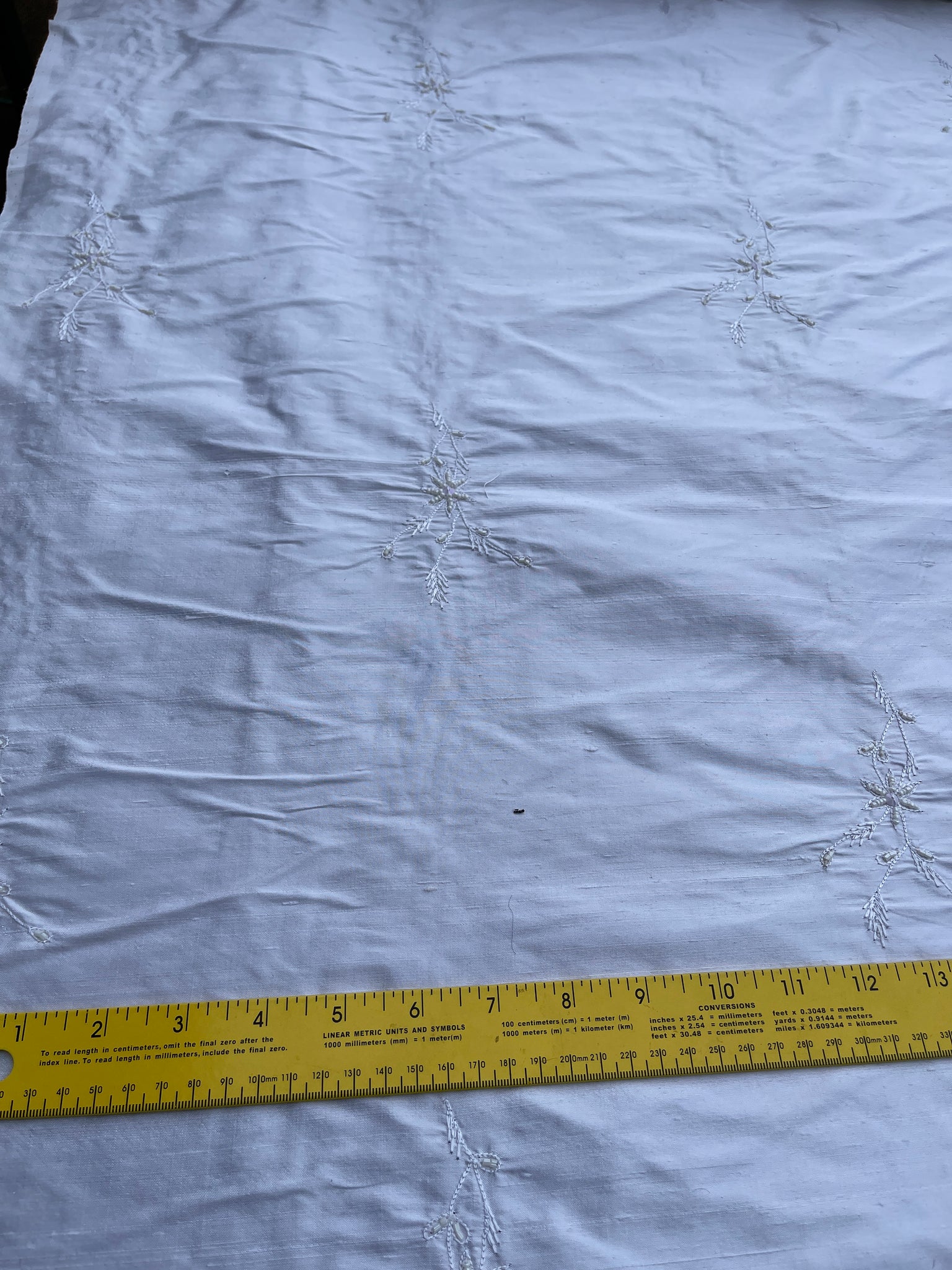 Fabulous designer quality silk shantung bridal embroidery. Base White/Off White, floral pattern hand embroidered with tone on tone beads and sequence, approximate flower size 4” long and 2” wide and repeat 13”. Simple embroidery for a subtle grandeur.