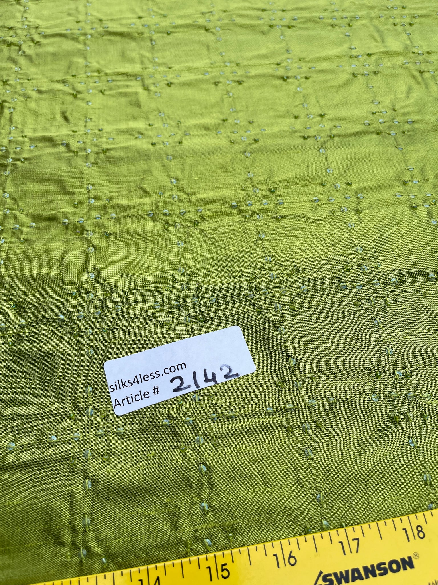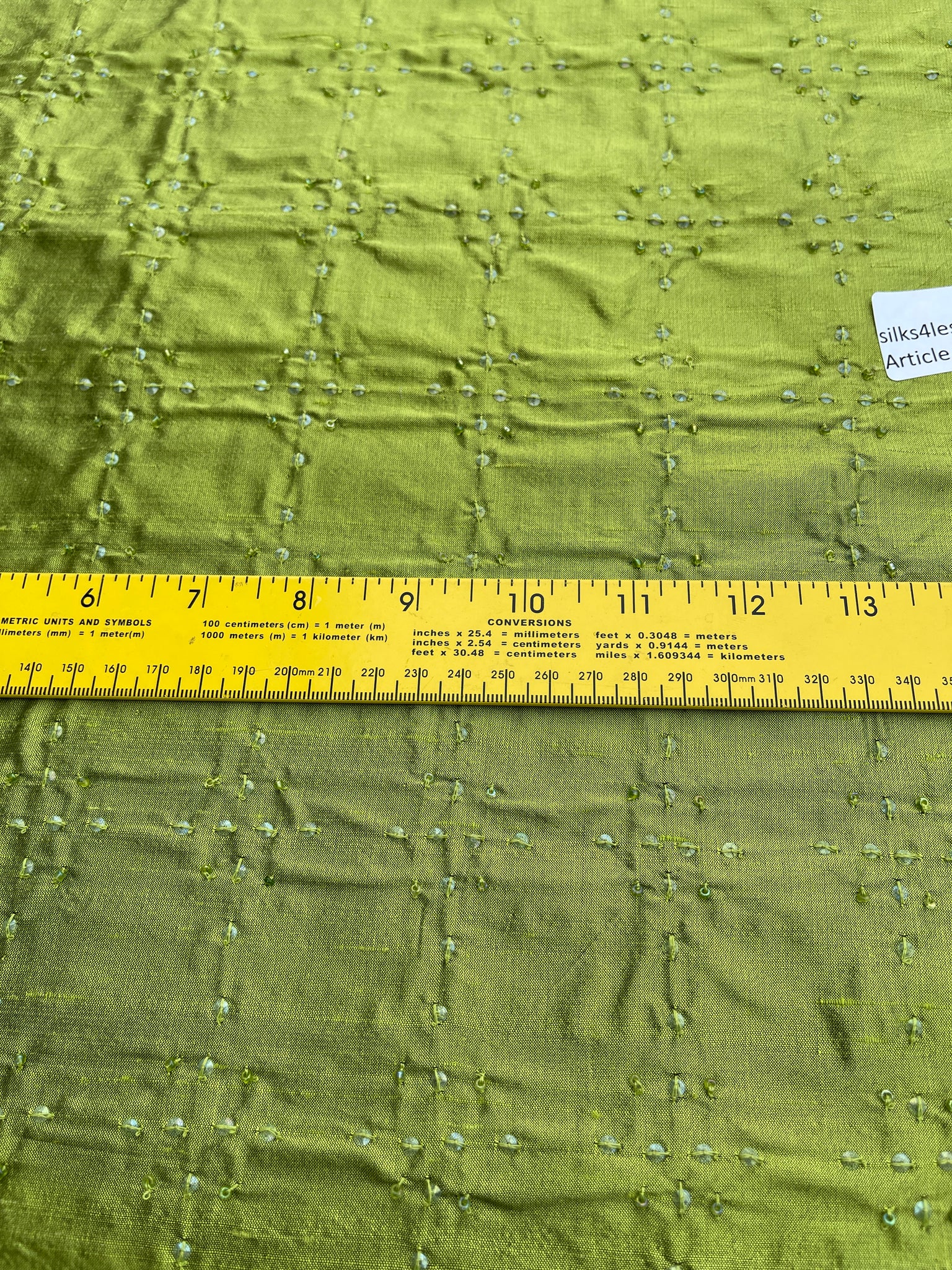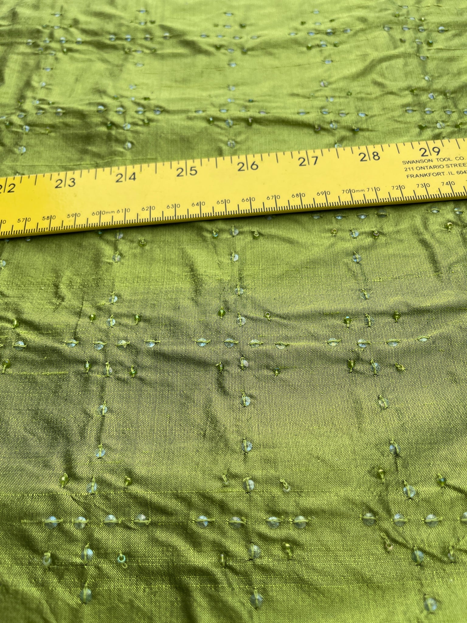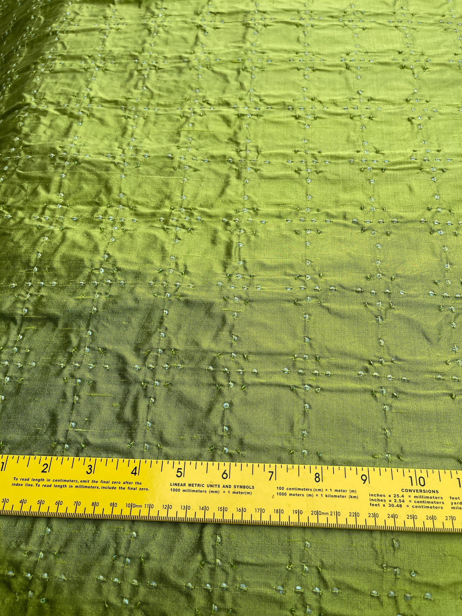 Fabulous designer quality silk dupioni embroidery. Base Lime Green with Black, geometric pattern hand embroidered with clear beads and sequence, simple embroidery for a subtle grandeur.