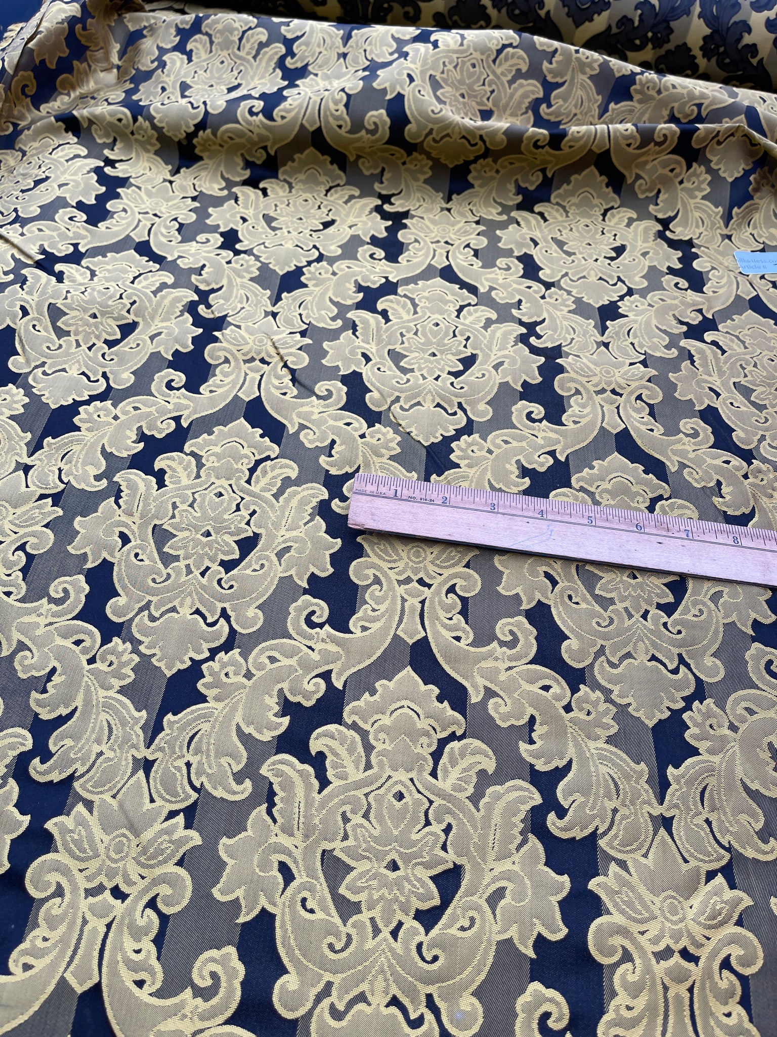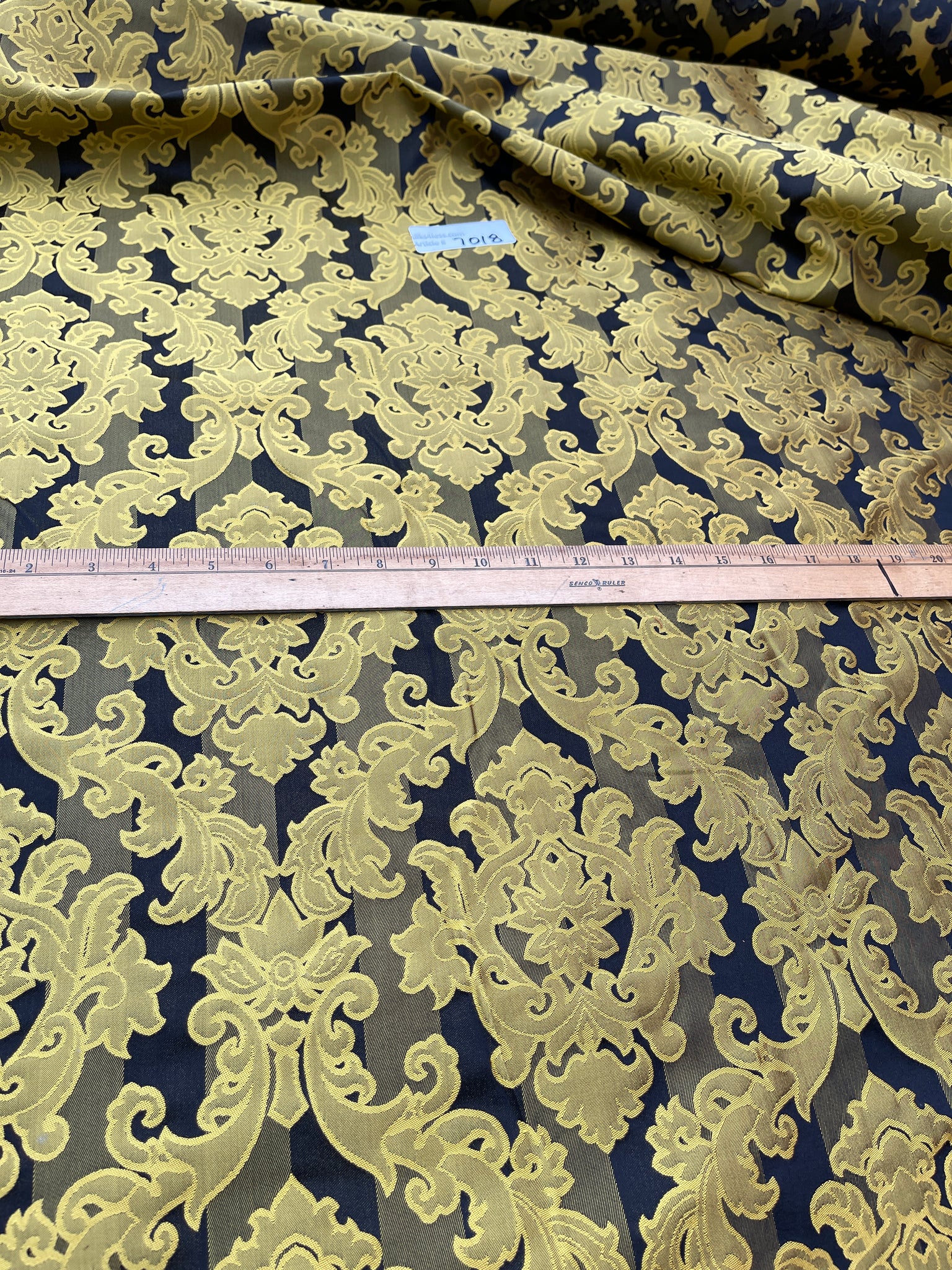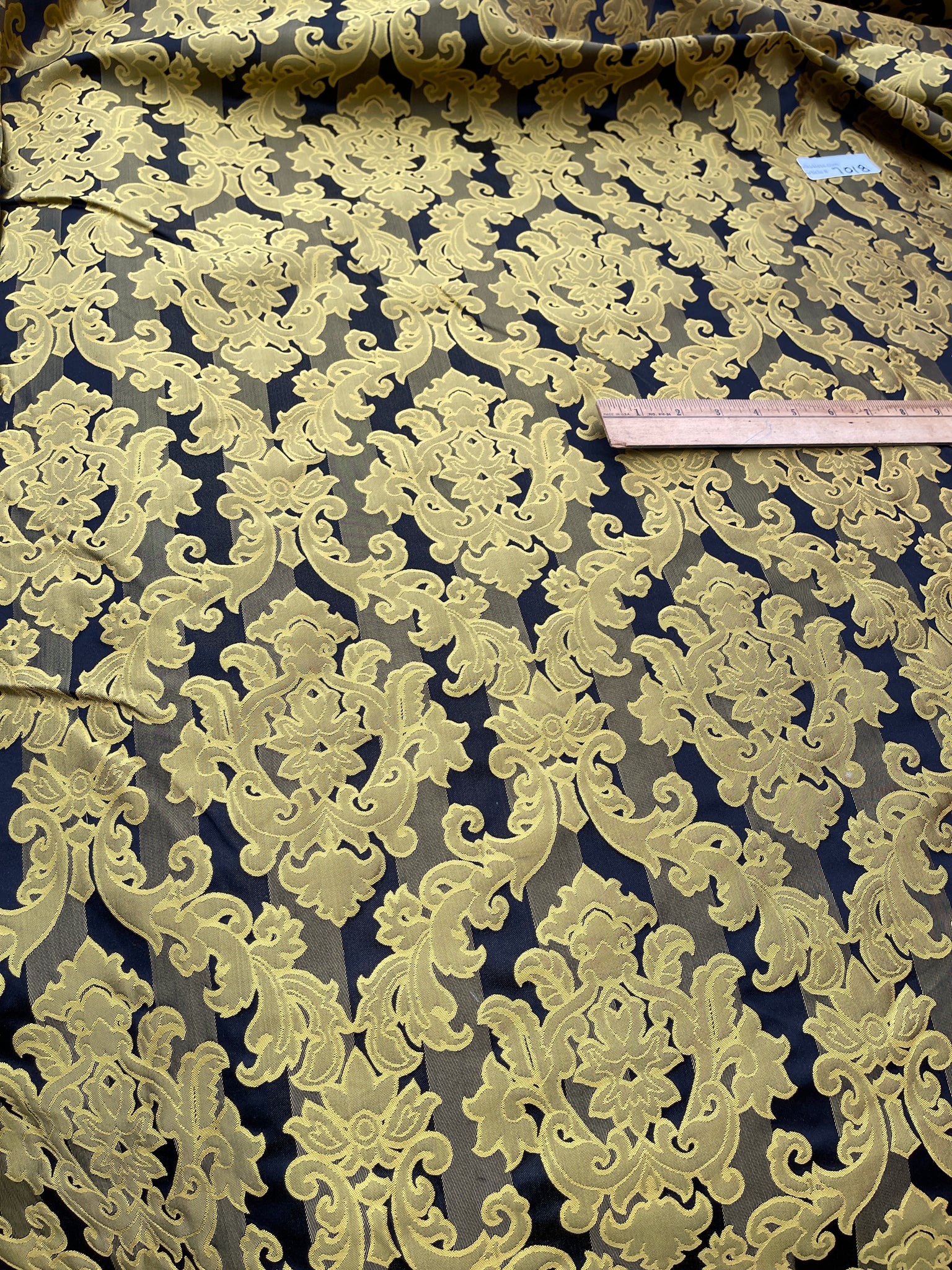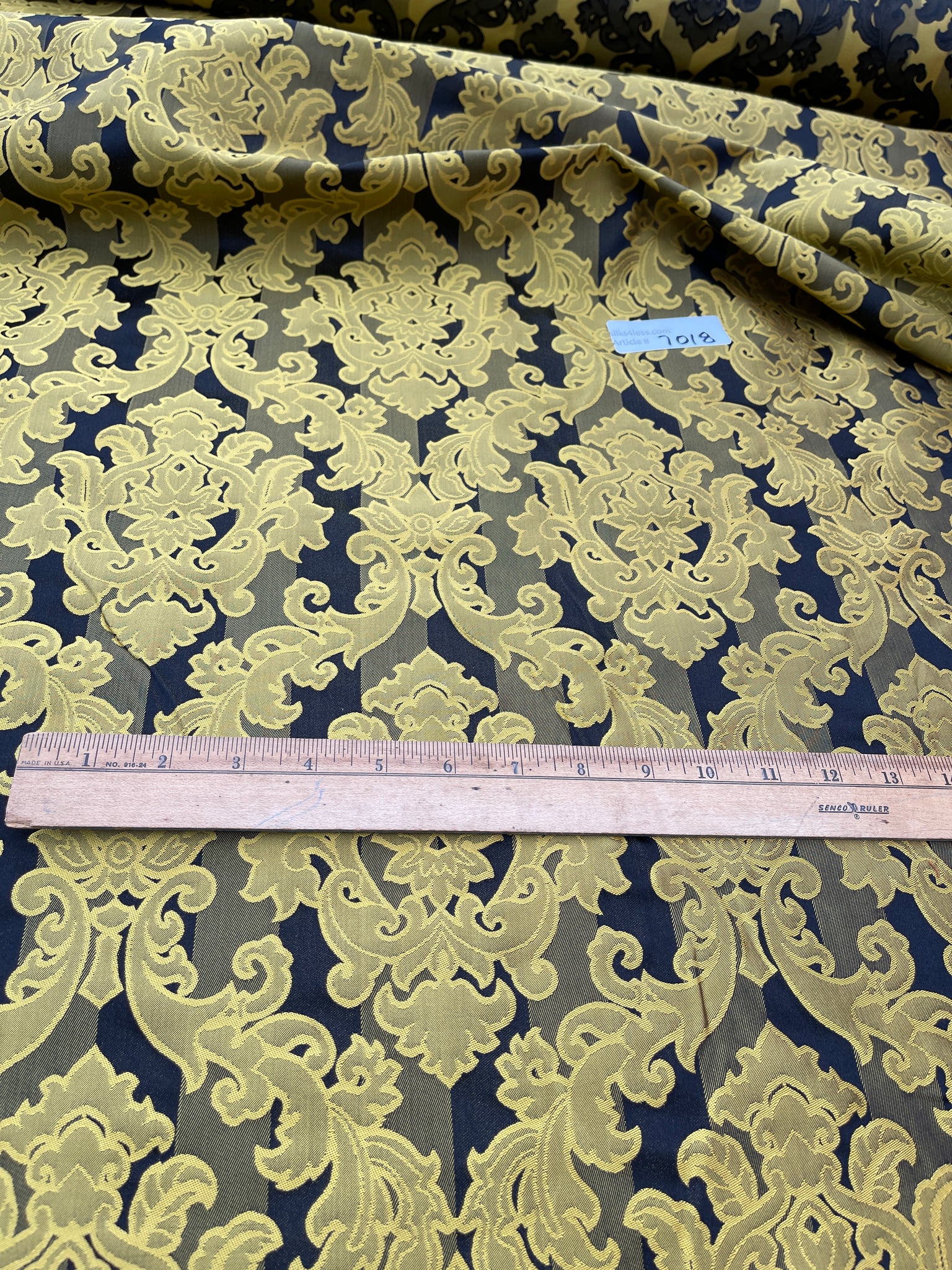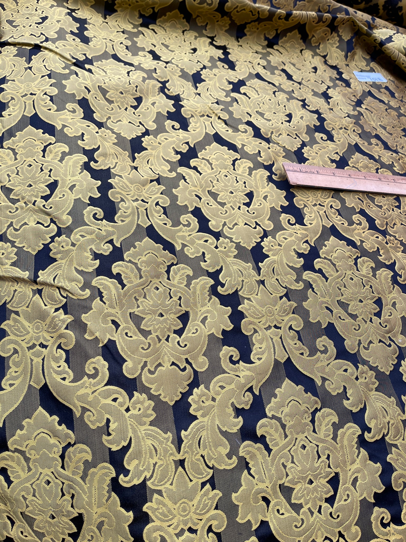 Designer quality heavy Silk Satin, base fabric stripes in Black/Gold with damask pattern on top in Gold, approximate repeat of the pattern 8 ⅝”. High end product.