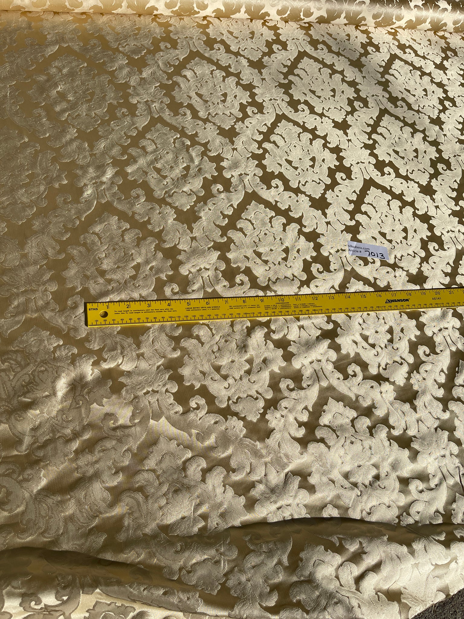 Designer quality heavy Silk Satin Damask fabric in Golden Wheat shade, approximate repeat of the pattern 8 ⅝”. High quality product.