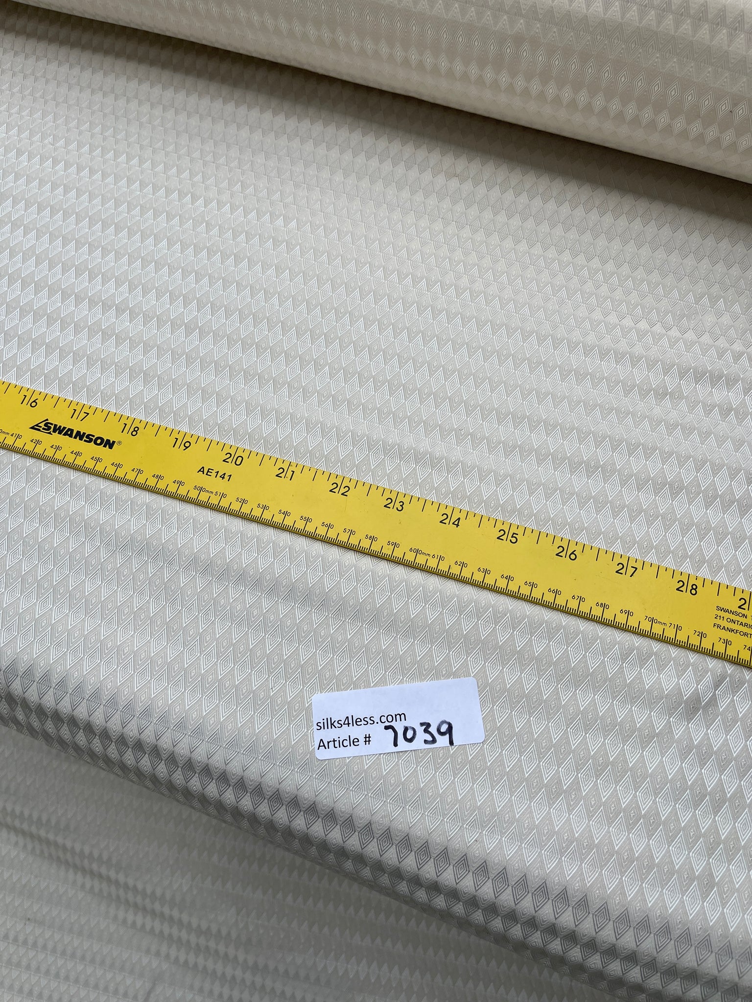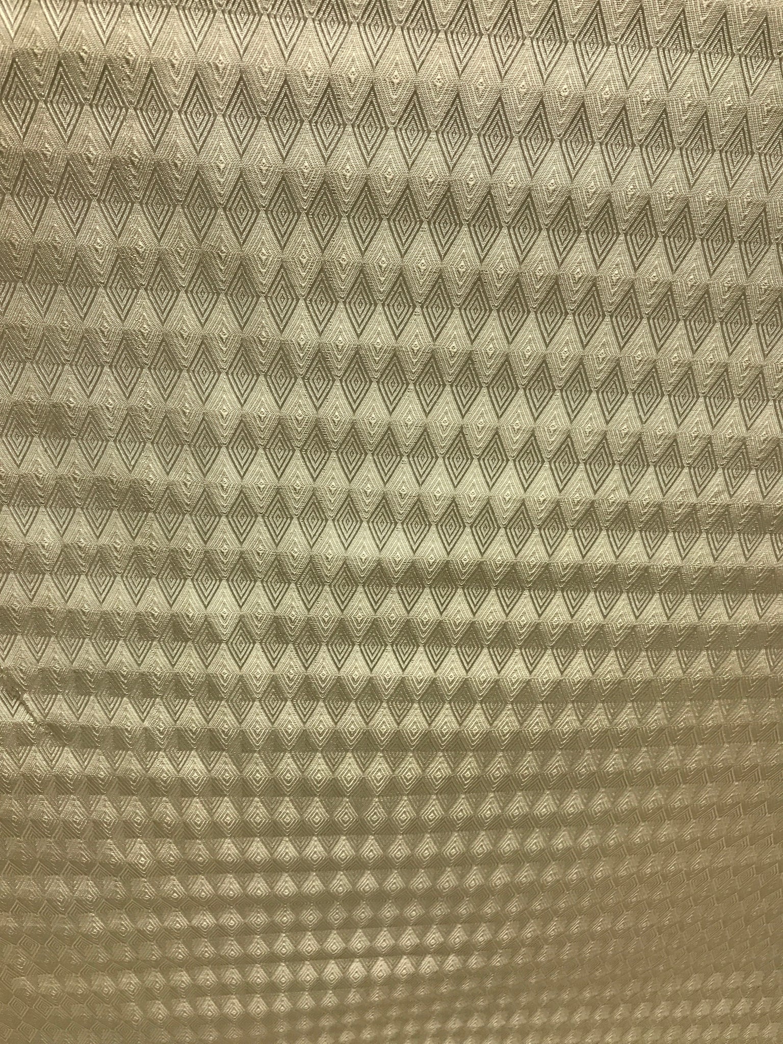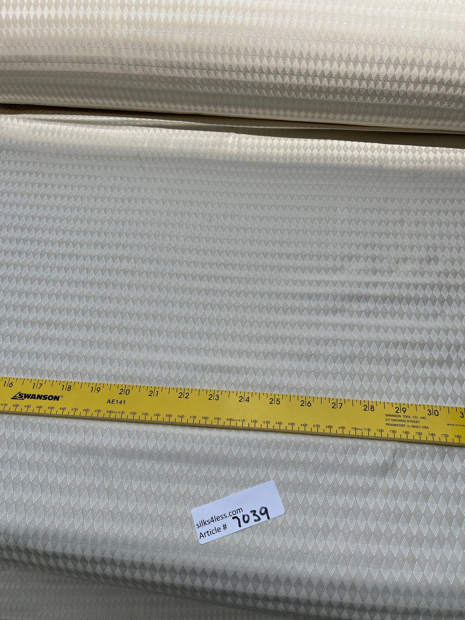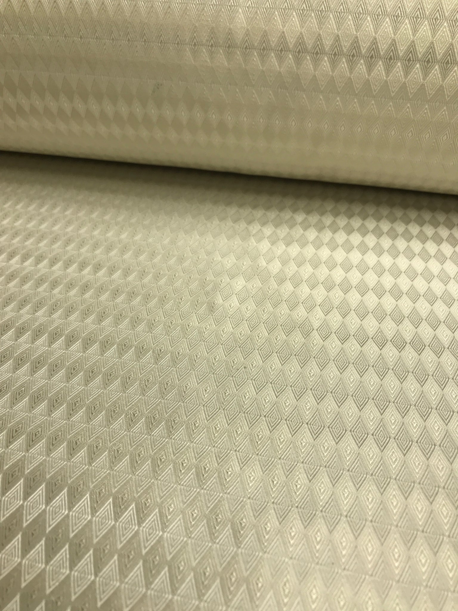 High end silk satin jacquard fabric, Diamond pattern design woven, approximate size ⅜” x ¾” in Ivory/Gold. Pattern going up the roll.