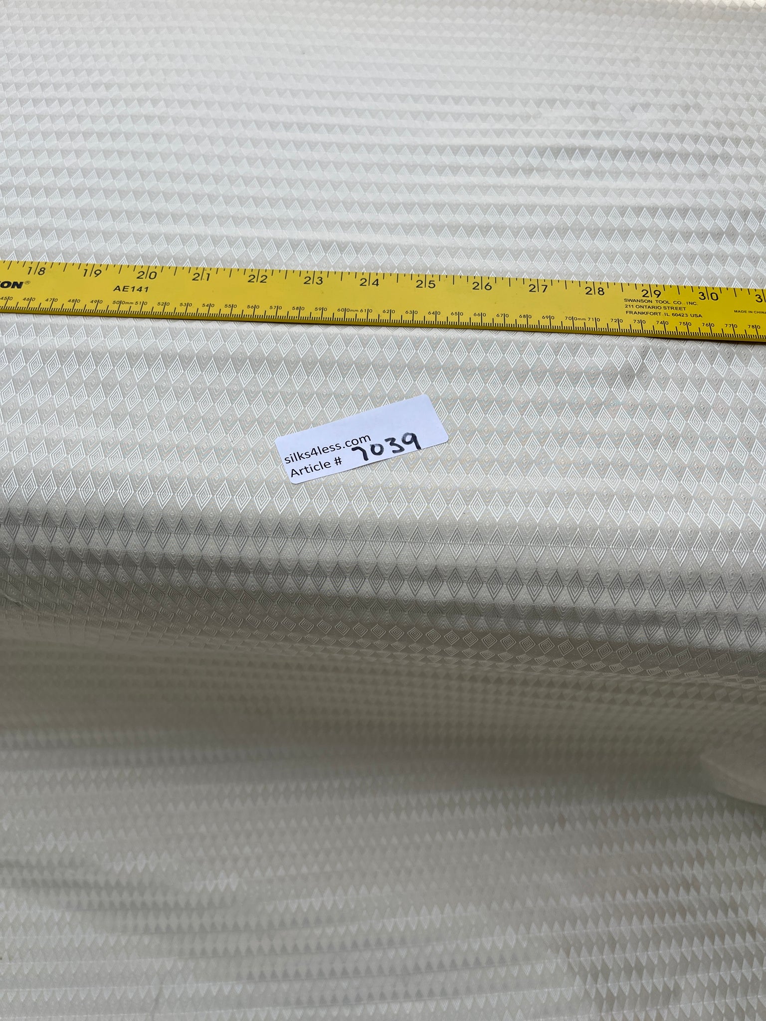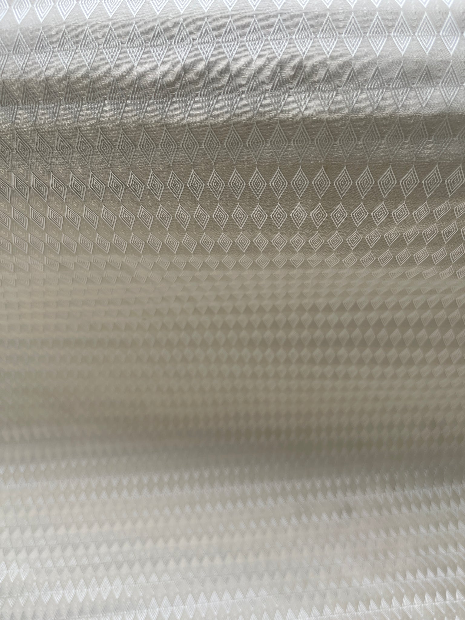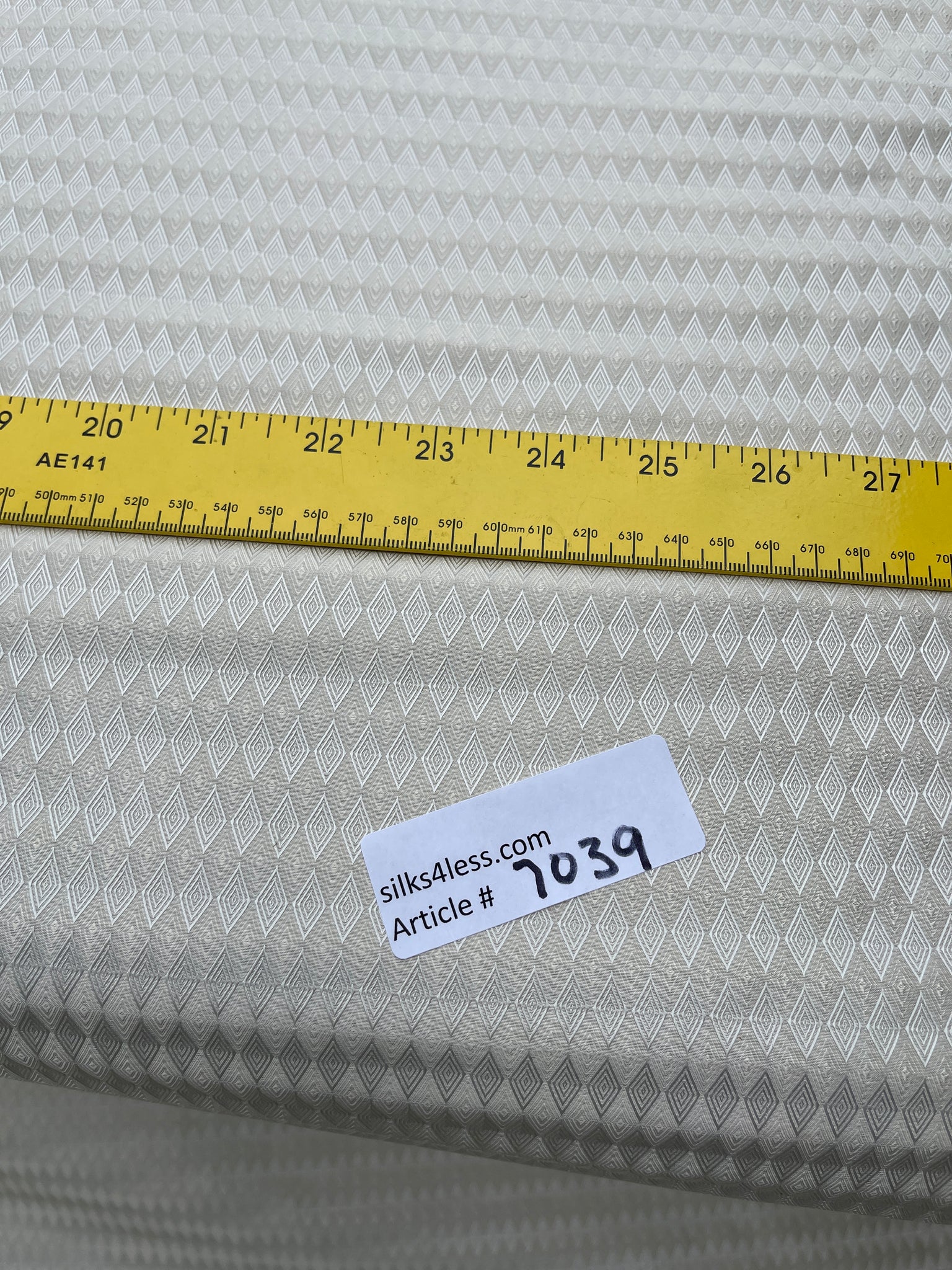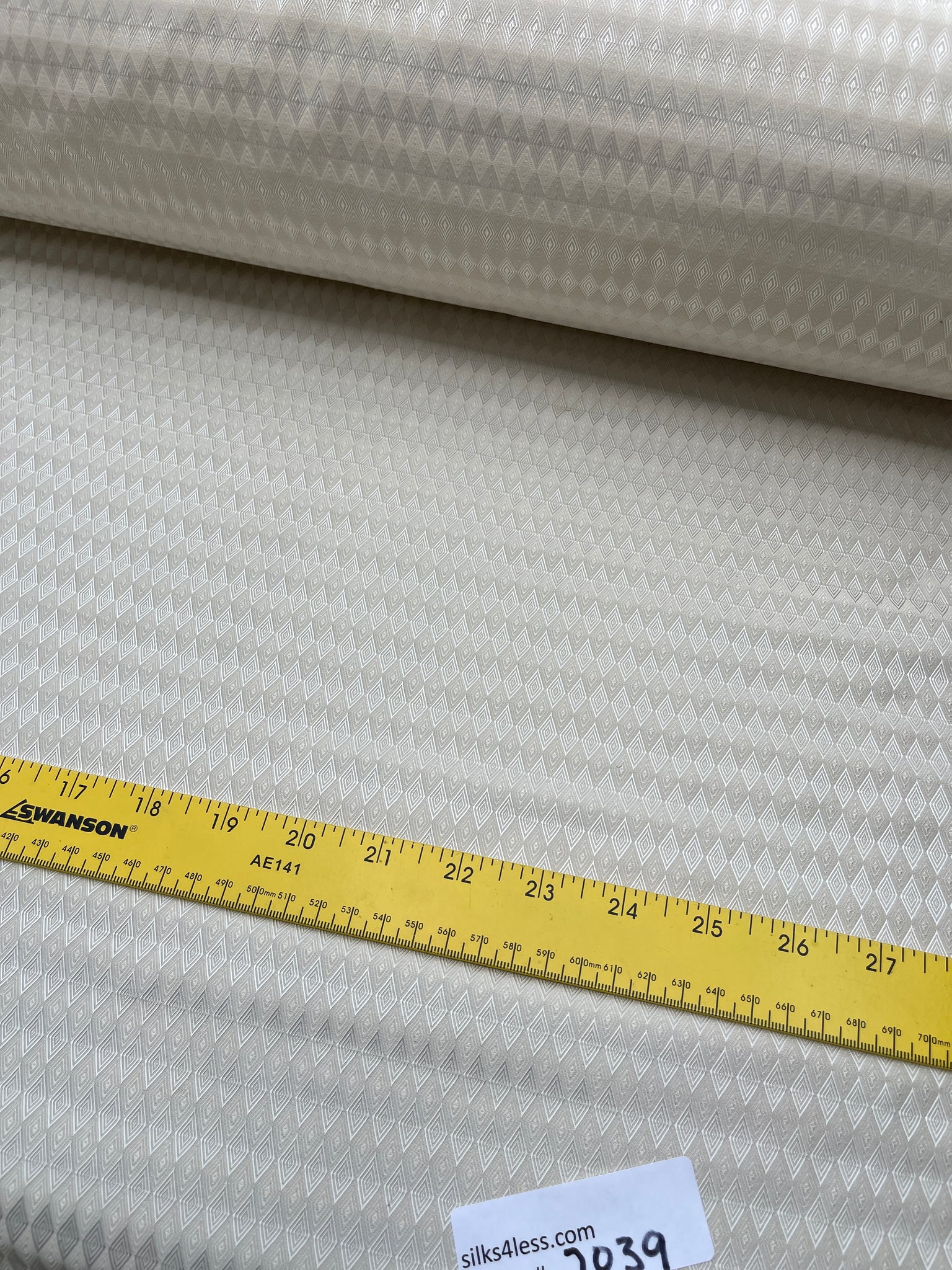 High end silk satin jacquard fabric, Diamond pattern design woven, approximate size ⅜” x ¾” in Ivory/Gold. Pattern going up the roll.