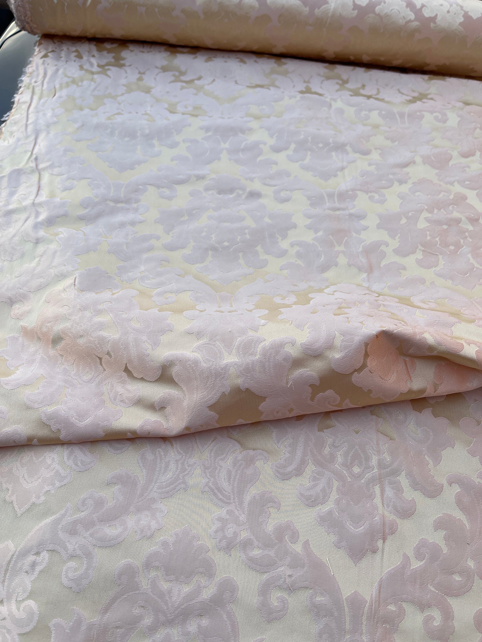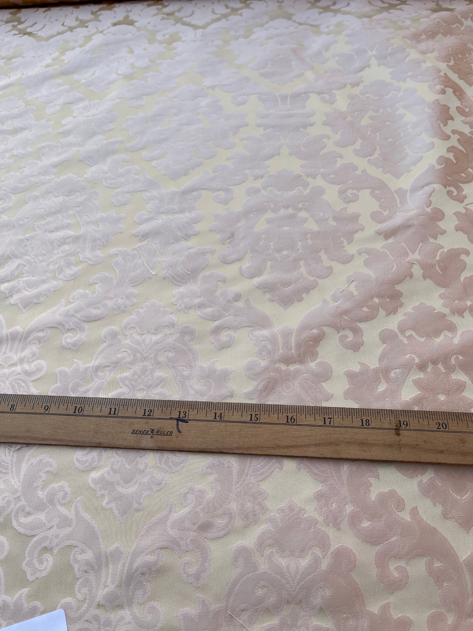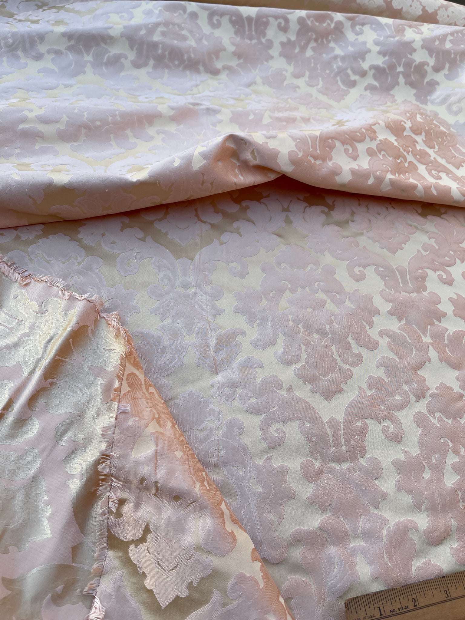 Great quality heavy Silk Satin Damask fabric in Peach Pink/Gold combination, approximate repeat of the pattern 8 5/8”. High end product.