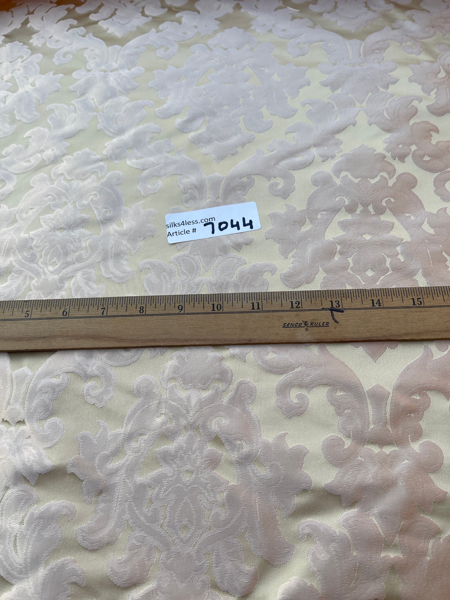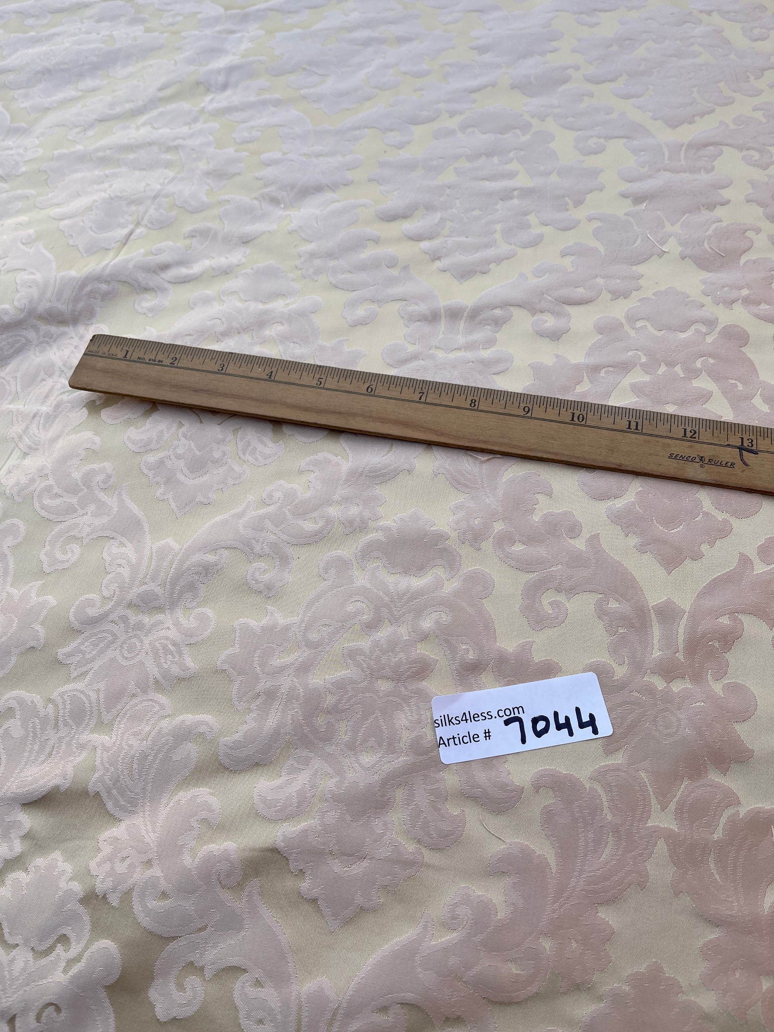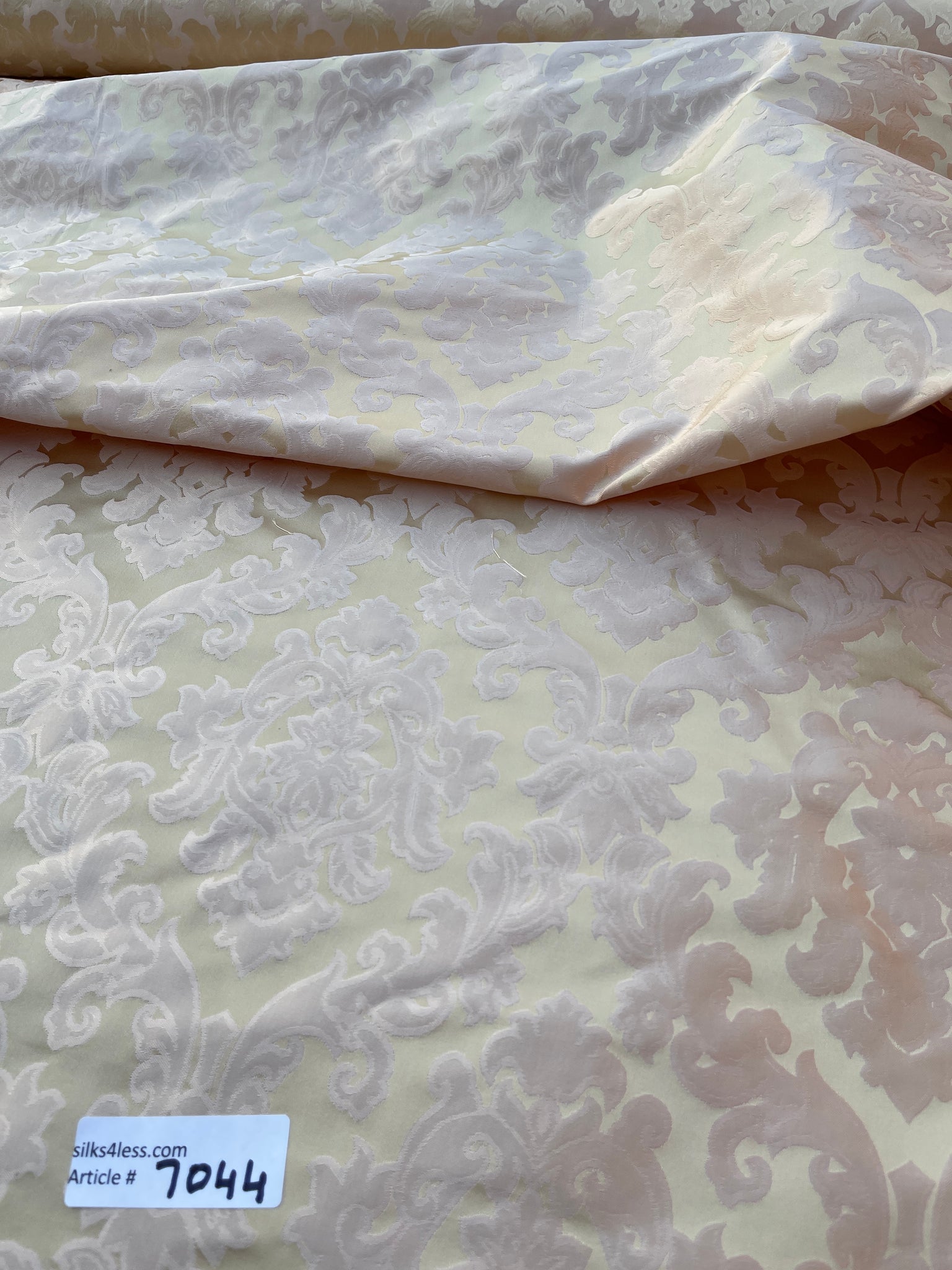 Great quality heavy Silk Satin Damask fabric in Peach Pink/Gold combination, approximate repeat of the pattern 8 5/8”. High end product.