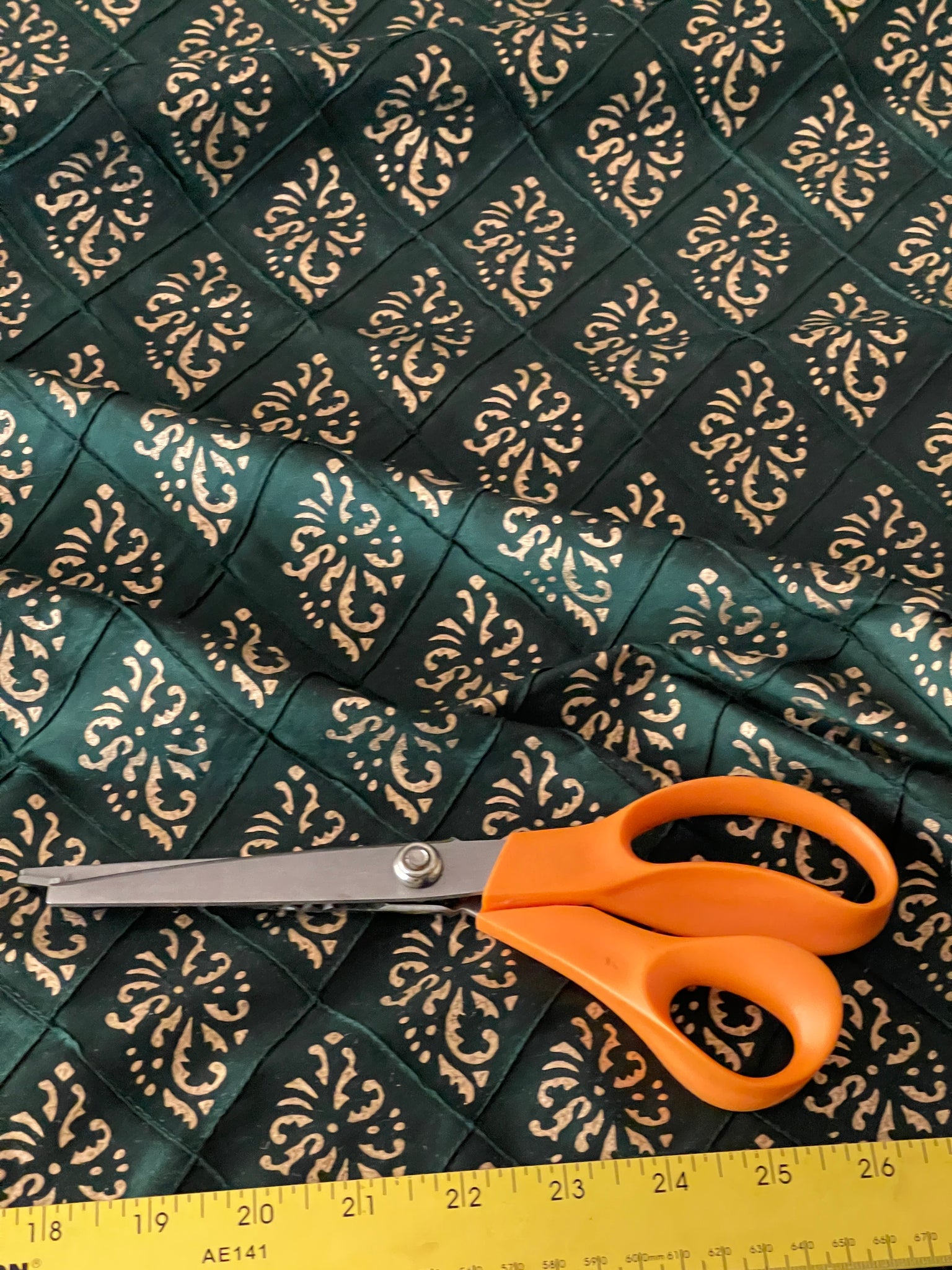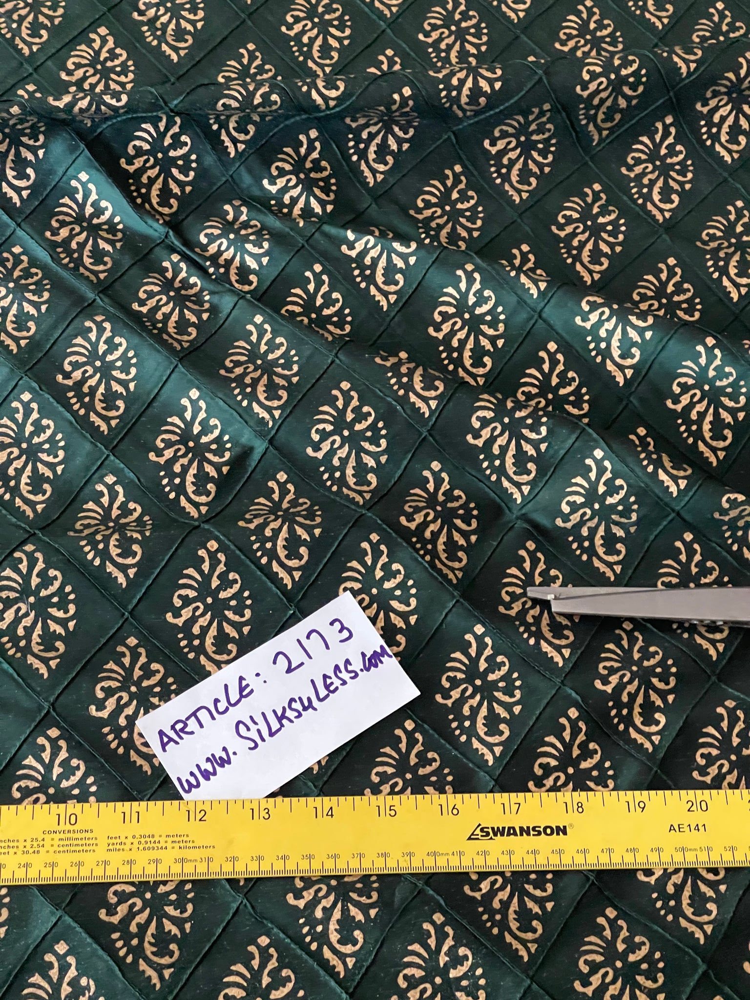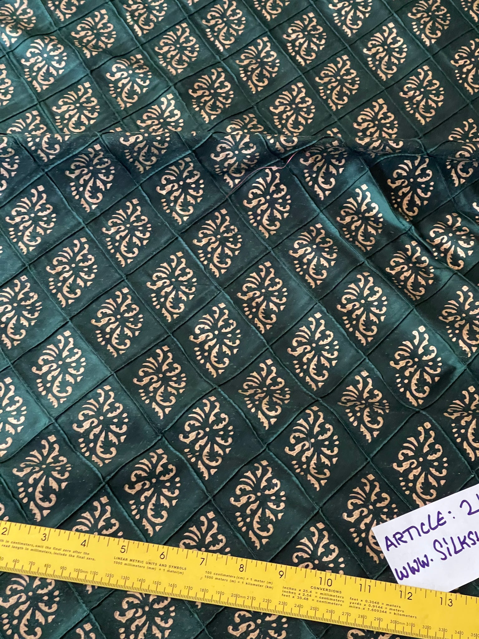 Designer quality Silk shantung in gorgeous Moss Green quilted, Print in Golds. Approximate raised quilt size 2 3/4 X 3 1/4". High end product.