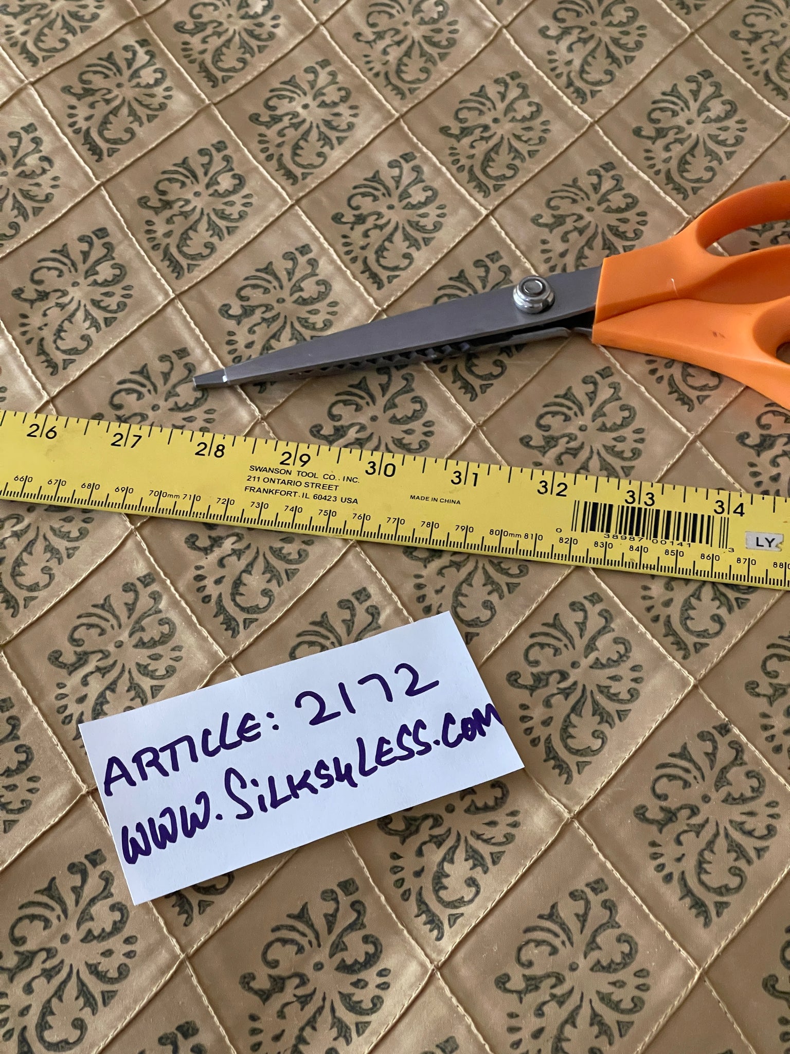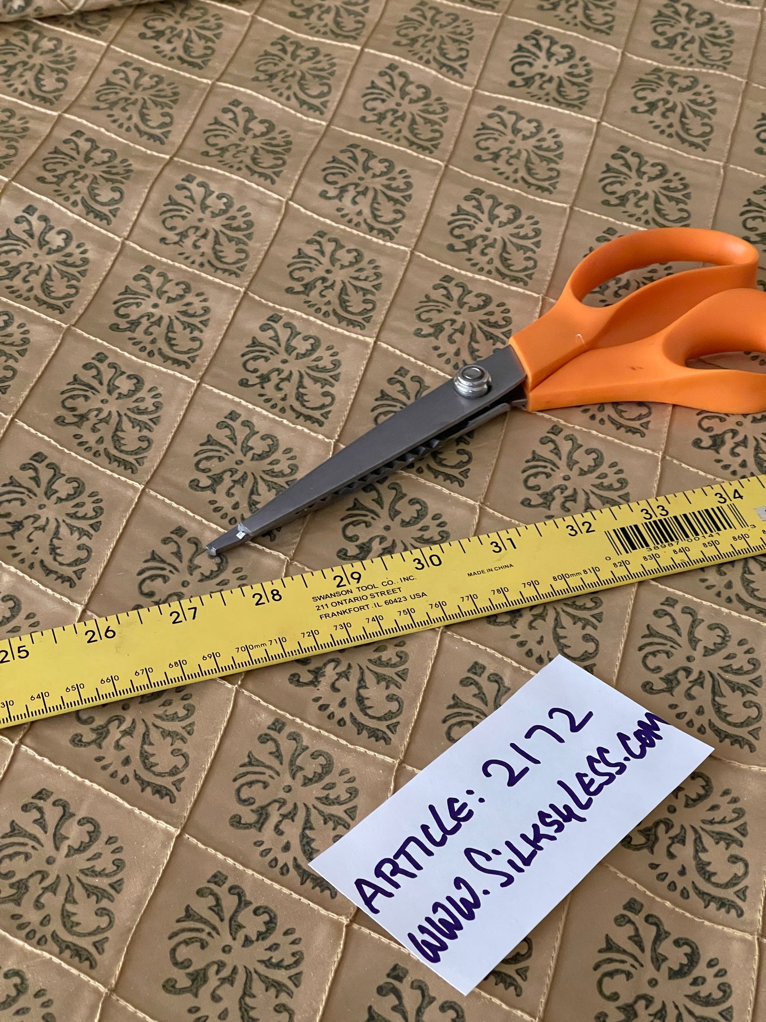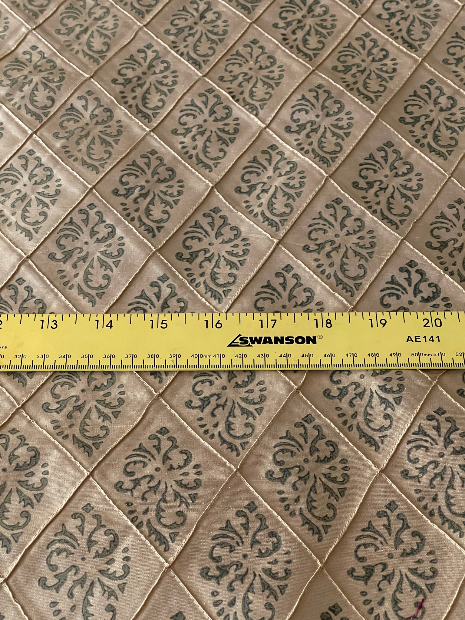 Designer quality Silk shantung in gorgeous Beige Gold, quilted. Printed in tone on tone Green/Beige colors. Approximate raised quilt size 2 3/4 X 3 1/4". High end product.
