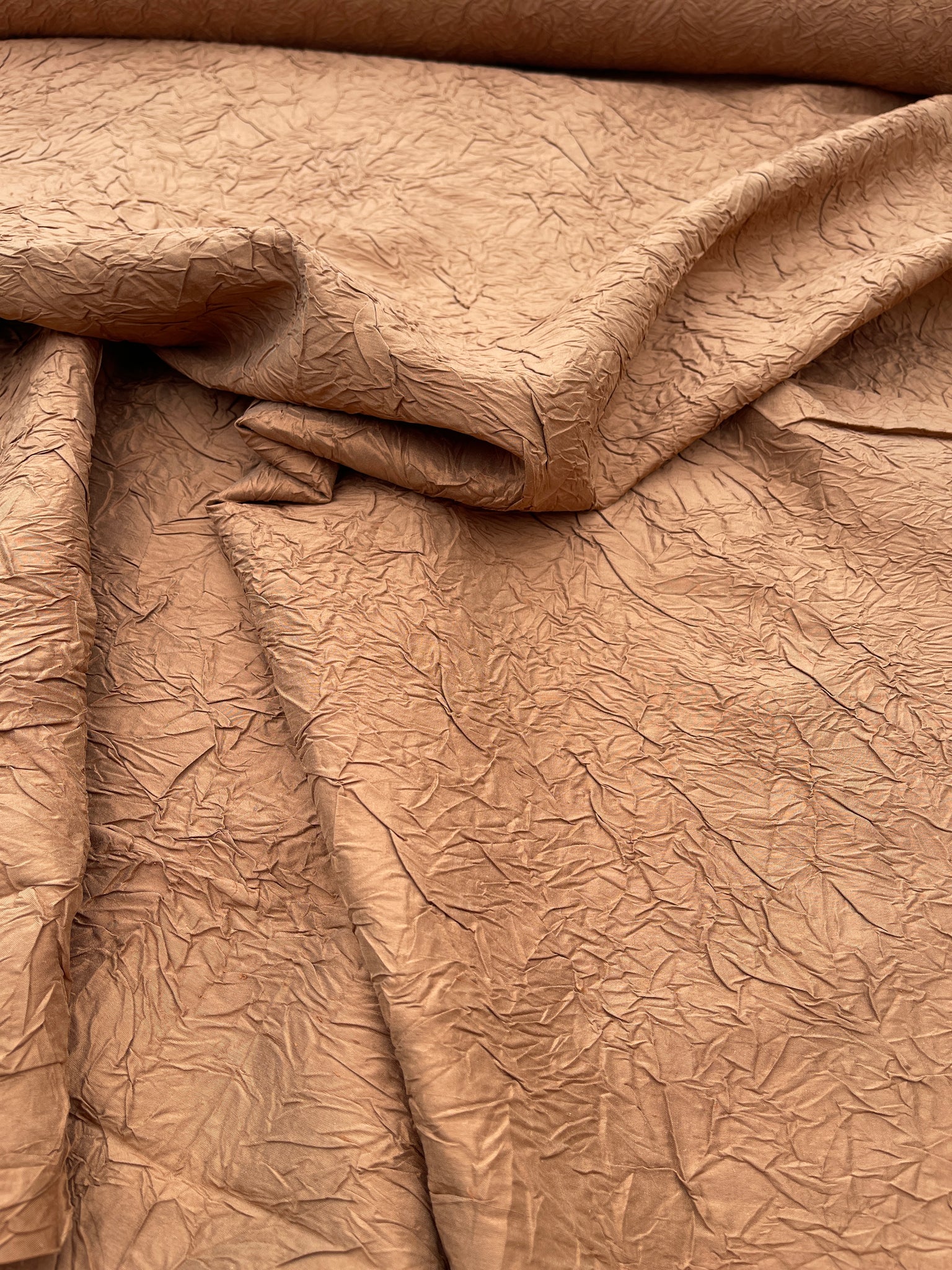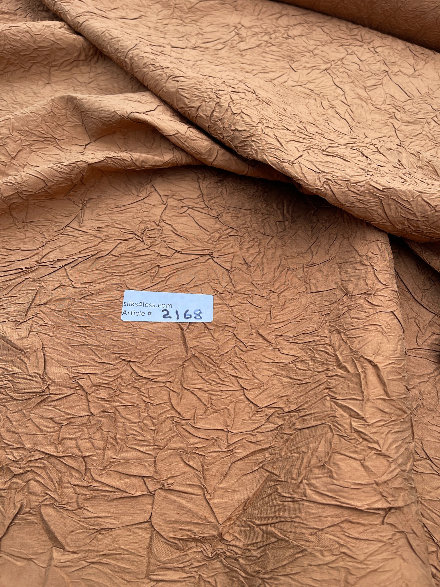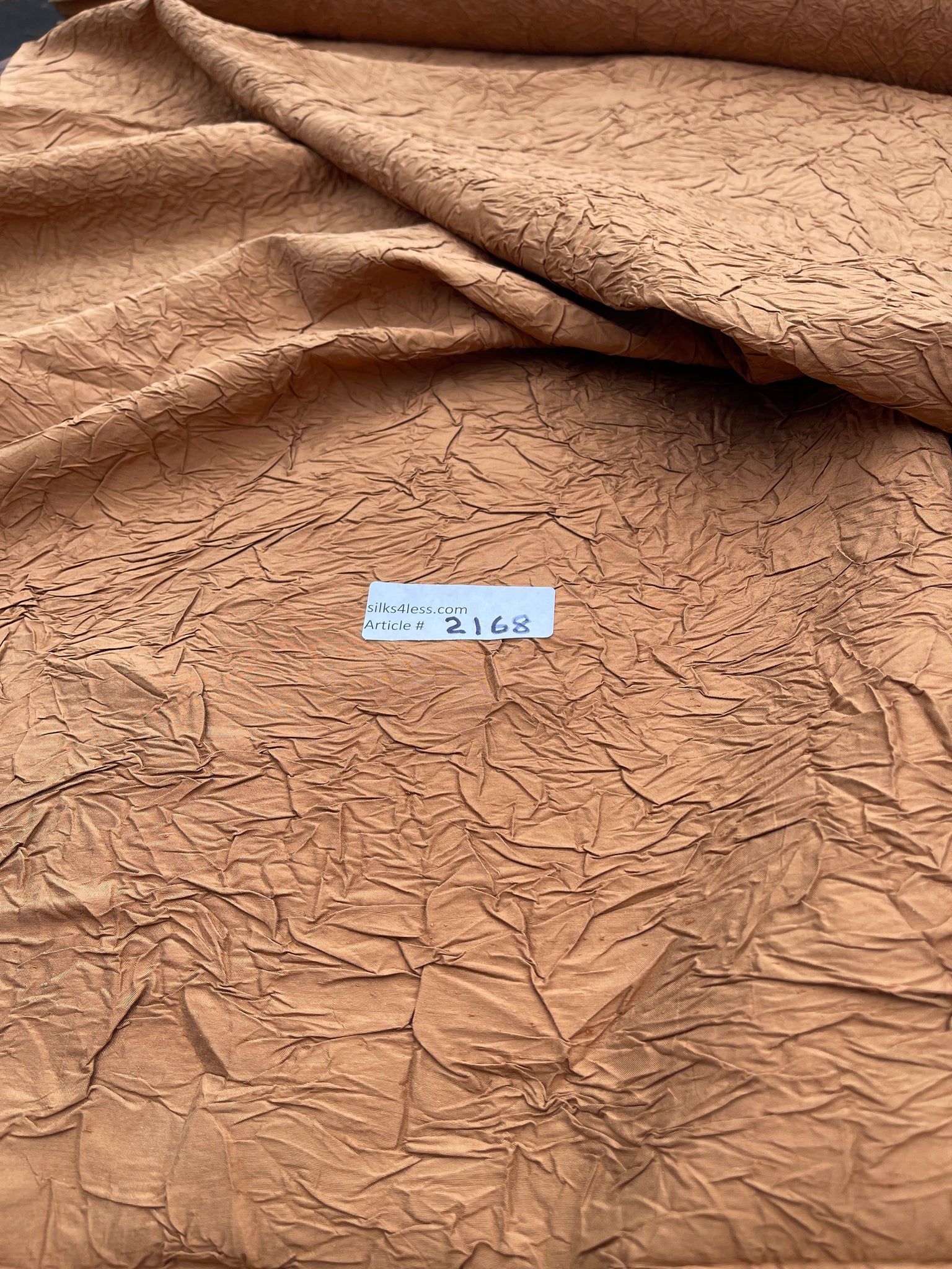 Silk Shantung crushed is a unique fabric made out of high quality shantung silk, medium weight and has a pleasant sheen to it. Silk fabrics are first manufactured and then are crushed deliberately through a special process to give the fabric a special texture and pattern. Original width of the fabric 60” after the fabric goes through the crushing process finished width is 53-54”.
