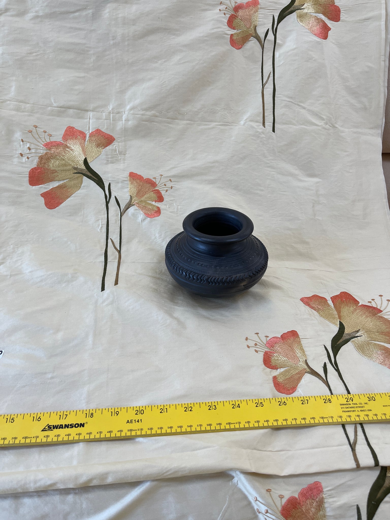 Exquisite quality embroidery, silk shantung base in Ivory, gorgeous piece of heavy floral embroidery pattern in Peach and Greens. Approximate size of each flower 9.5" Wide and 12" long, approximate repeat 25". Design runs up the roll.
