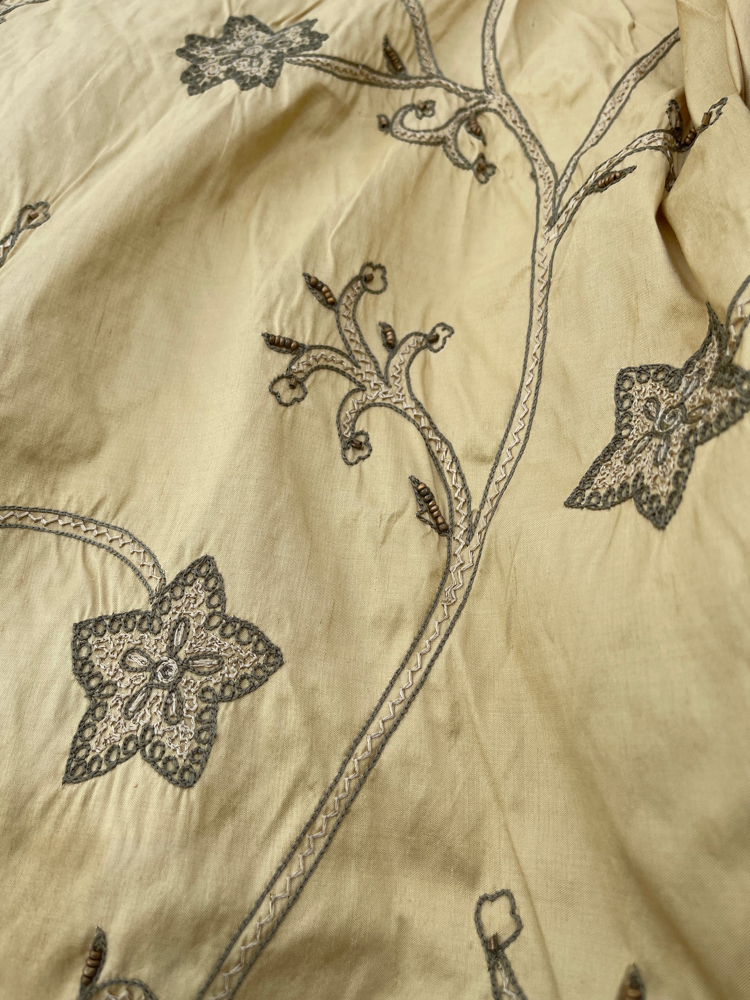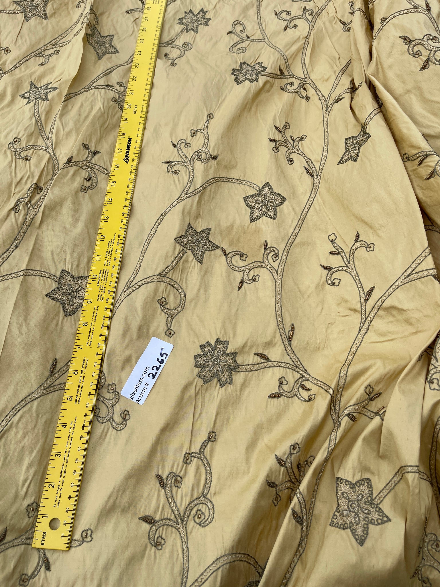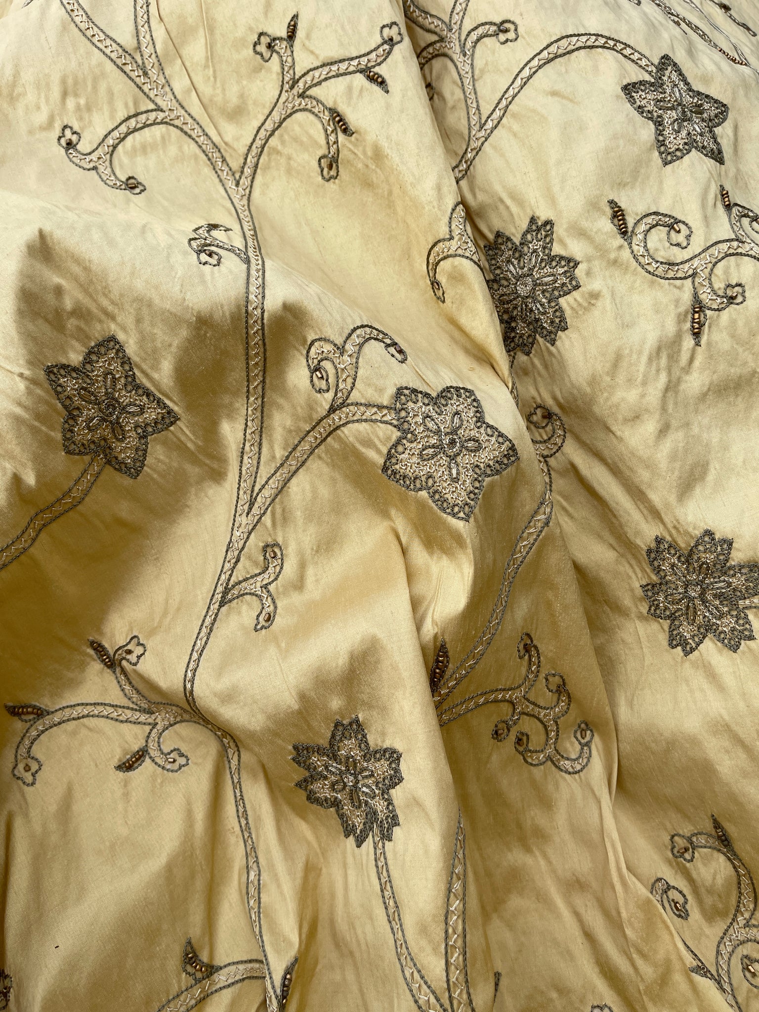 Silk shantung base in Banana Gold shade, gorgeous floral design going selvedge to selvedge, not up the roll. Thread Embroidery in Greens and tone on tone colors plus hand embroidered beads all over.