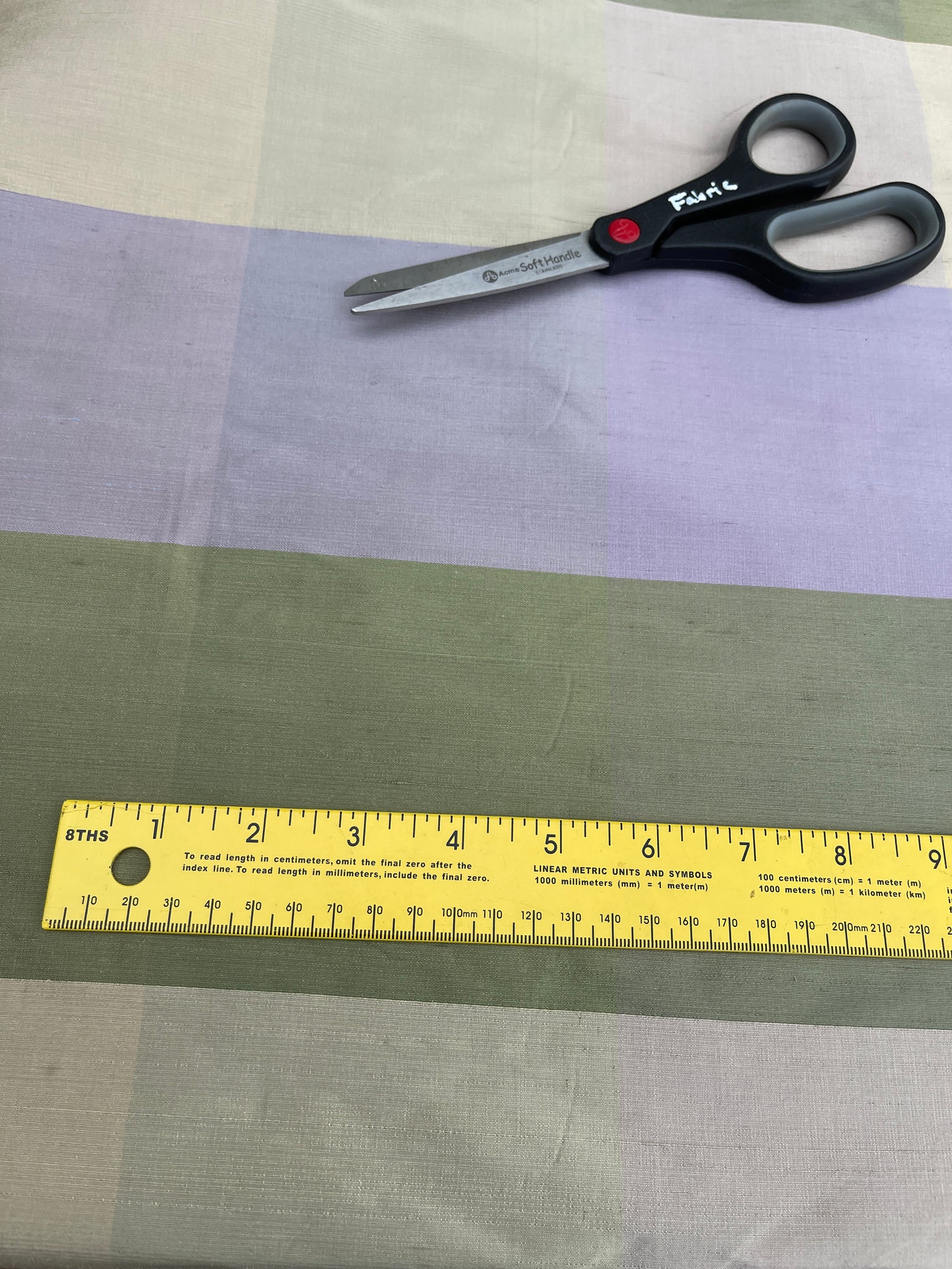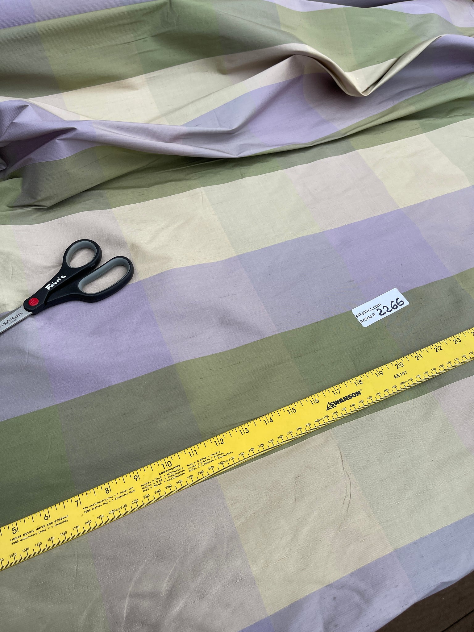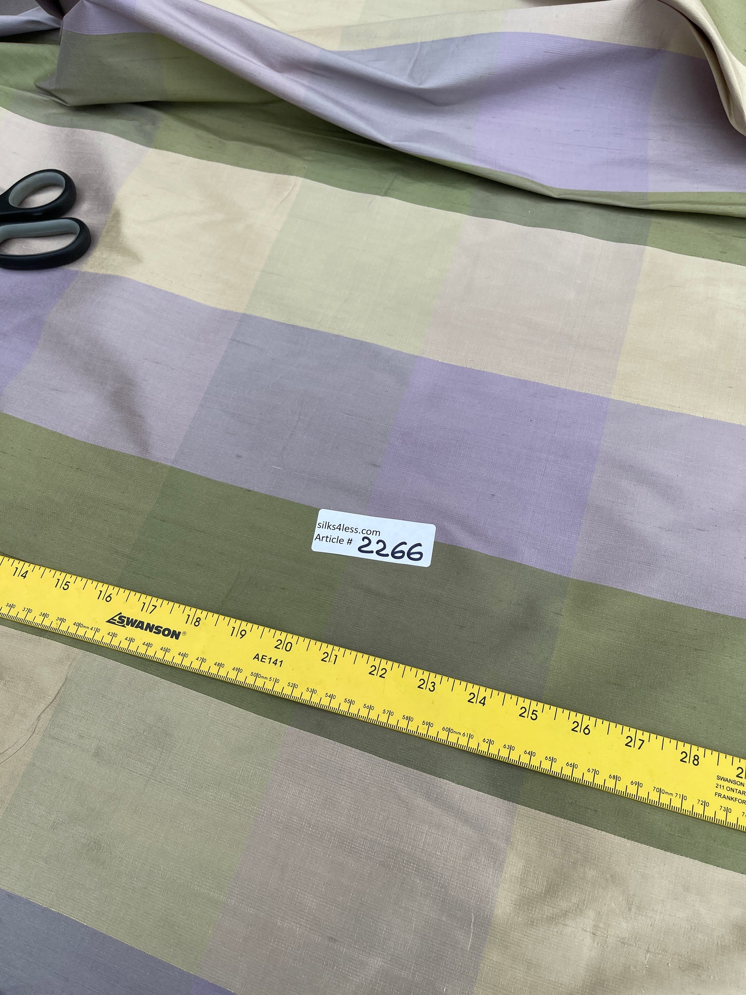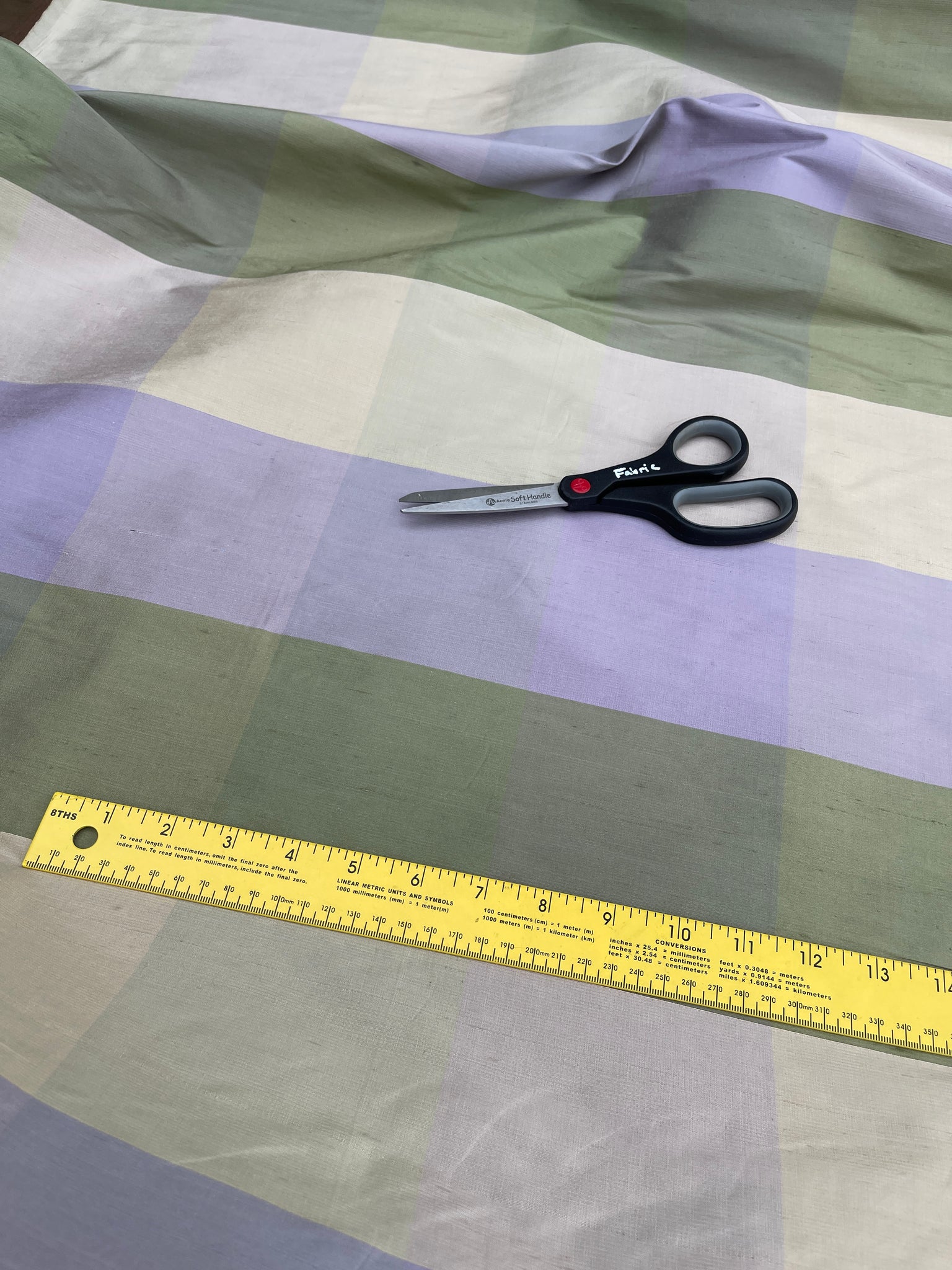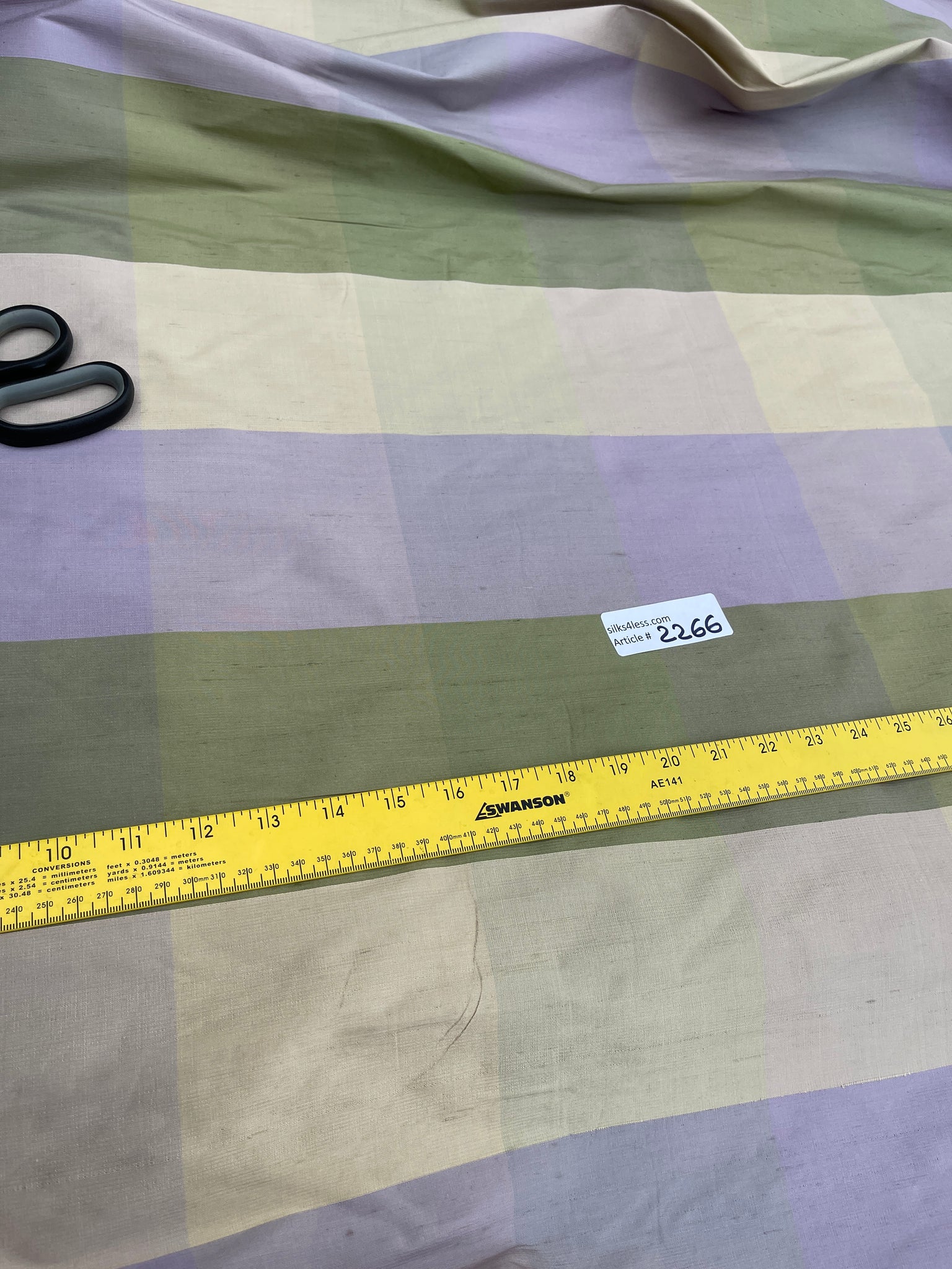 High and heavier quality silk shantung plaid in Greens, Lilac, Ivory and light Gray tones, approximate check size 4.4” x 4.4” and vertical and horizontal repeat 13.4”. Gorgeous shantung plaid in nice soft colors.