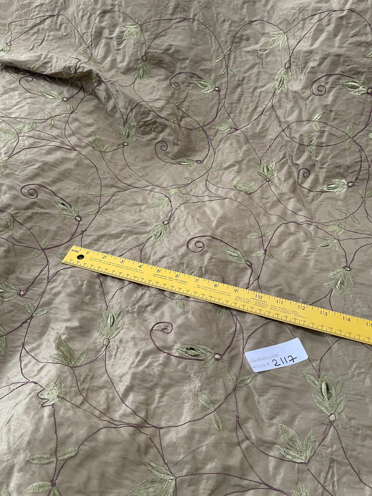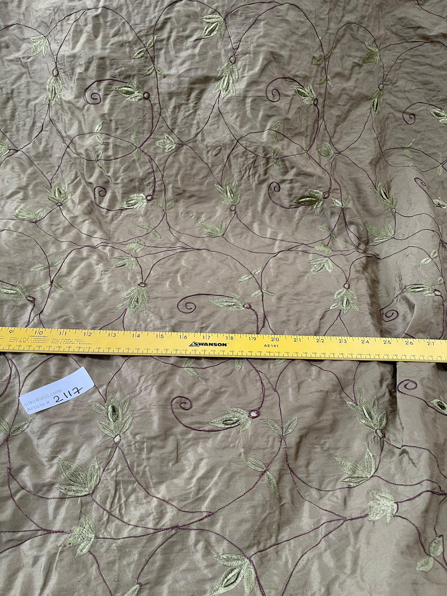 High quality silk shantung base in Green shade, tone on tone floral pattern going up the roll, raised embroidery in Greens and big circles are embroidered with Chocolate shade thread, any questions please let me know.