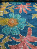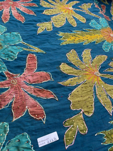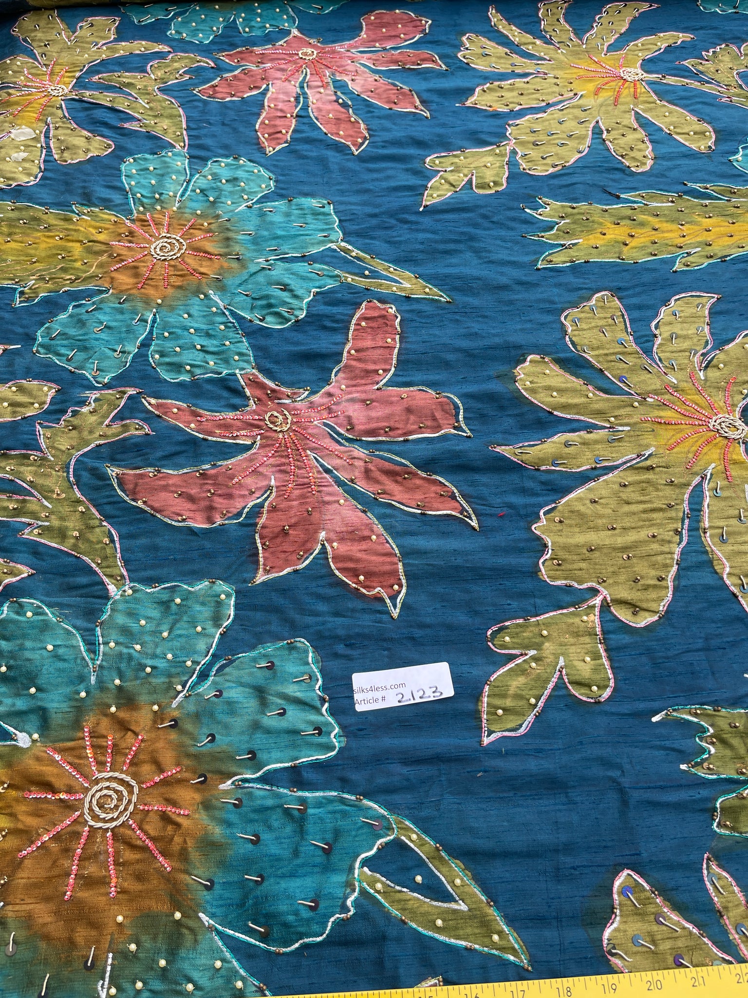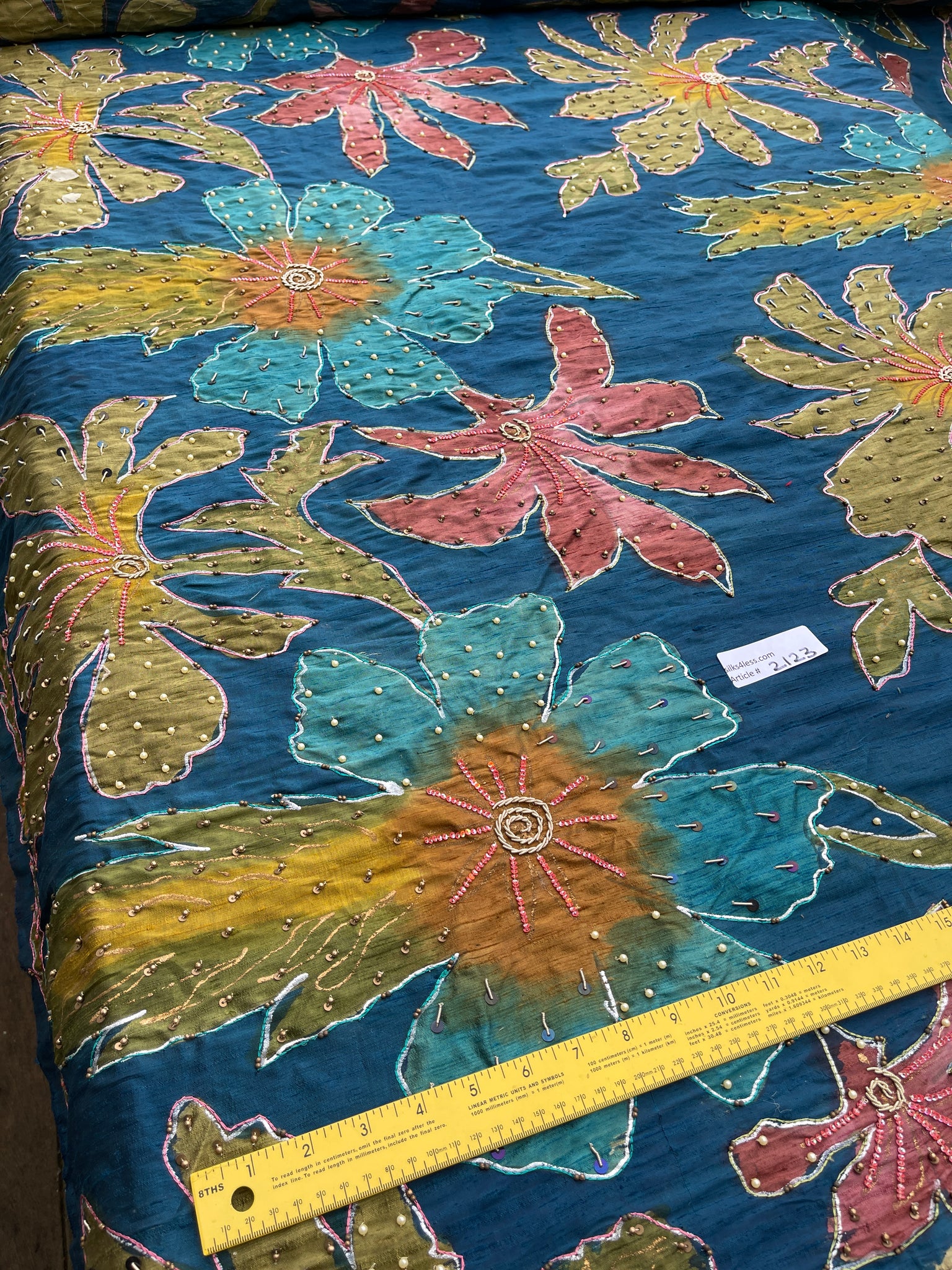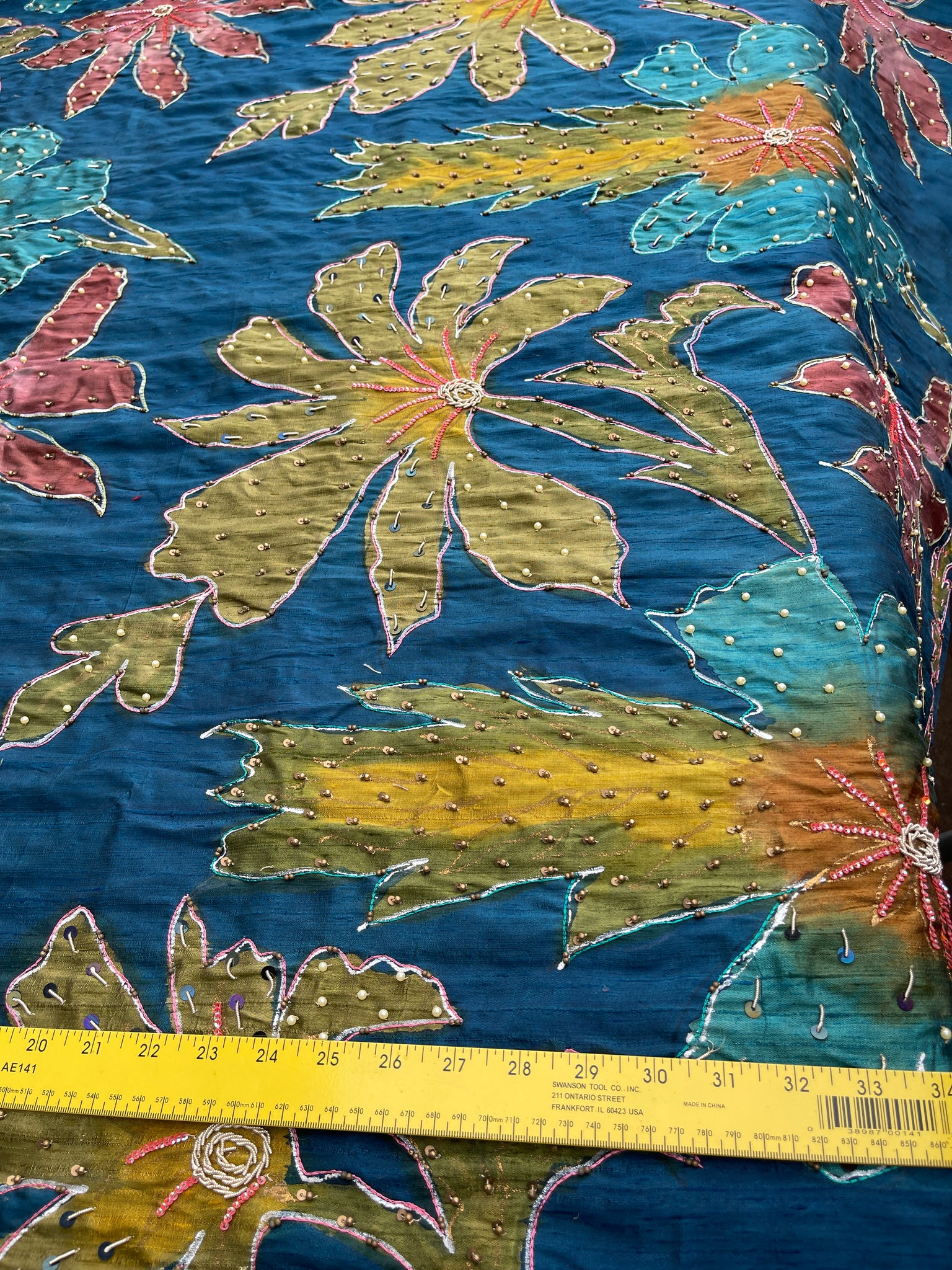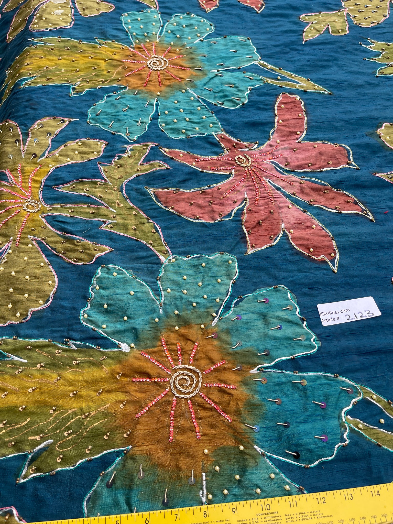 Silk slubby dupioni in gorgeous iridescent Blue, unique floral pattern, embroidered outline, hand painted each and every flower with different colors, also every flower is hand embroidered with matching sequence and matching beads. Colors in the flowers are hand painted in Turquoise Blue, Copper, Olive Gold, Rare find.