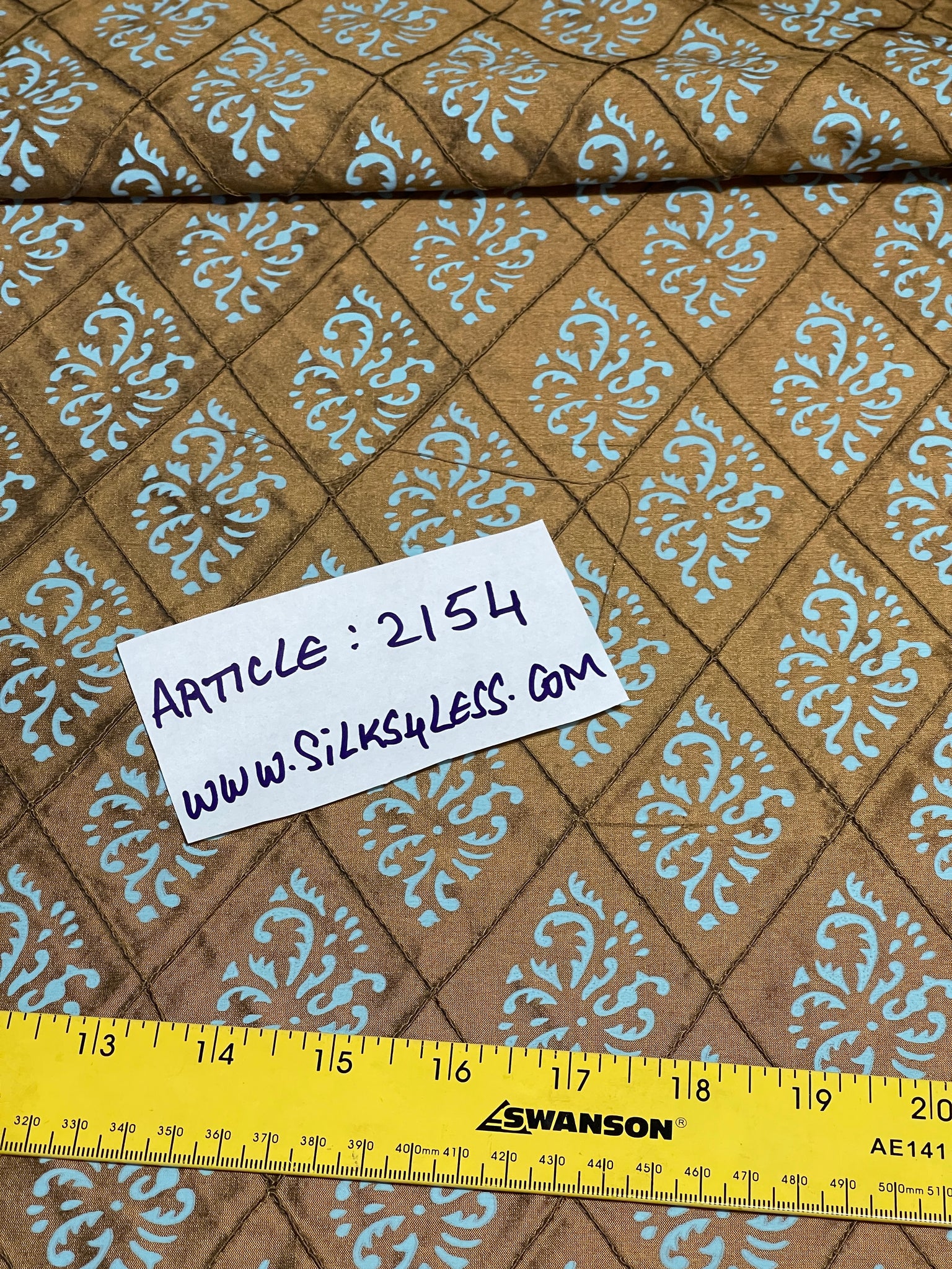 Designer quality Silk shantung in gorgeous Burnt Gold quilted, block print in gorgeous Blues. Approximate raised quilt size 2 3/4 X 3 1/4". High end product.
