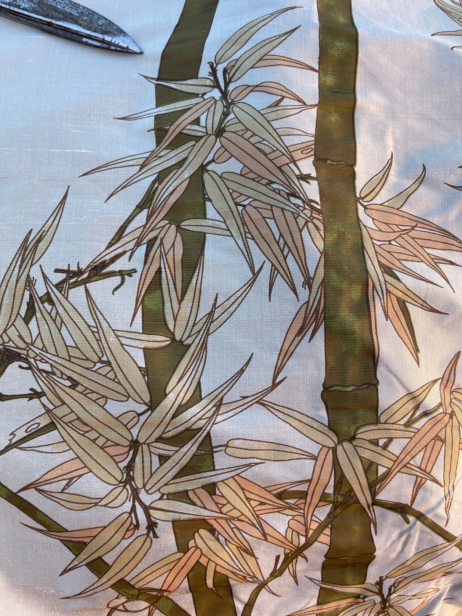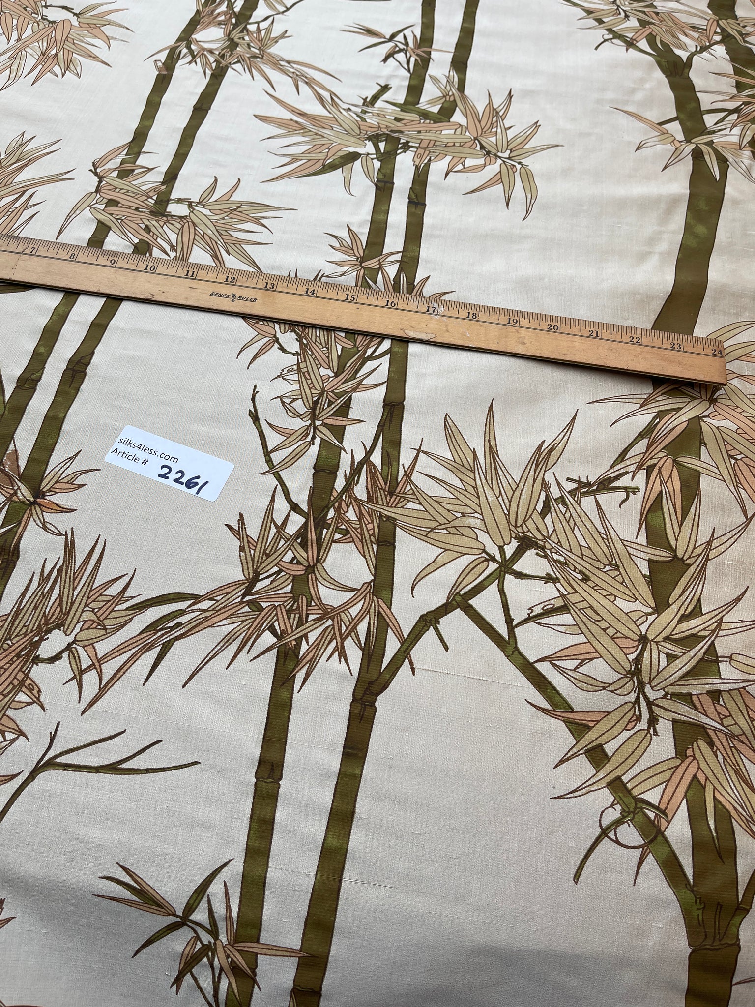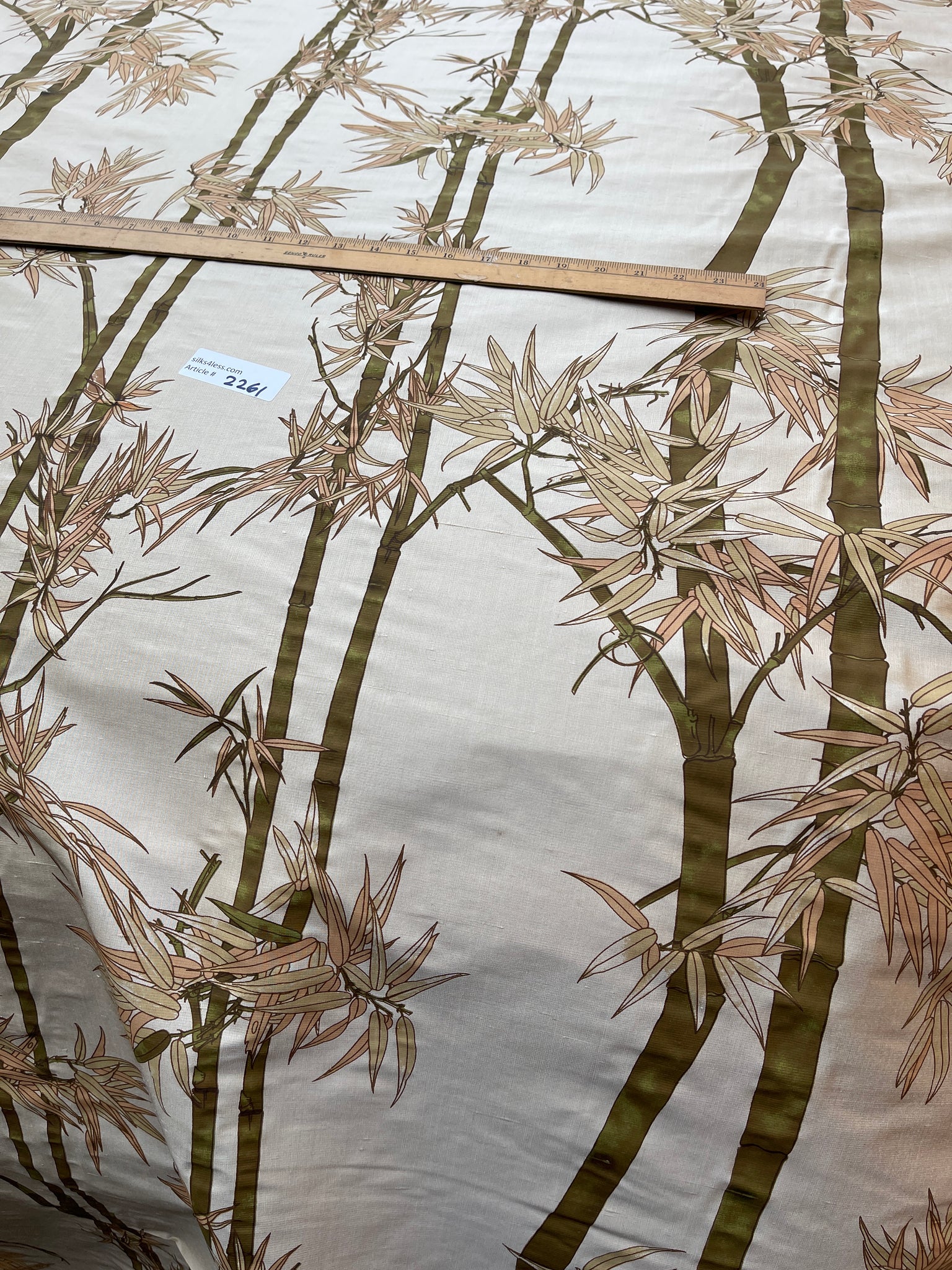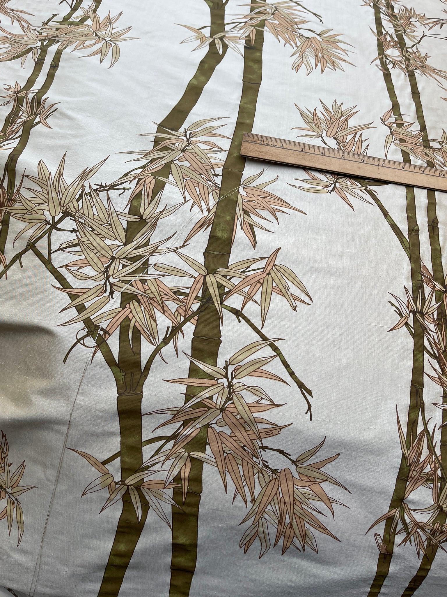 Silk shantung base in Ivory shade, gorgeous damask pattern printed in Golden Yellow. Approximate repeat 13.5"