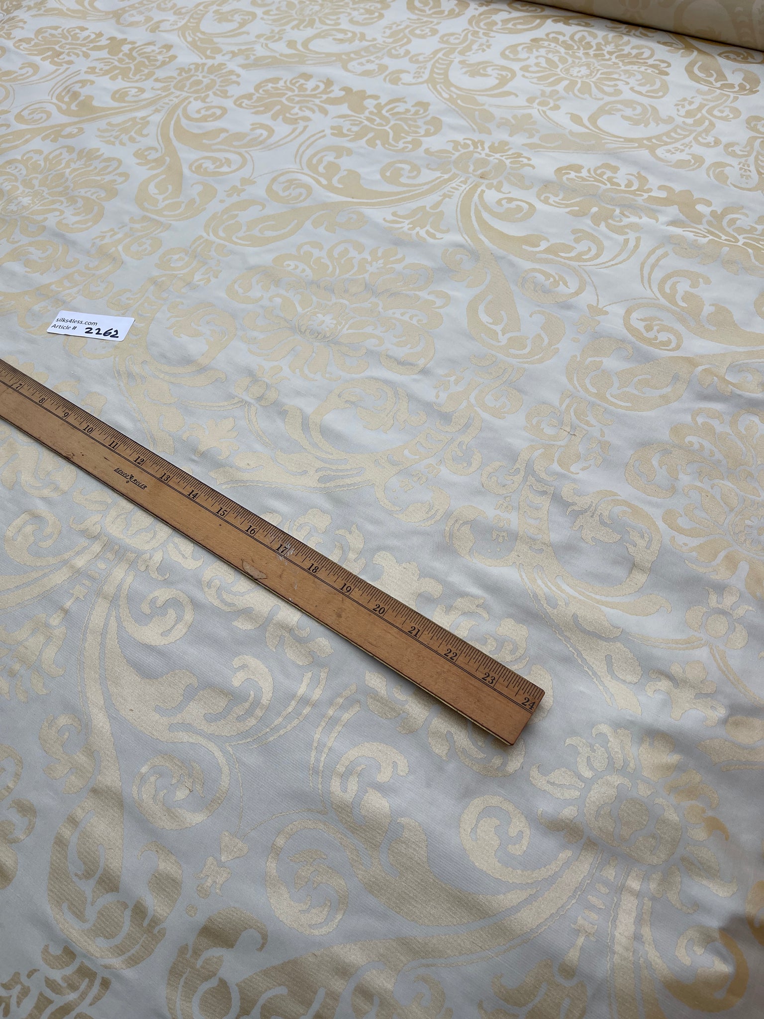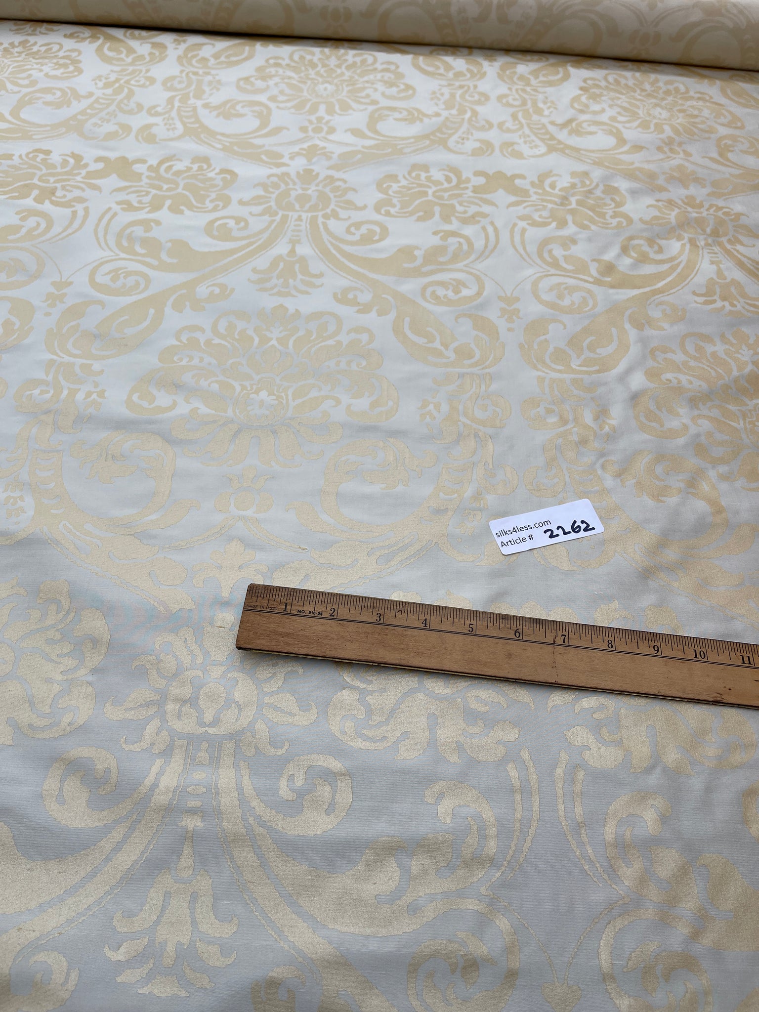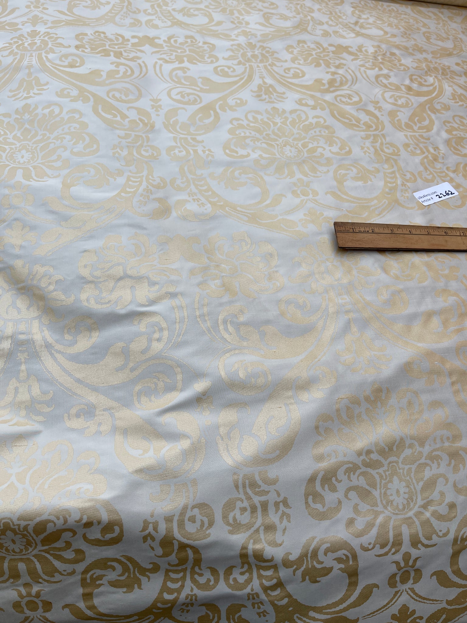 Silk shantung base in Ivory shade, gorgeous damask pattern printed in Golden Yellow. Approximate repeat 13.5"