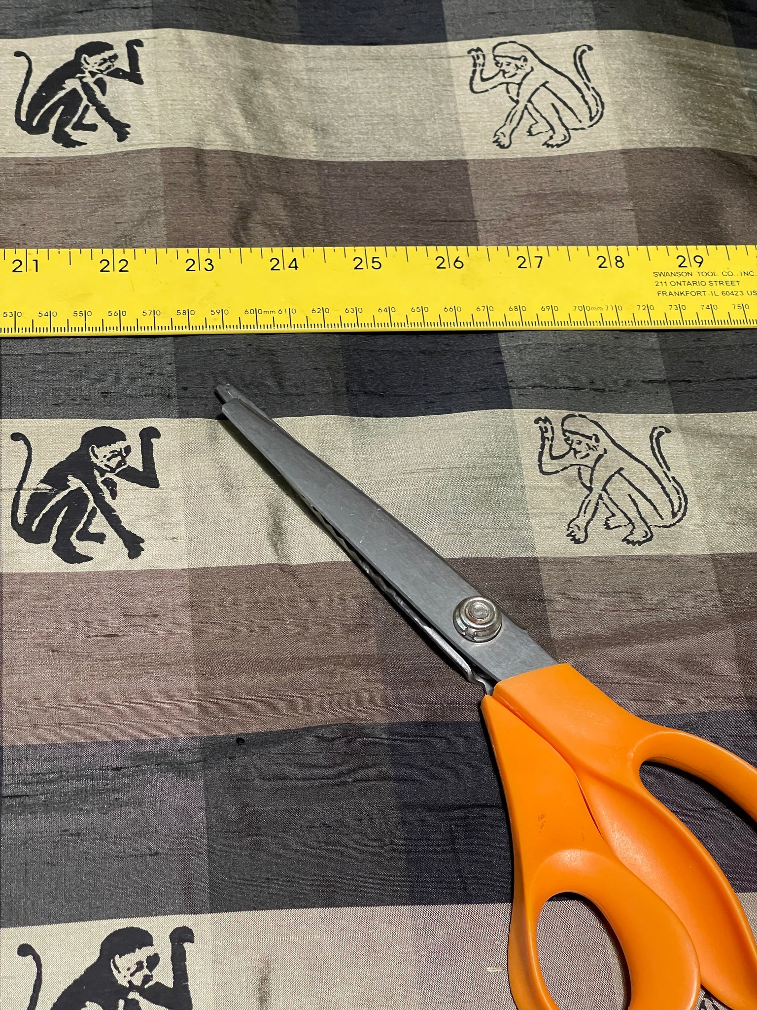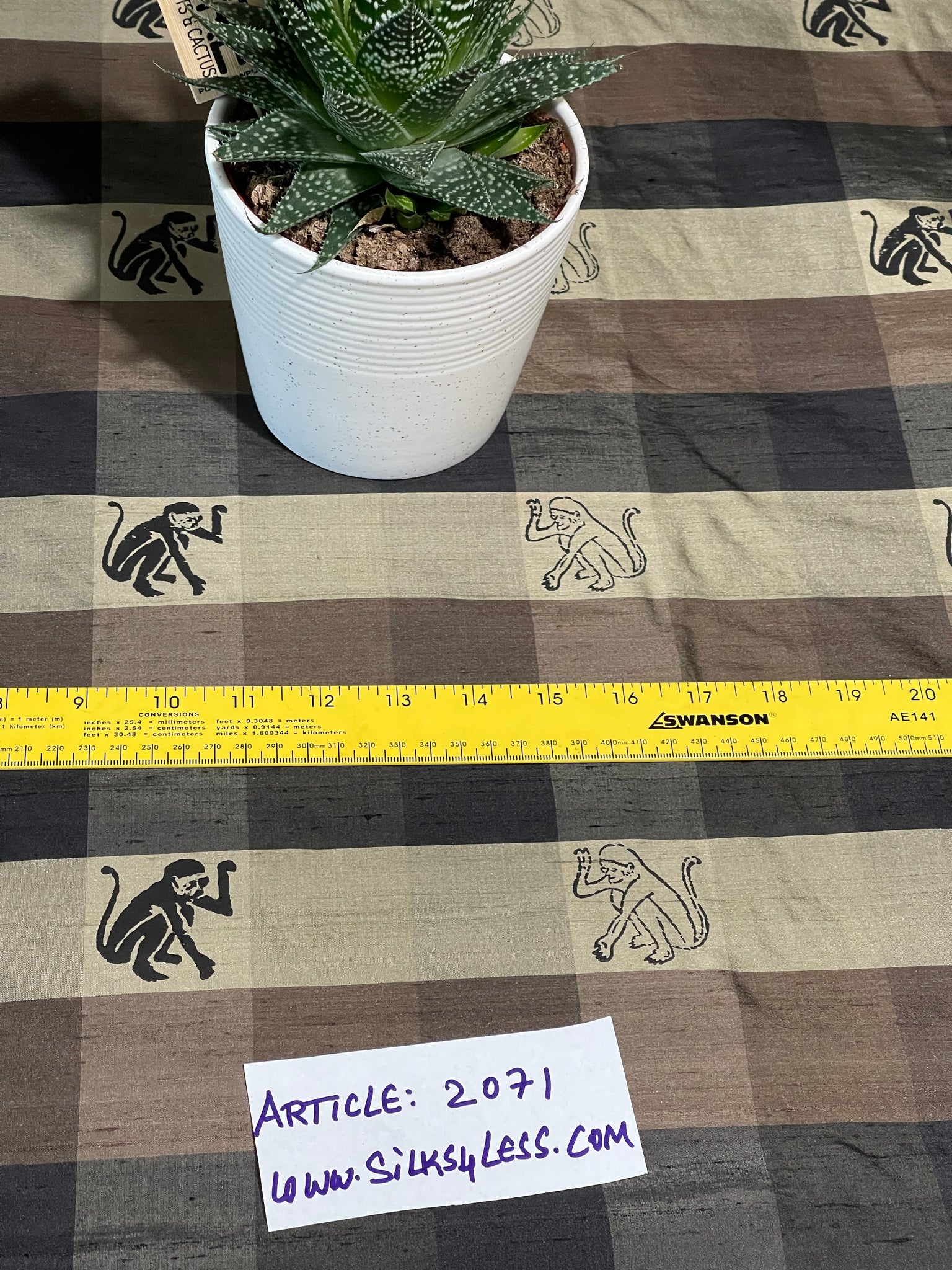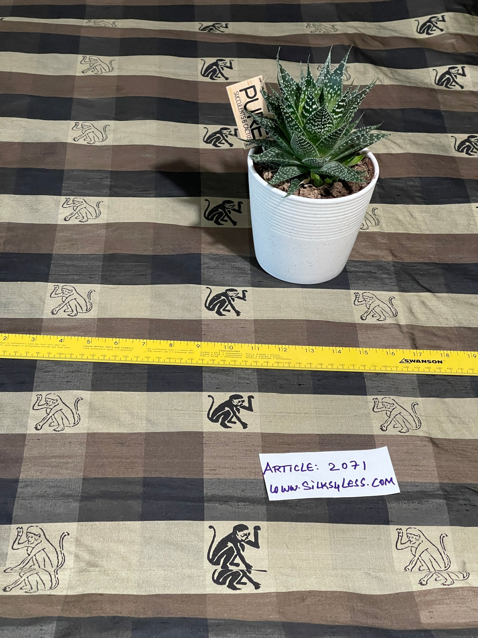 Gorgeous 100% Silk, high quality shantung plaid in Olive Gold and Black with Monkey pattern printed in Black. Approximate check size 2"X2", repeat width wise 6" and length wise 6". Approximate Size of the Monkey print 1 3/4"