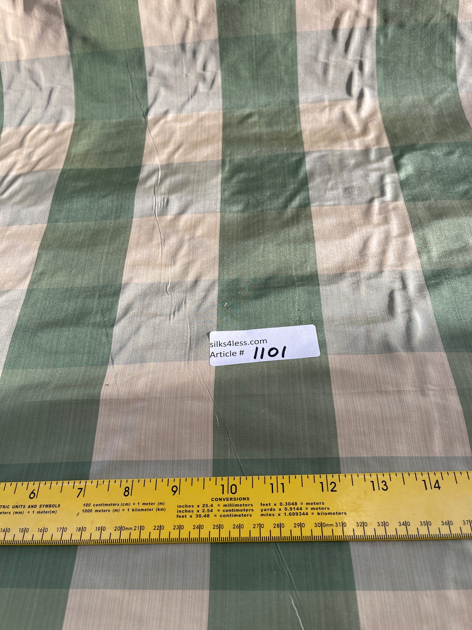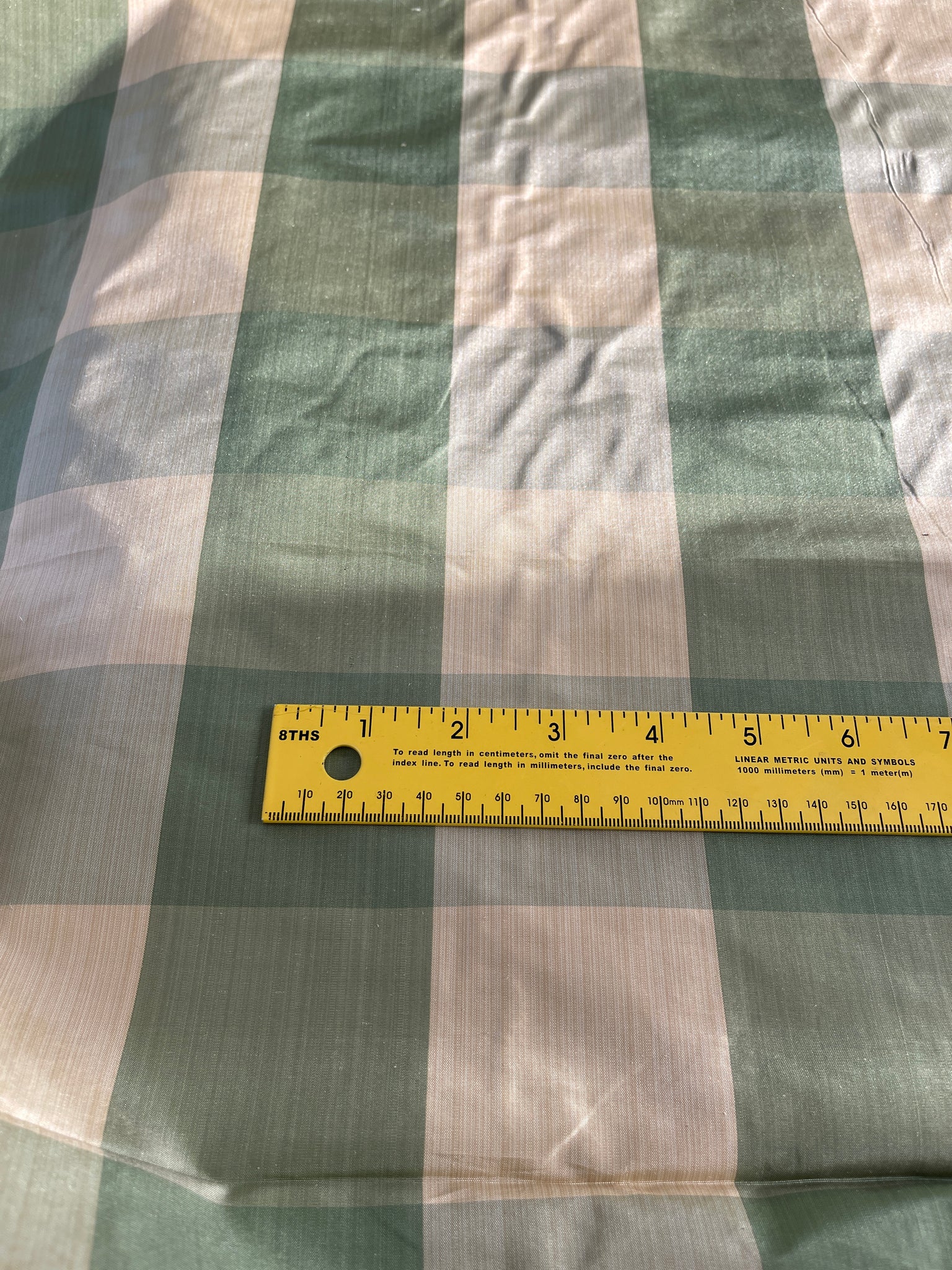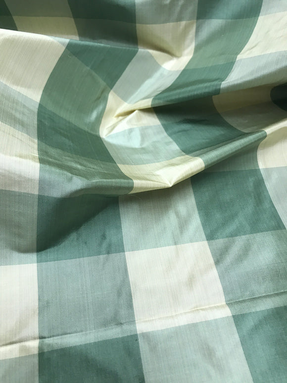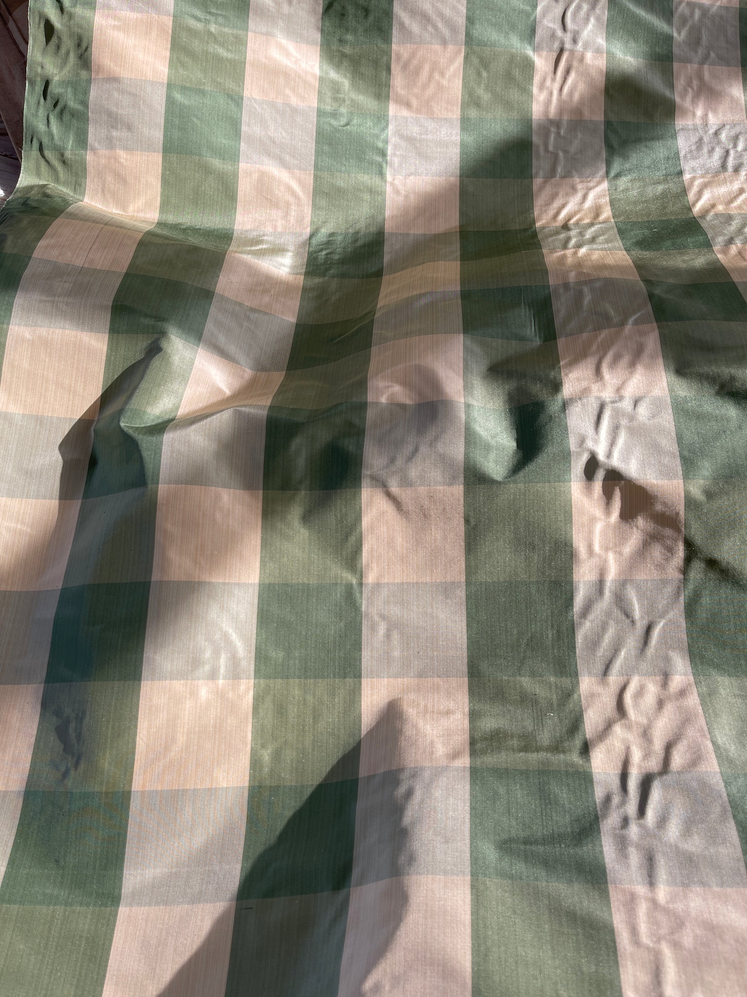 Great body to this silk taffeta plaid, colors Greens and Ivory/Cream tones, approximate check size 2 7/8" x 2 7/8" and repeat 5 1/2".