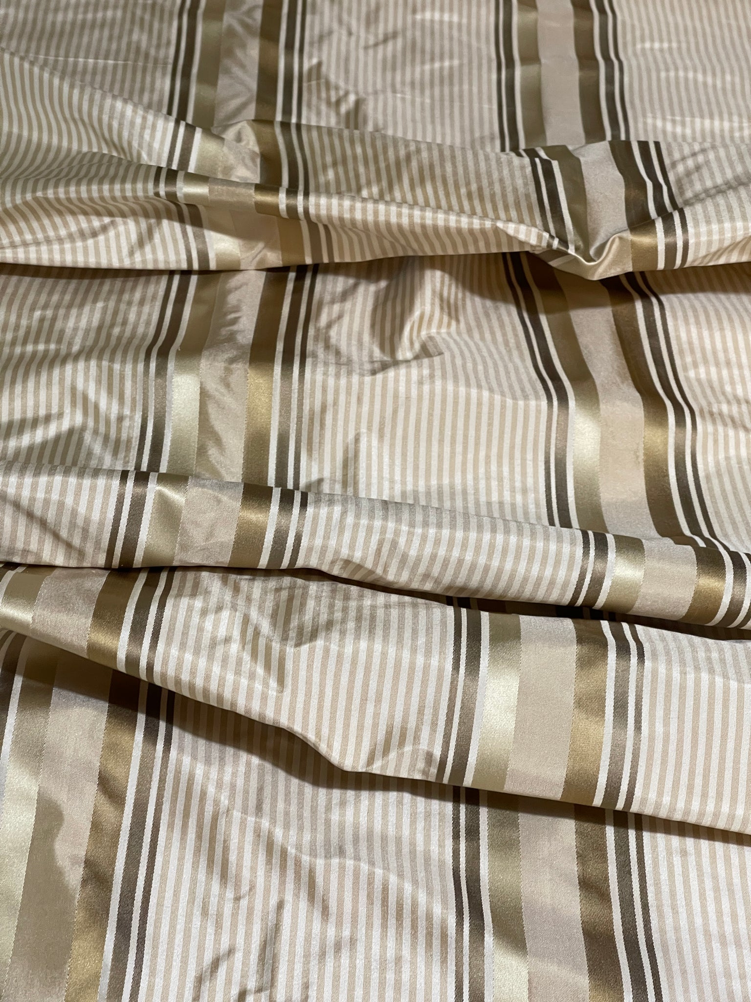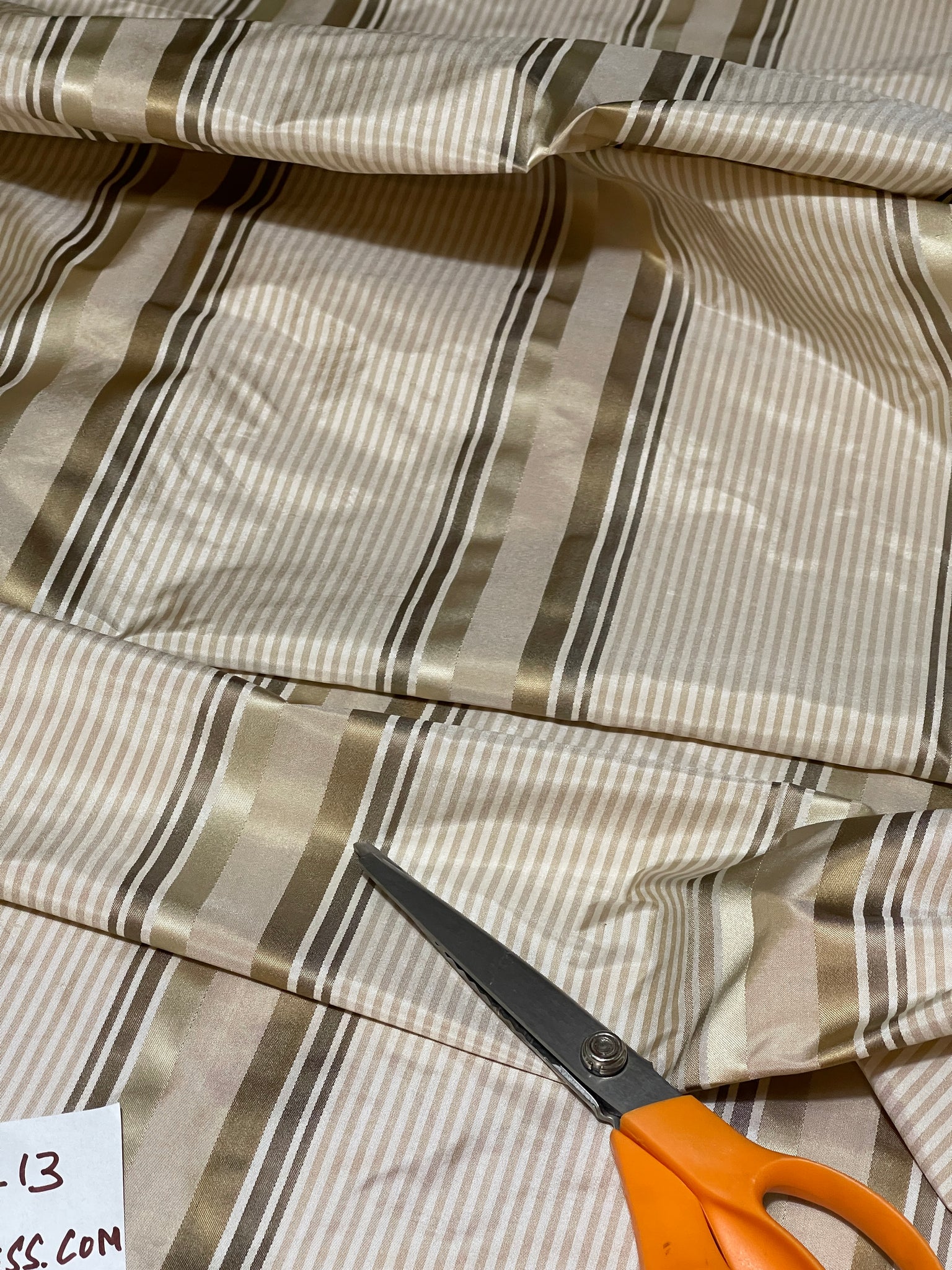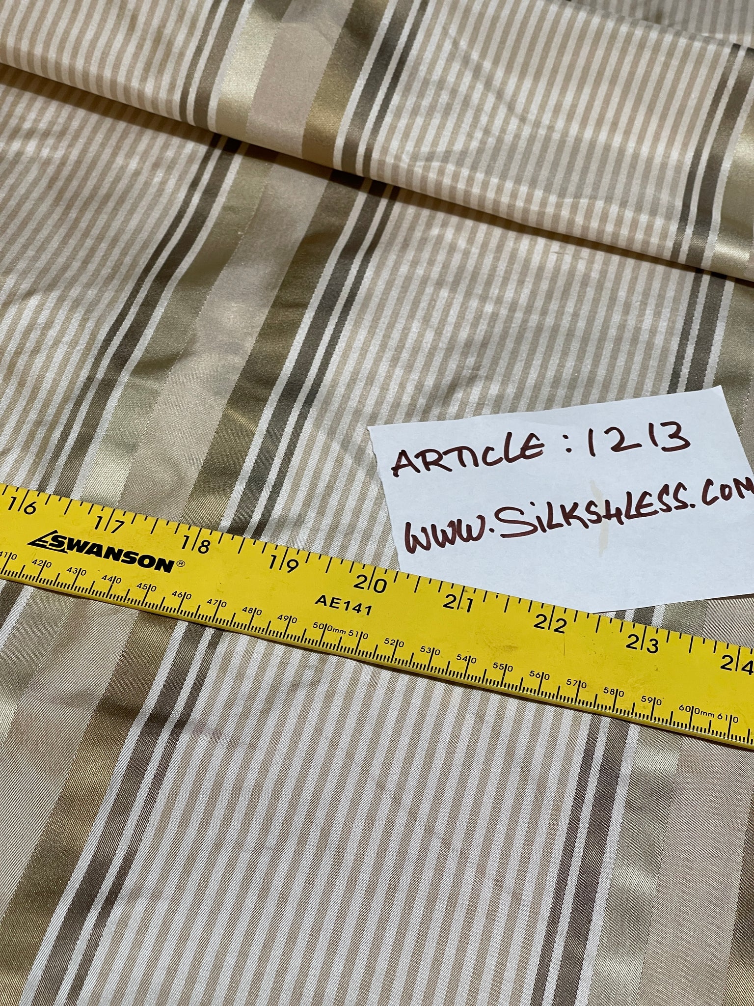Stunning high quality silk taffeta satin weave stripes in Cream, Golds and Beige. Stripes run up the roll, Approximate repeat of the pattern 6 5/8"
