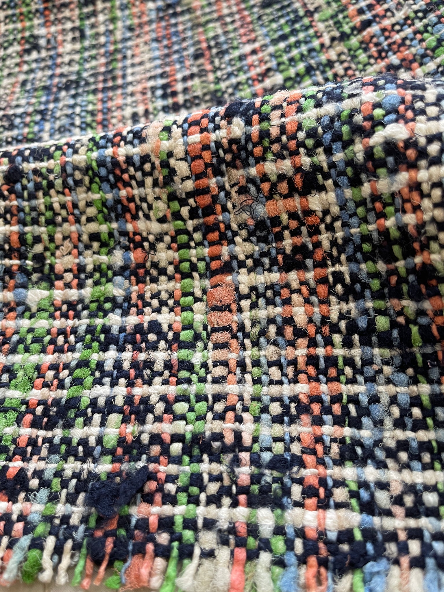 Heavy Silk Matka tweed in Black/Blues/Greens/Peach and Off-White.