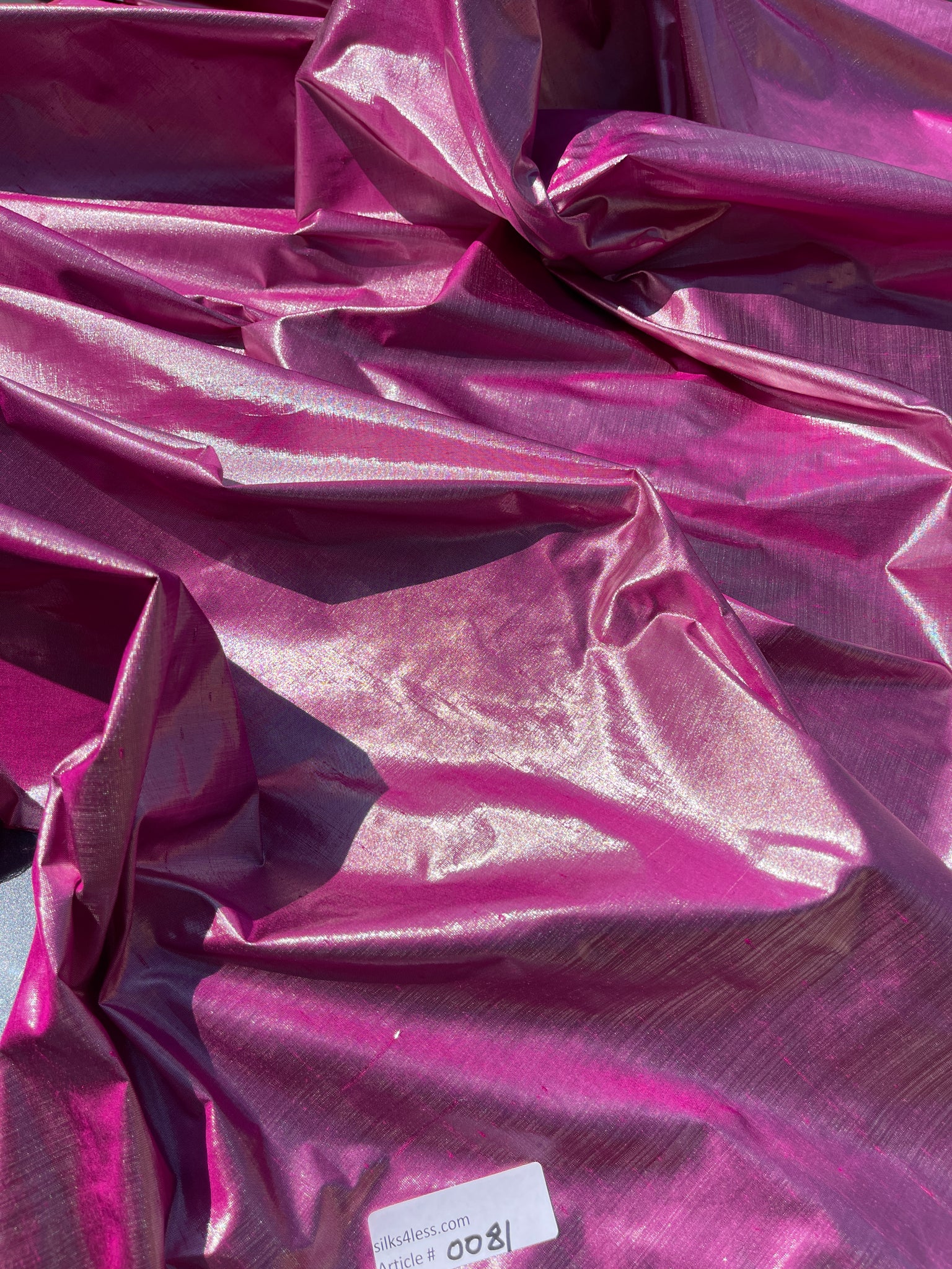 Lustrous lurex silk dupioni is a beautifully structured fabric with Fuchsia silk dupioni yarn in the weft and lurex Silver yarn in the warp, silk blended fabric with good weight.