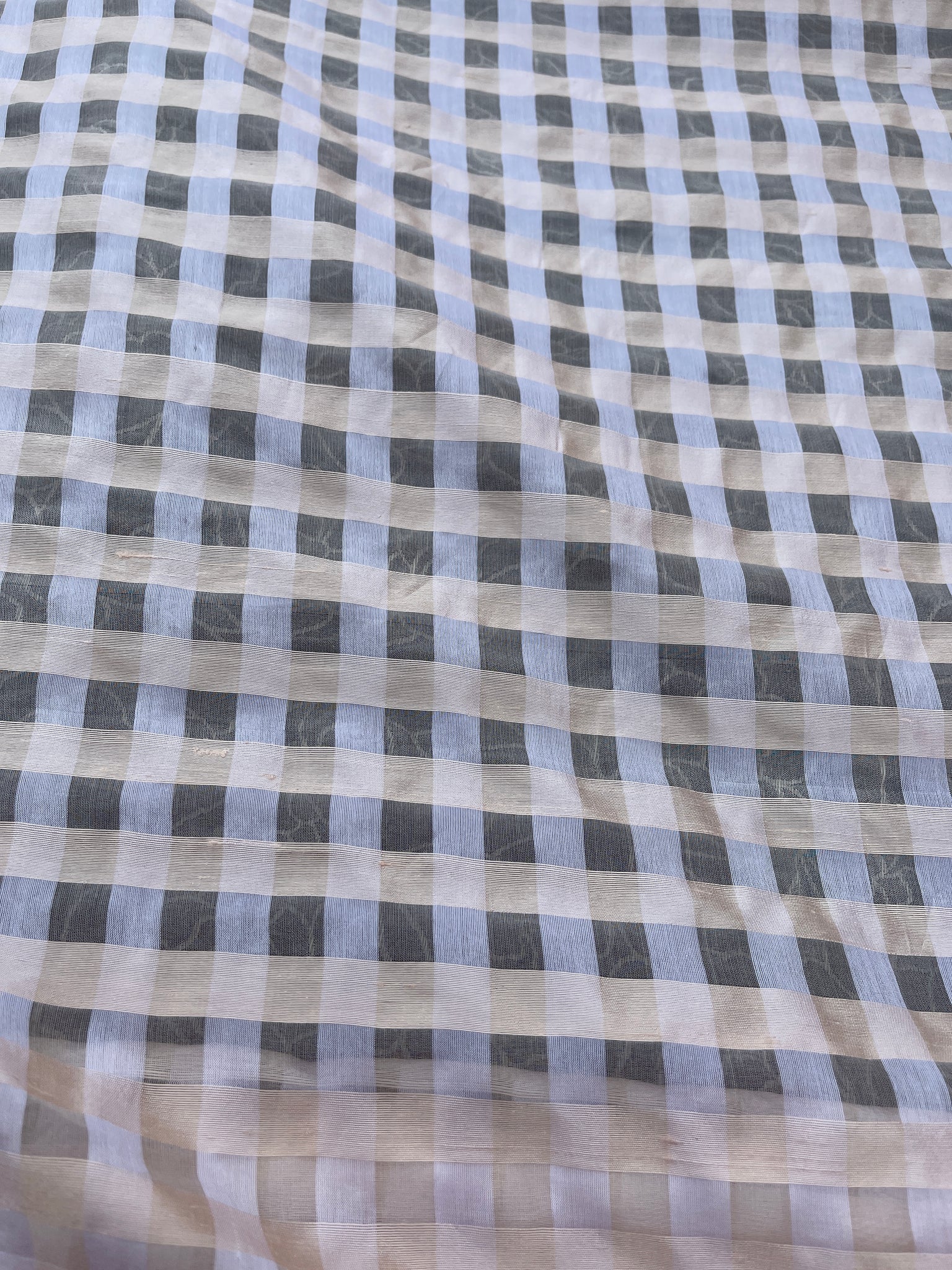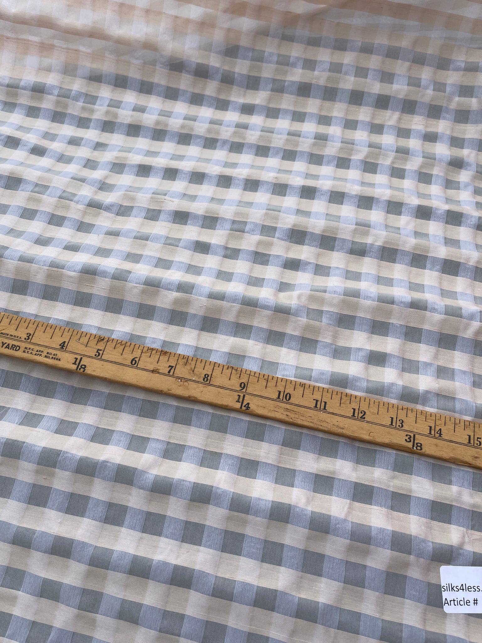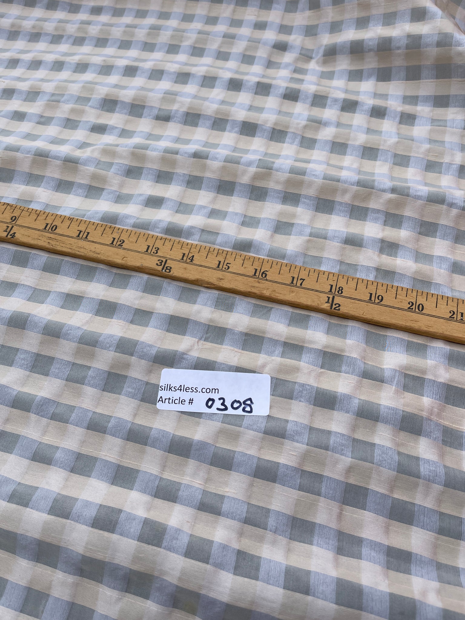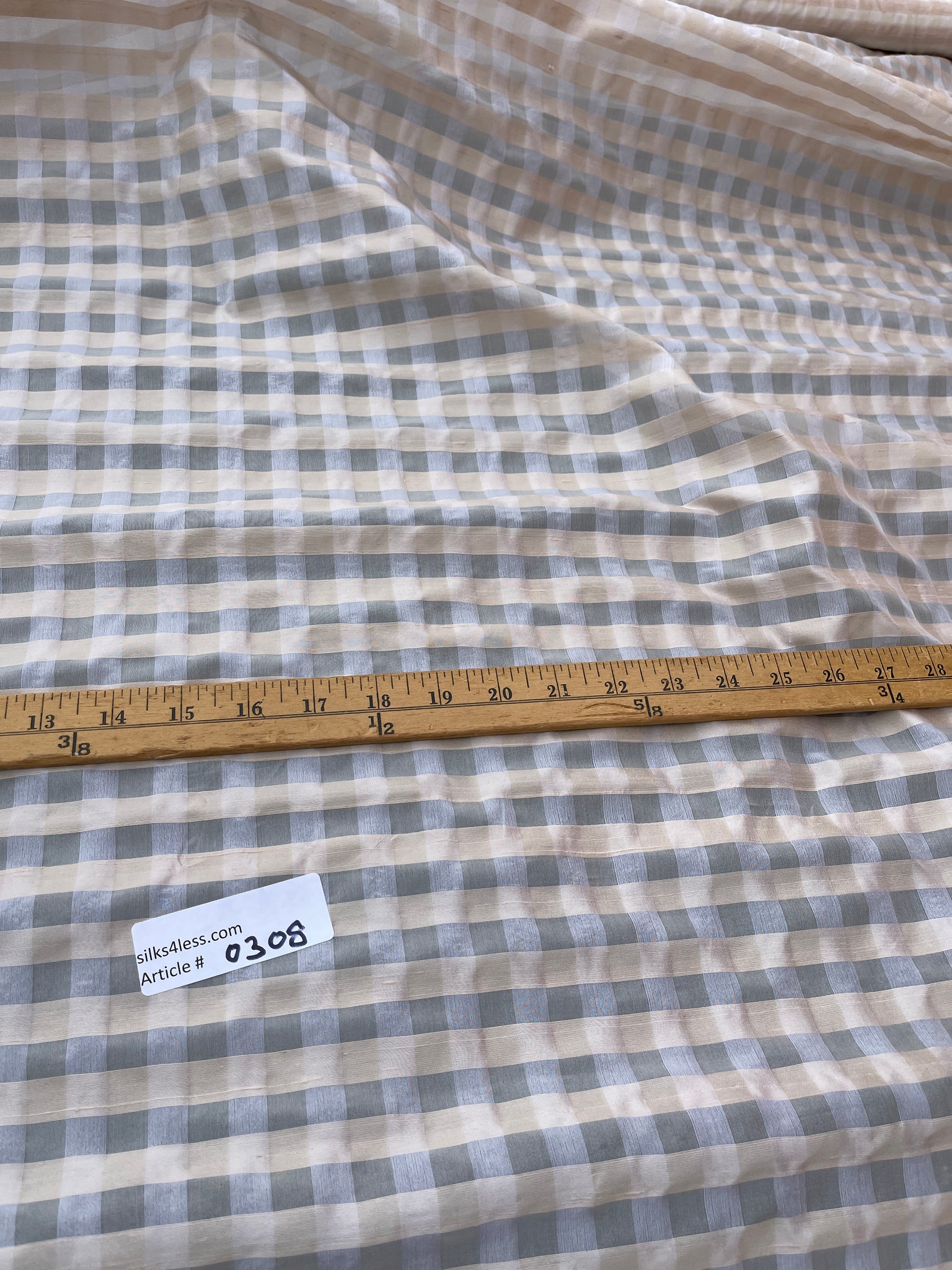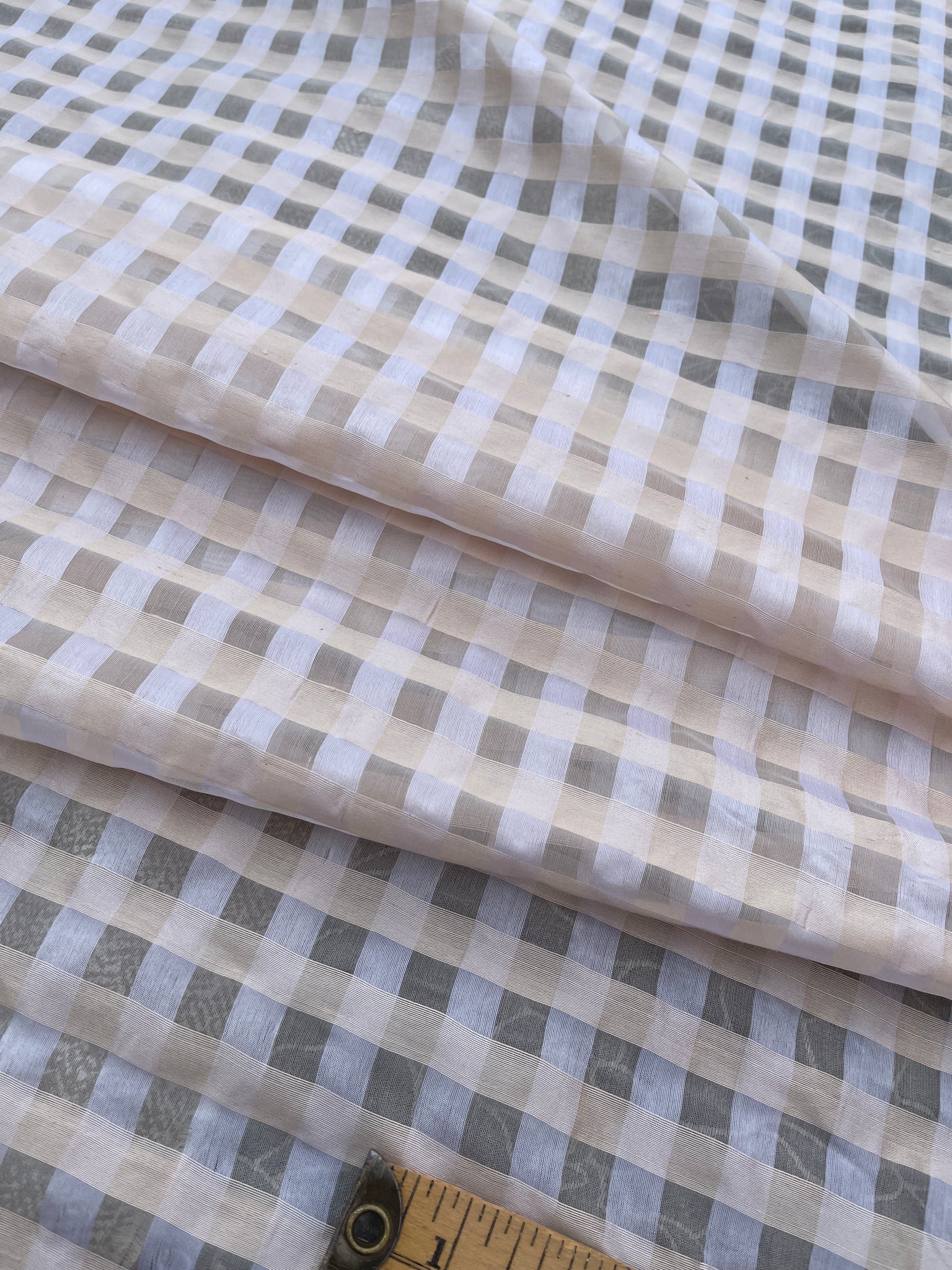 Designer quality unique silk organza sheer plaid, Dupioni silk Peach yarns in the weft and silk Organza Off White yarns in the warp, White/Peach combination, ½” check.