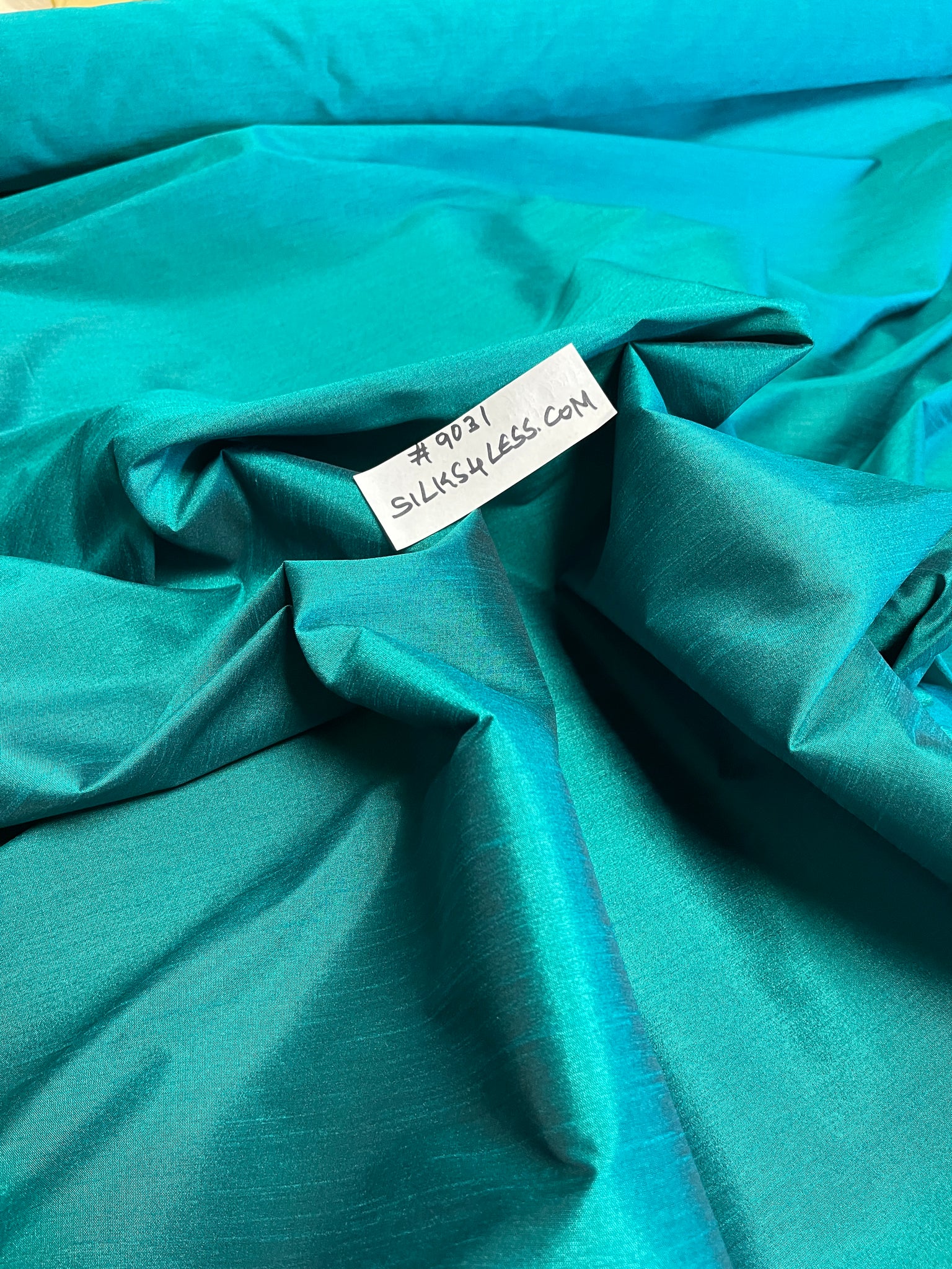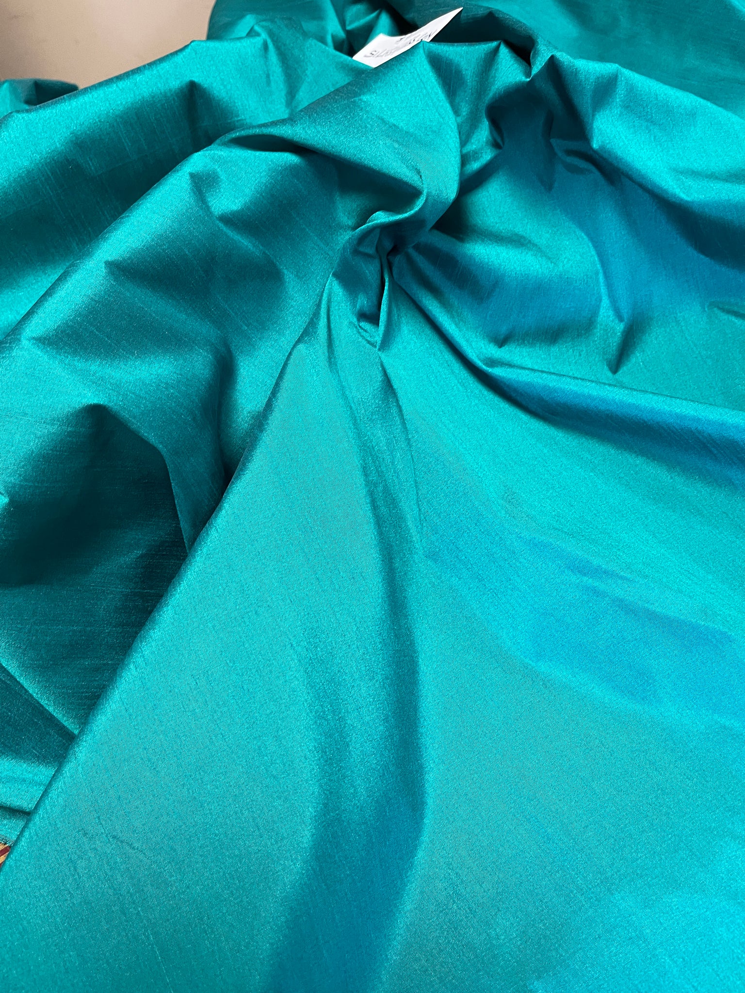 Fabulous quality 100% Polyester Iridescent Silk Dupioni, Emerald. Black yarns in the warp and Emerald Green in the weft.