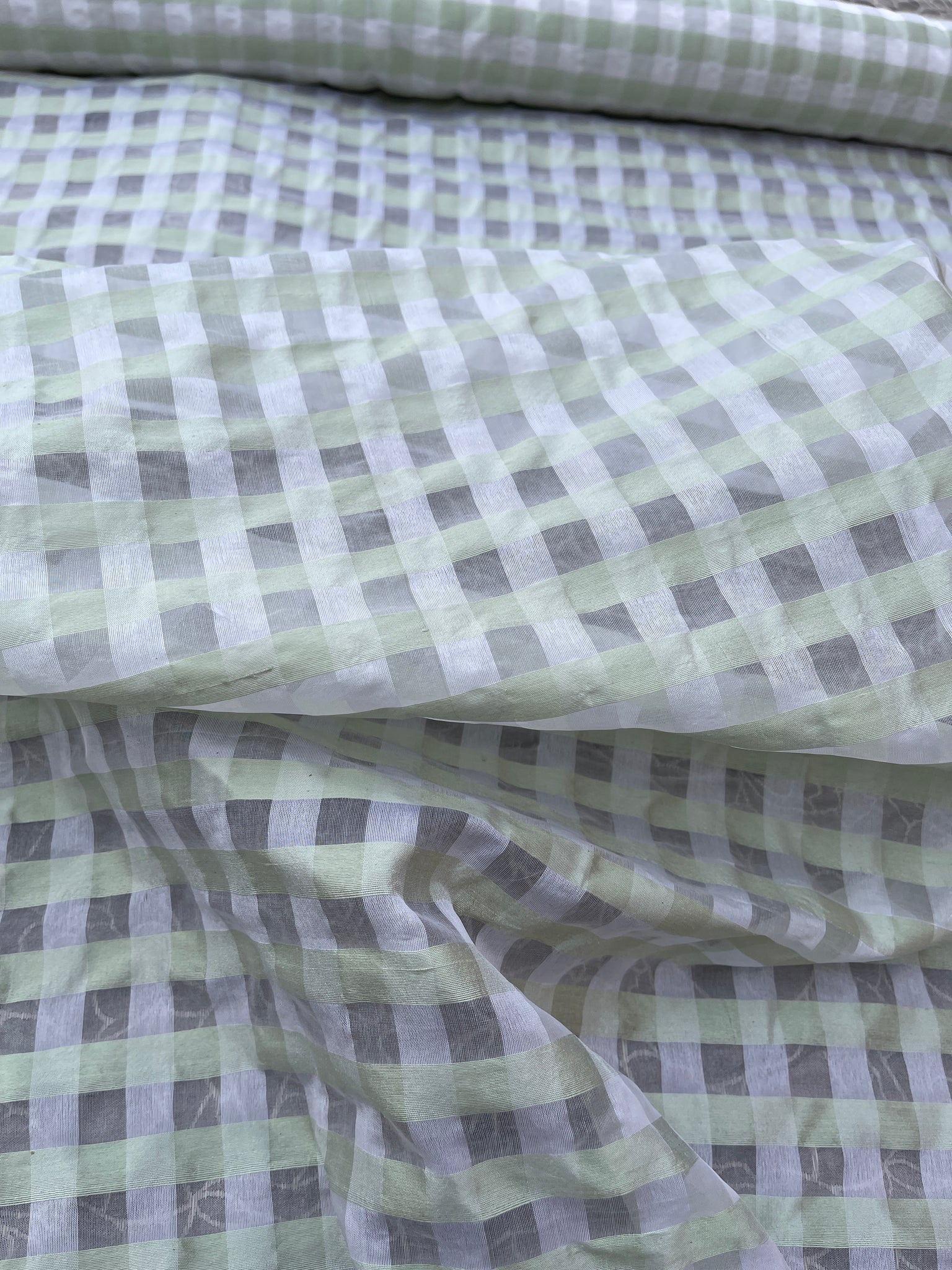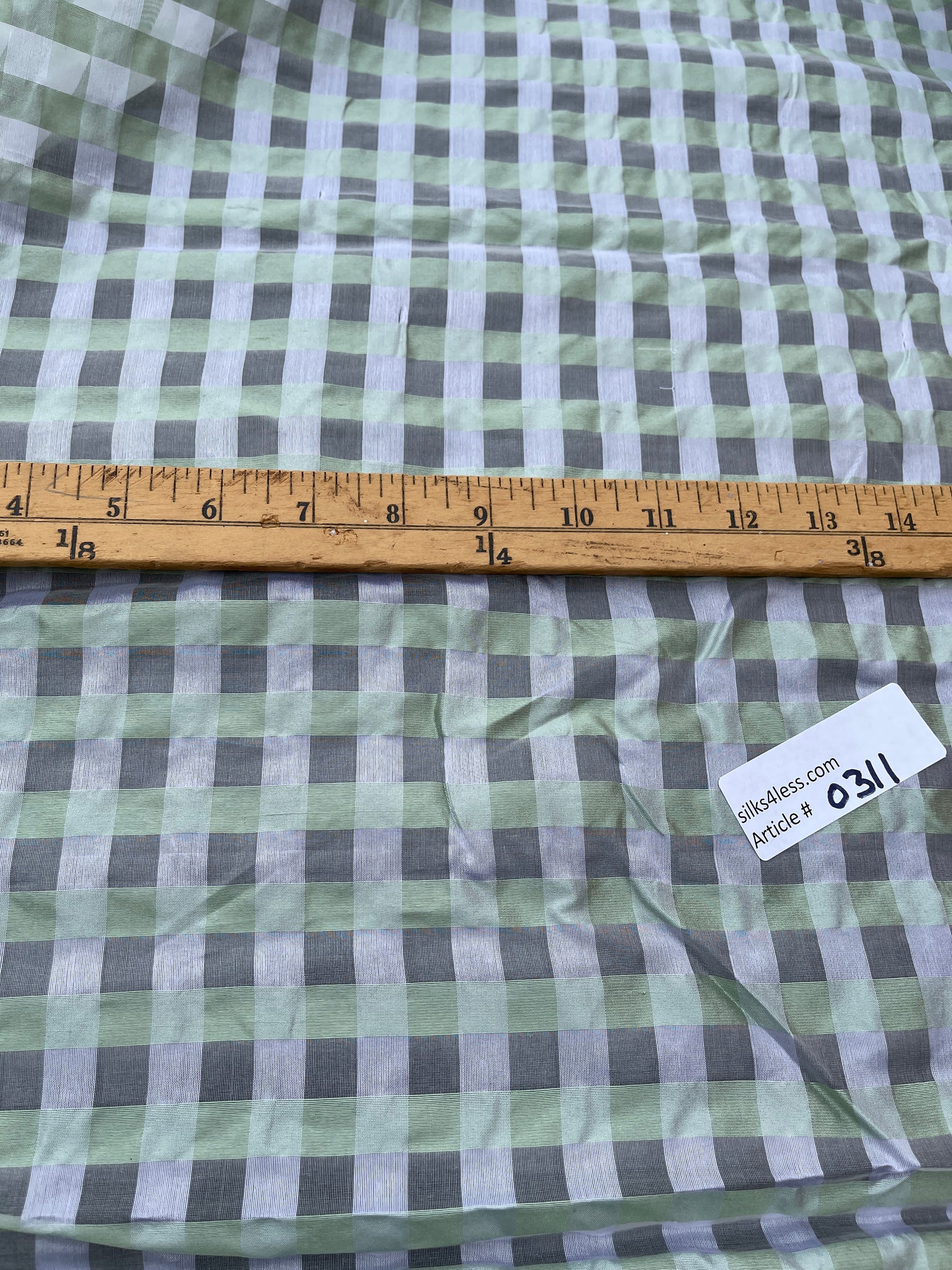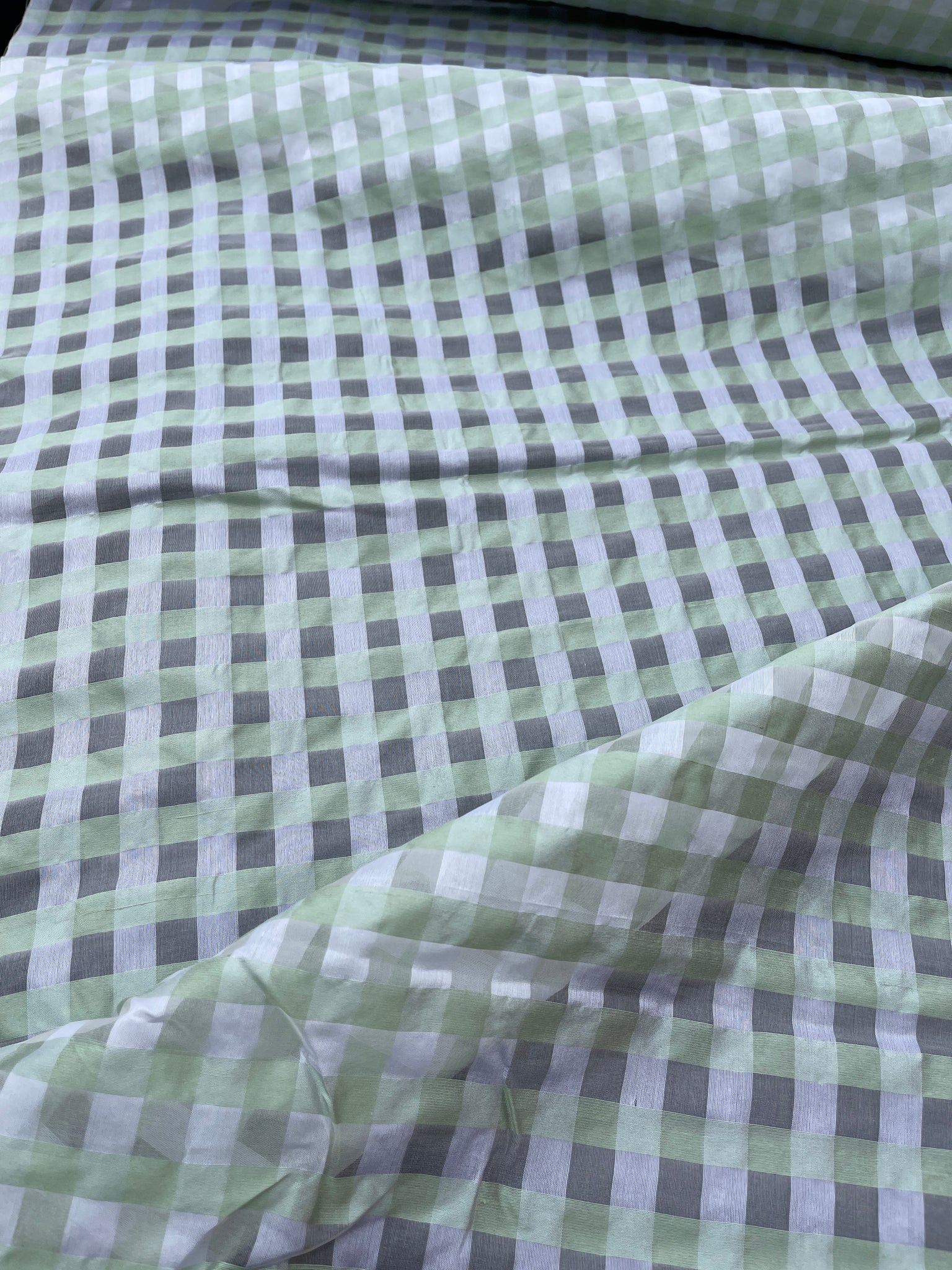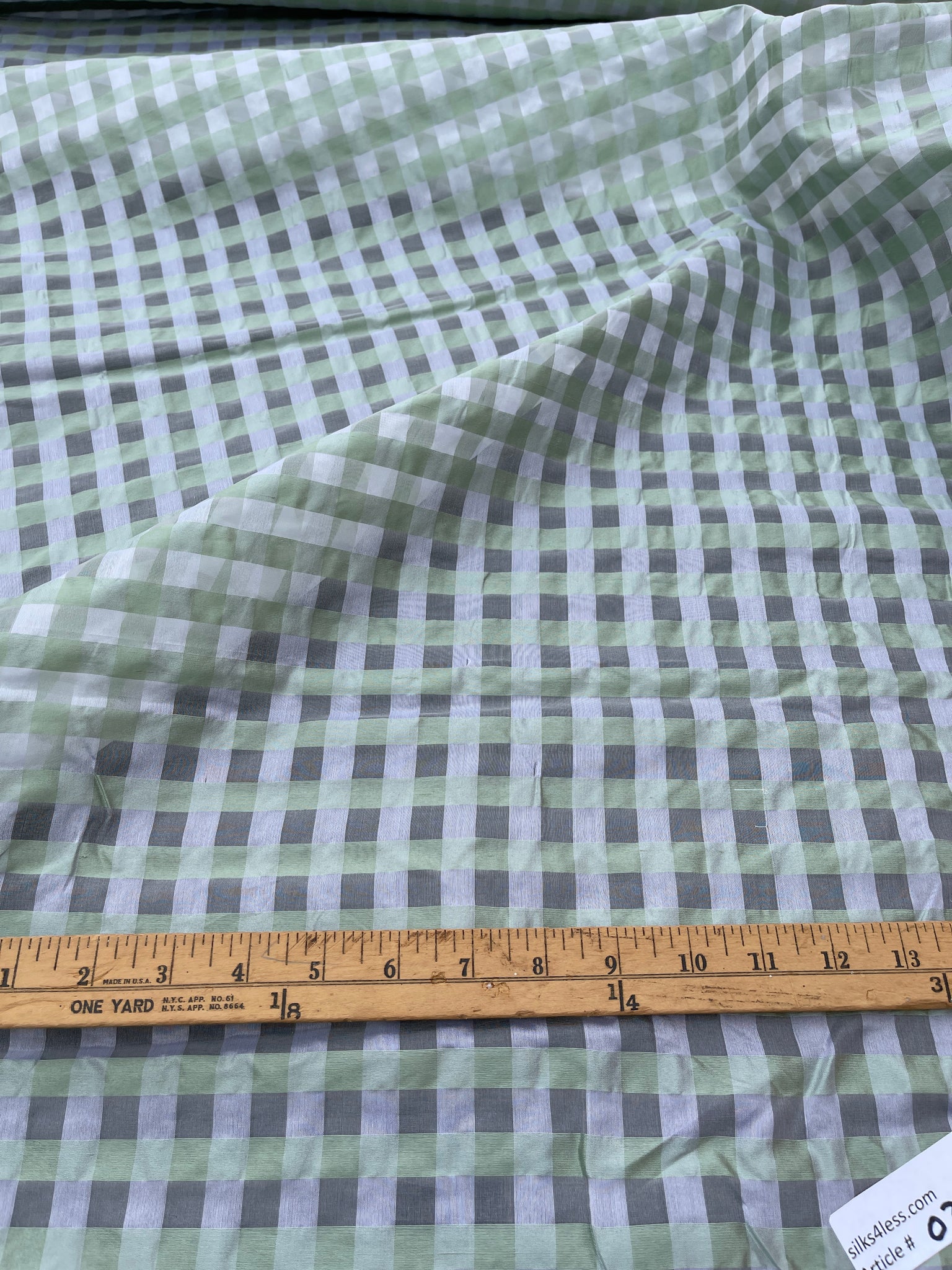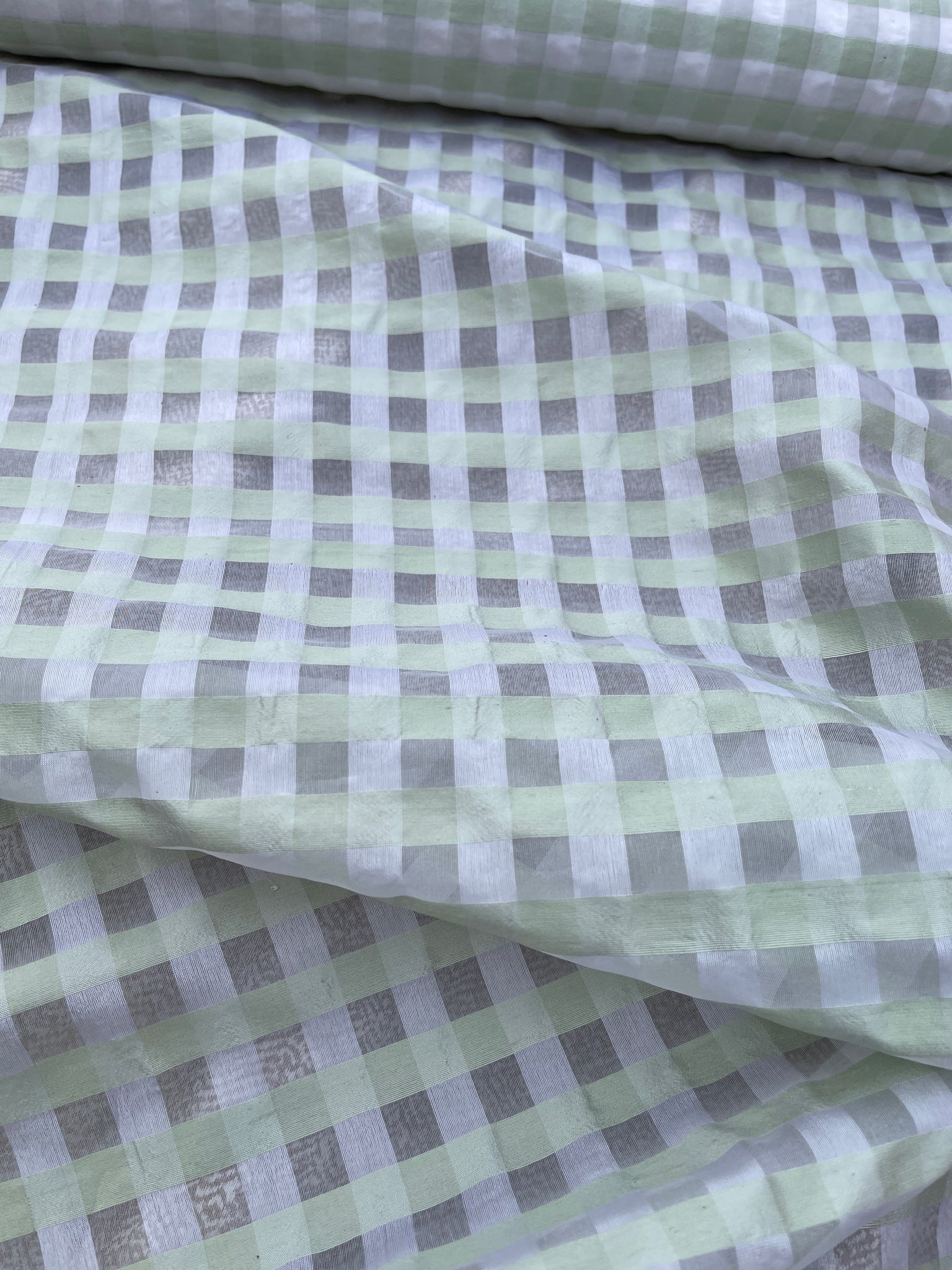 Designer quality unique silk organza sheer plaid, Dupioni silk light Green yarns in the weft and silk Organza White yarns in the warp, White/light Green combination, ½” check.
