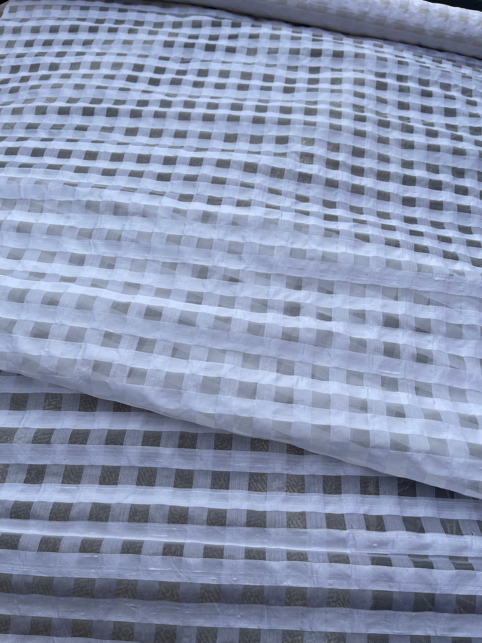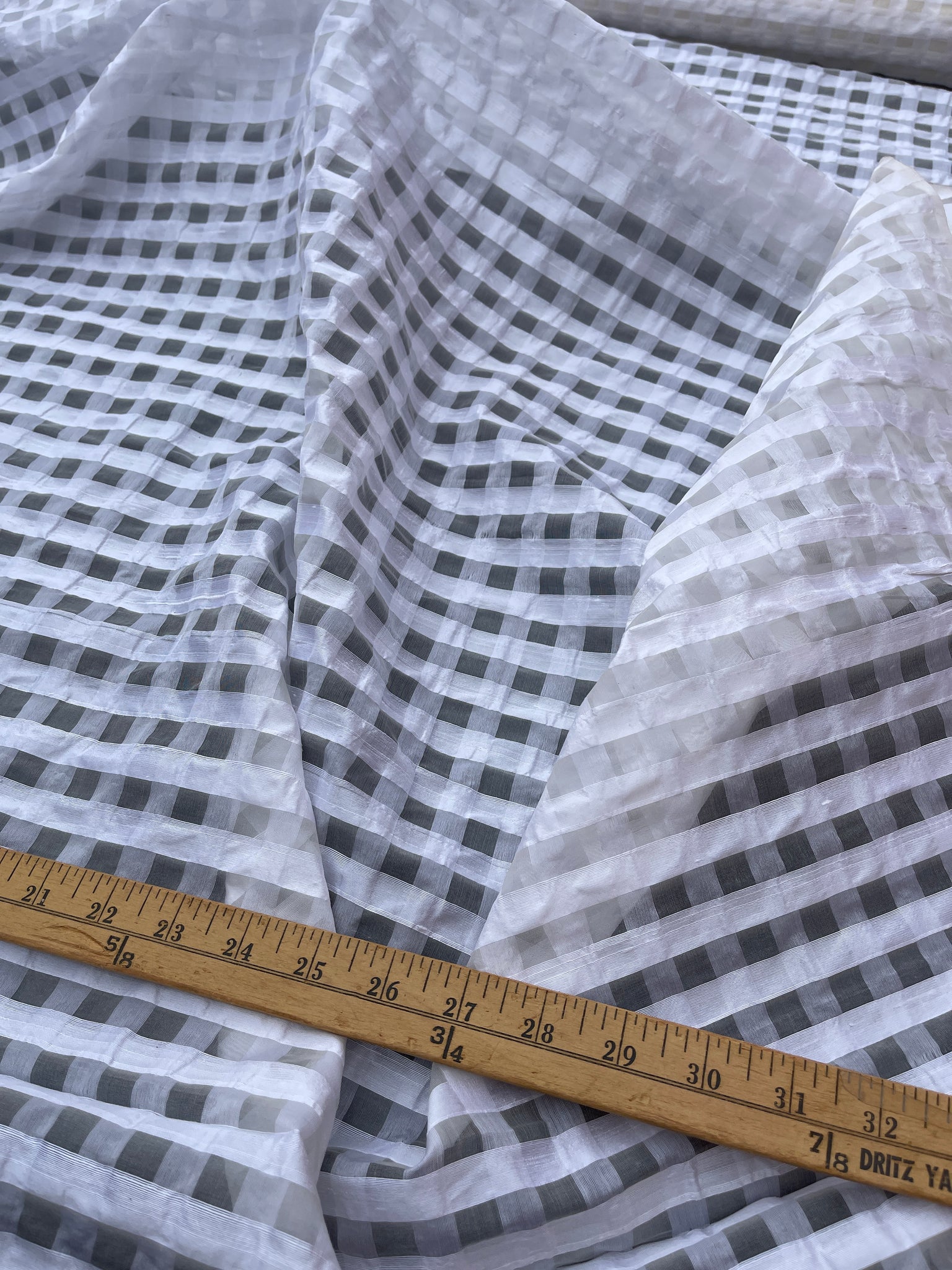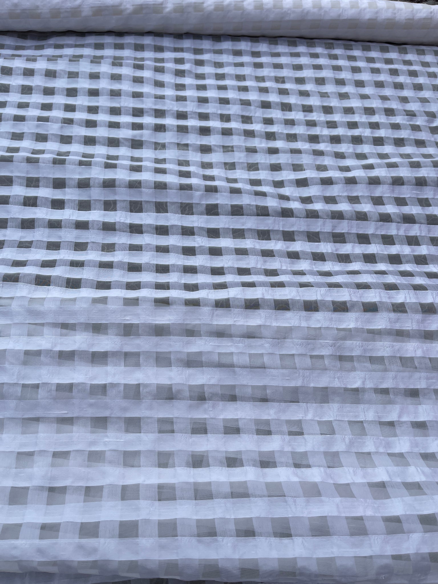 Designer quality unique silk organza sheer plaid, Dupioni silk White yarns in the weft and silk Organza White yarns in the warp, White/White combination, ½” check.