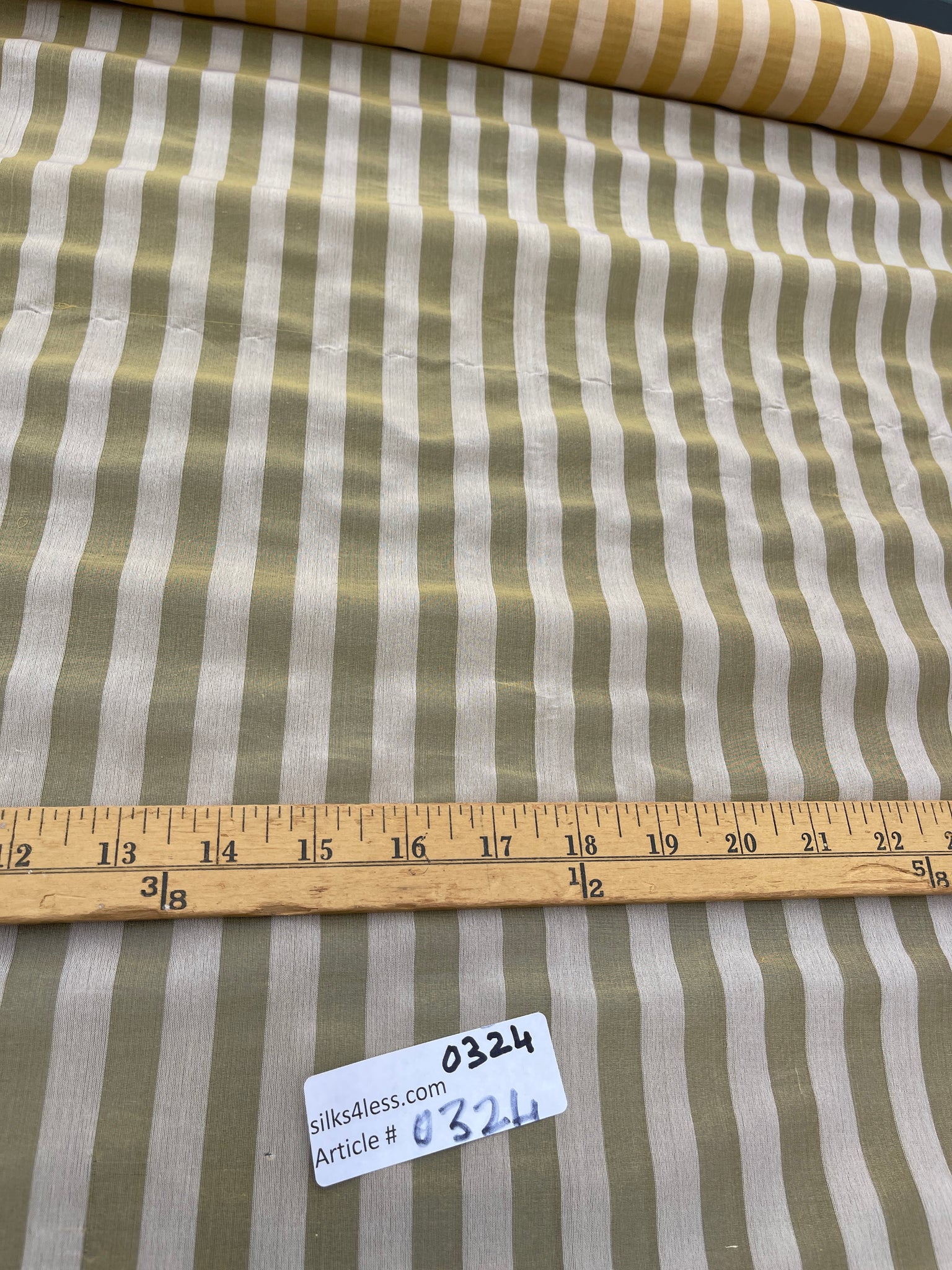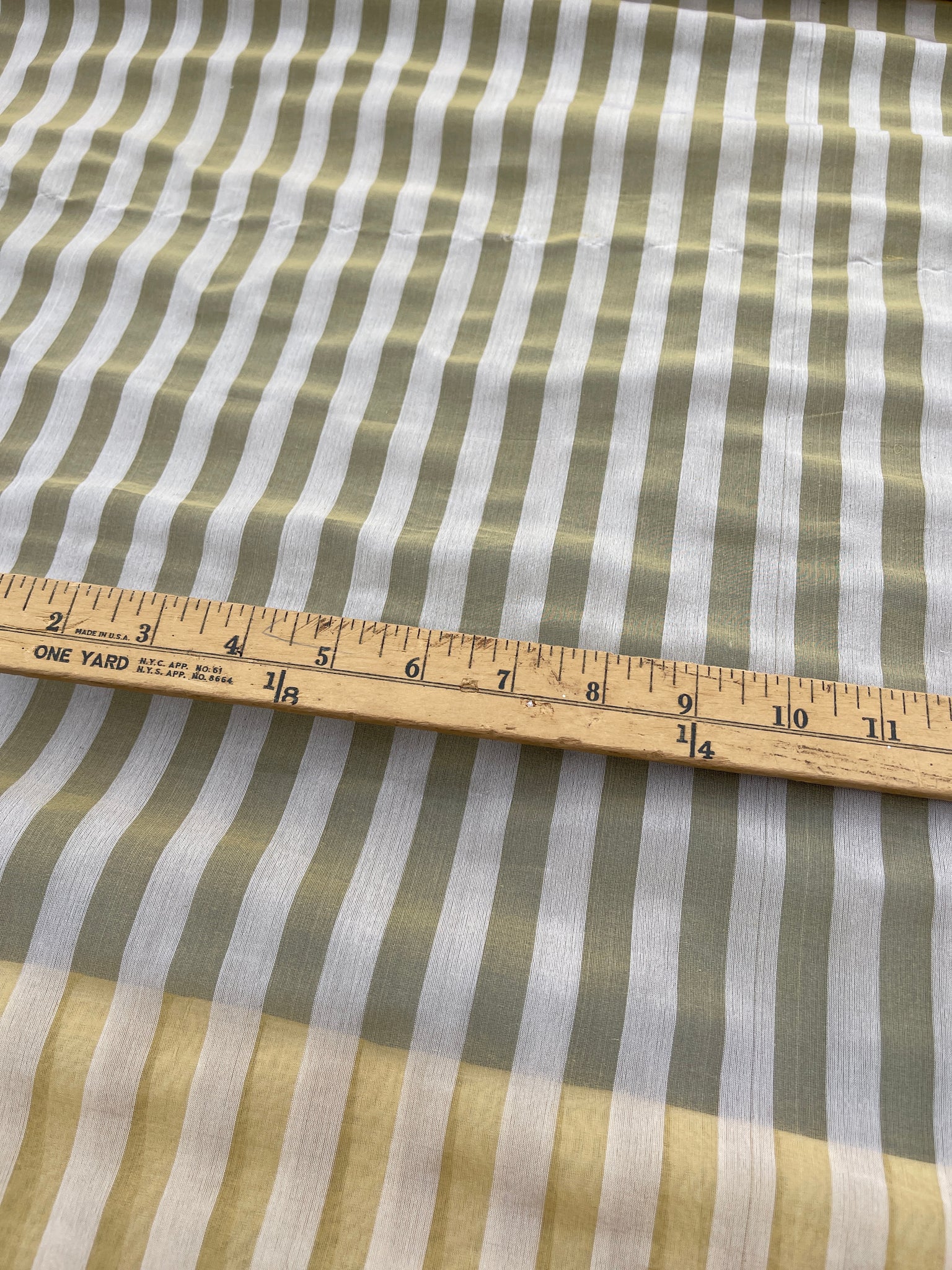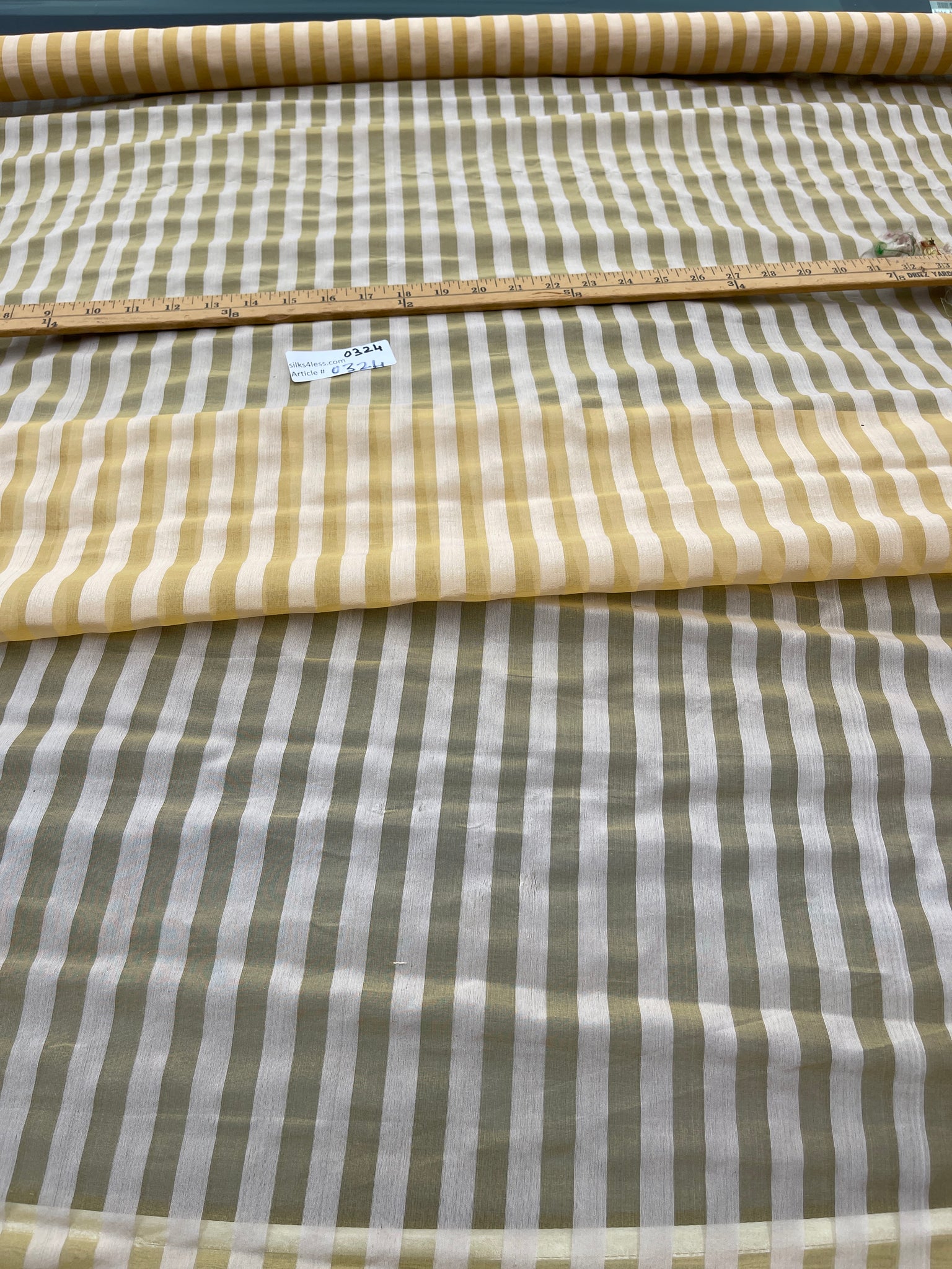 Designer quality unique silk organza/Spun silk sheer warp stripes in Off White/Gold approximate stripes ½” and repeat 1”. Stripes run up the roll.