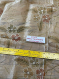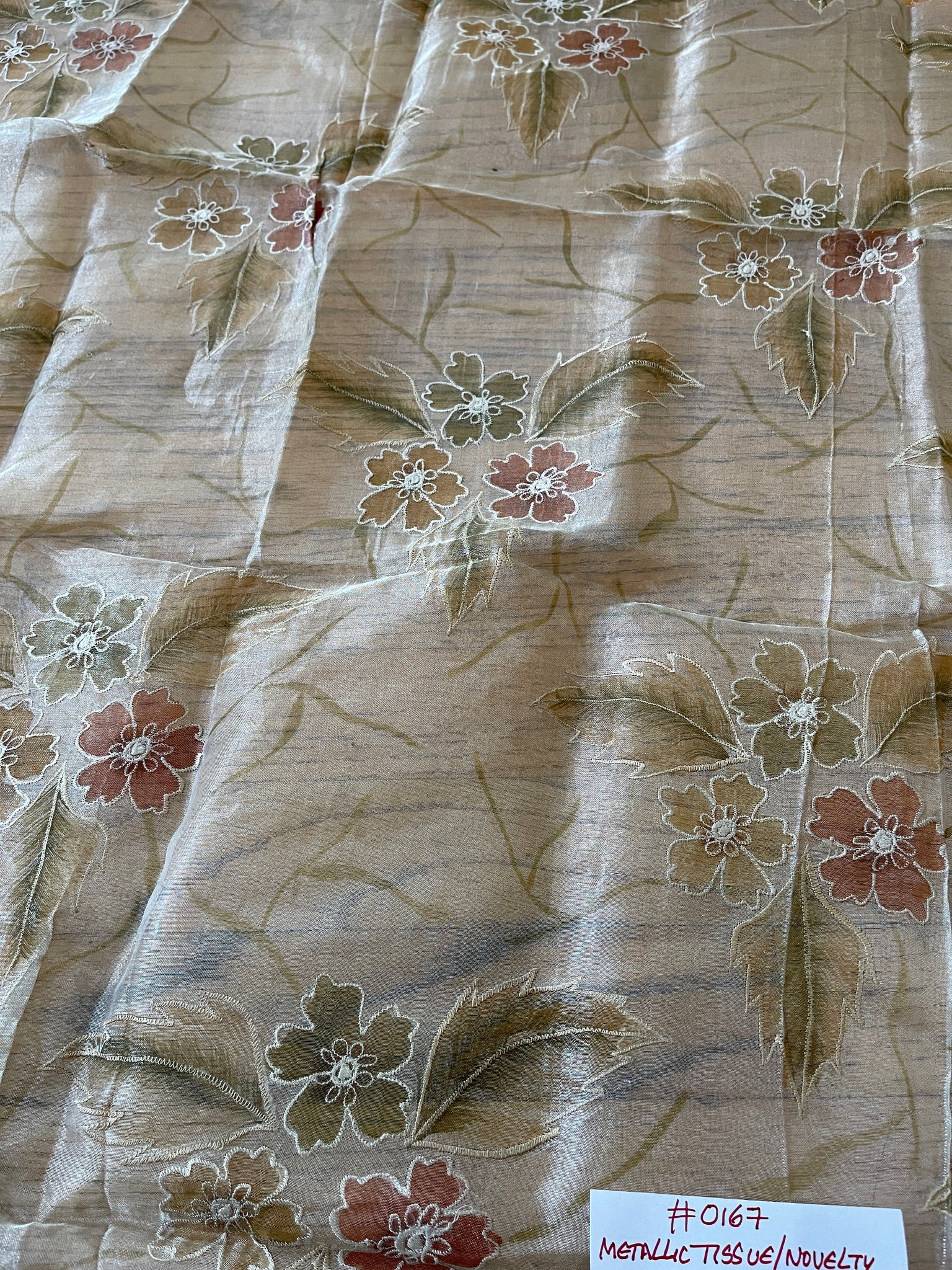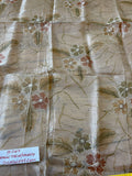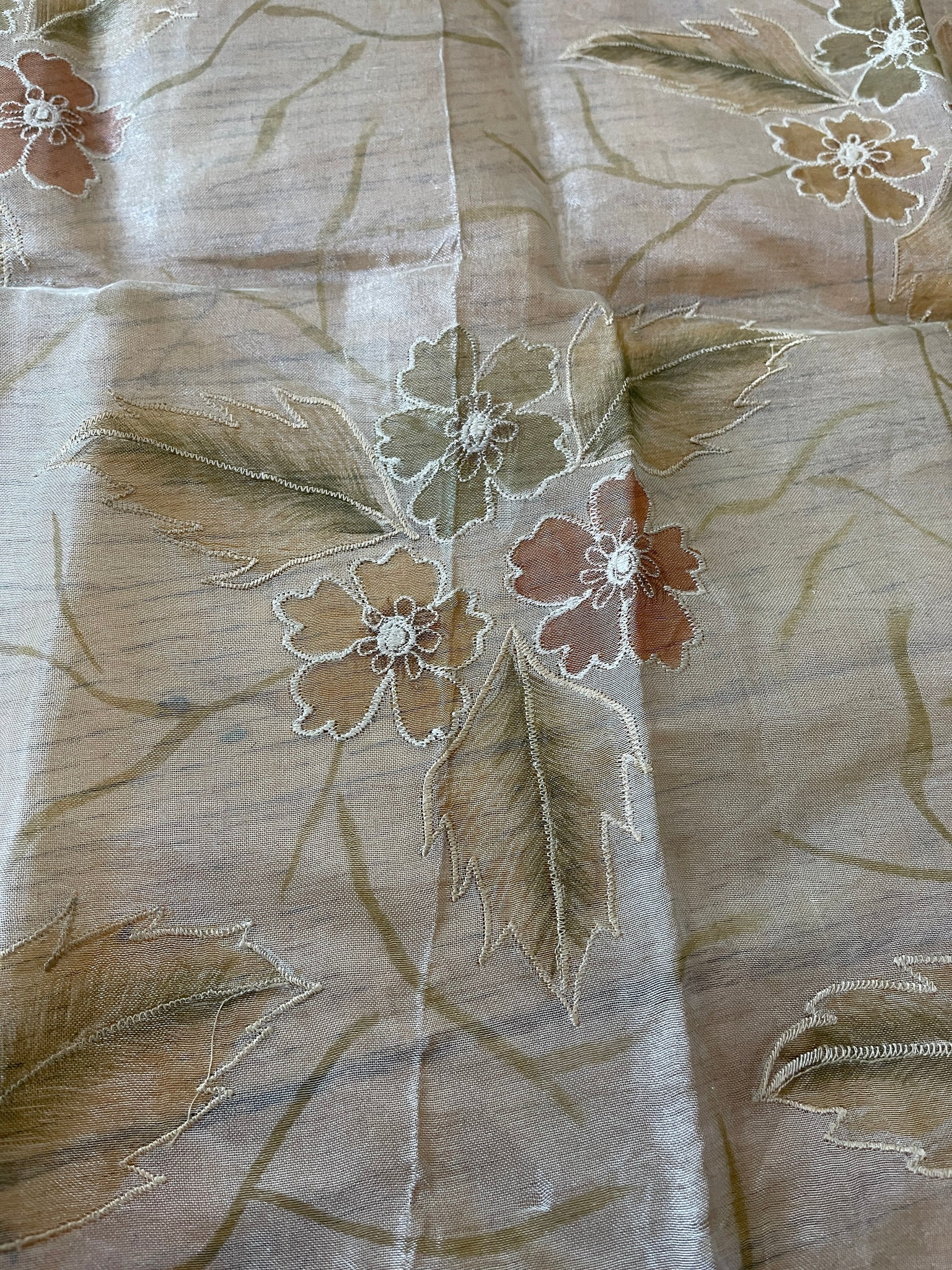 As beautiful as the picture. Silk tissue fabrics are known for their luster, fine finish and transparent look. This fine hand painted floral design / embroidered silk sheer fabric is woven with White/Gold combination base. Gorgeous colors Brick Red, Greens, Olive shades hand painted and embroidered.